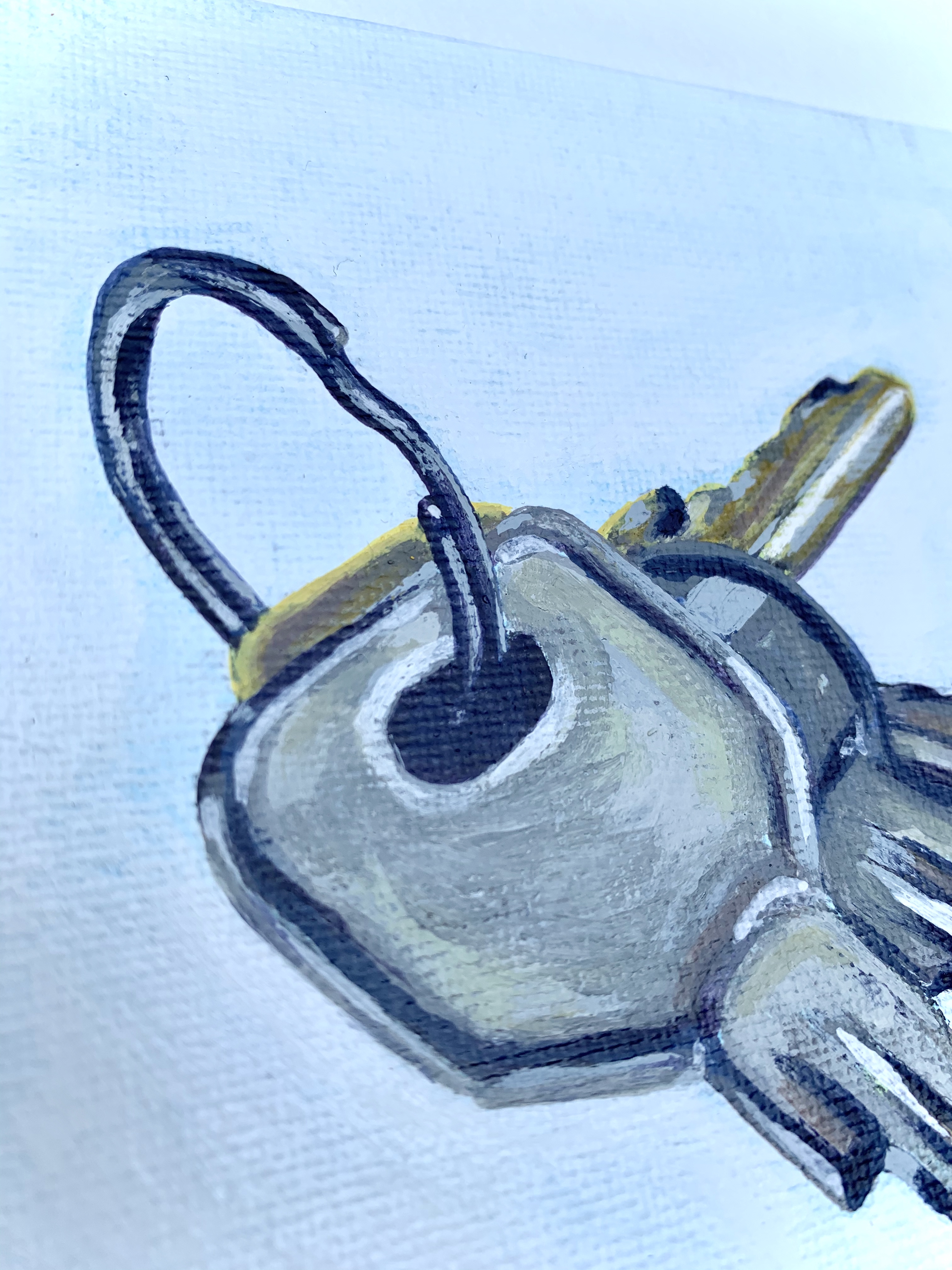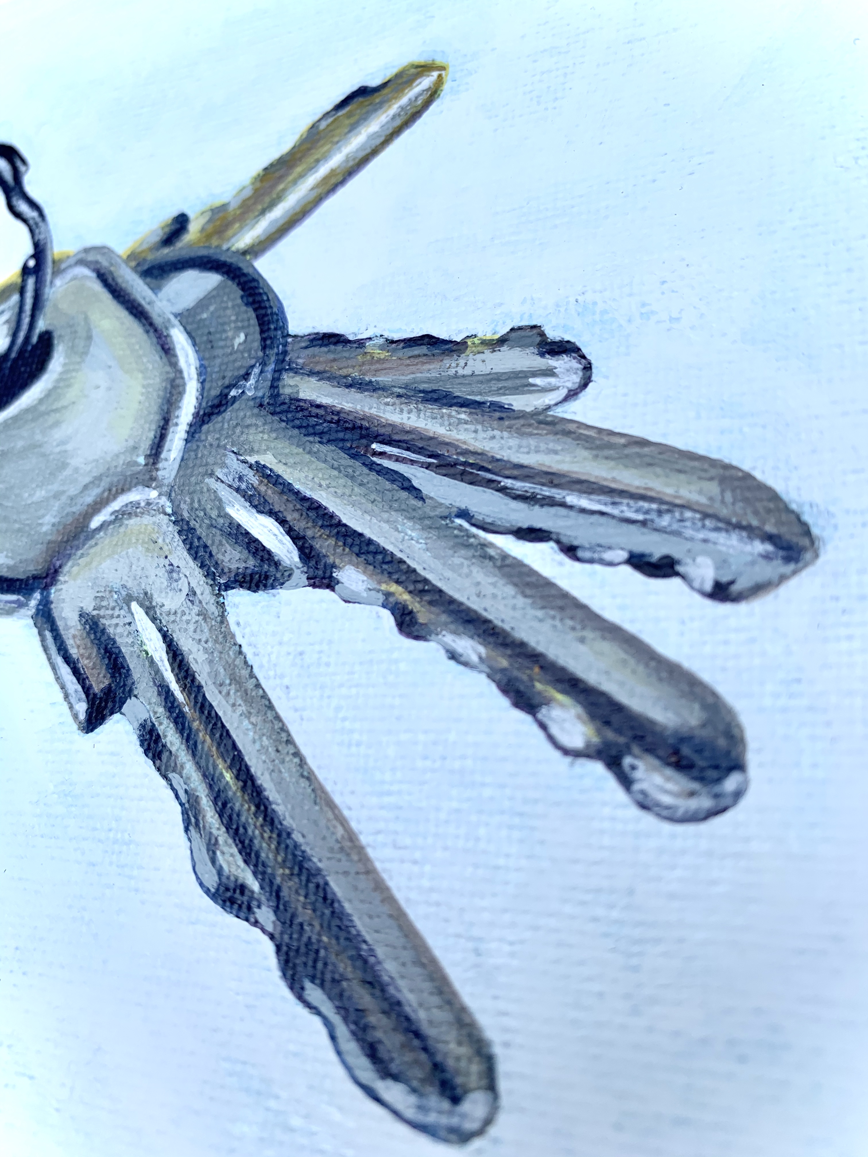 March 18, 2022 – An 8″ x 8″ acrylic painting of keys. The objective was to paint something small yet complex. The keys have harsh highlights and shadows while the jagged cuts and bittings at the bottom of the key create visual texture. The background of this painting is not a solid white there are hints of the blue-toned canvas.