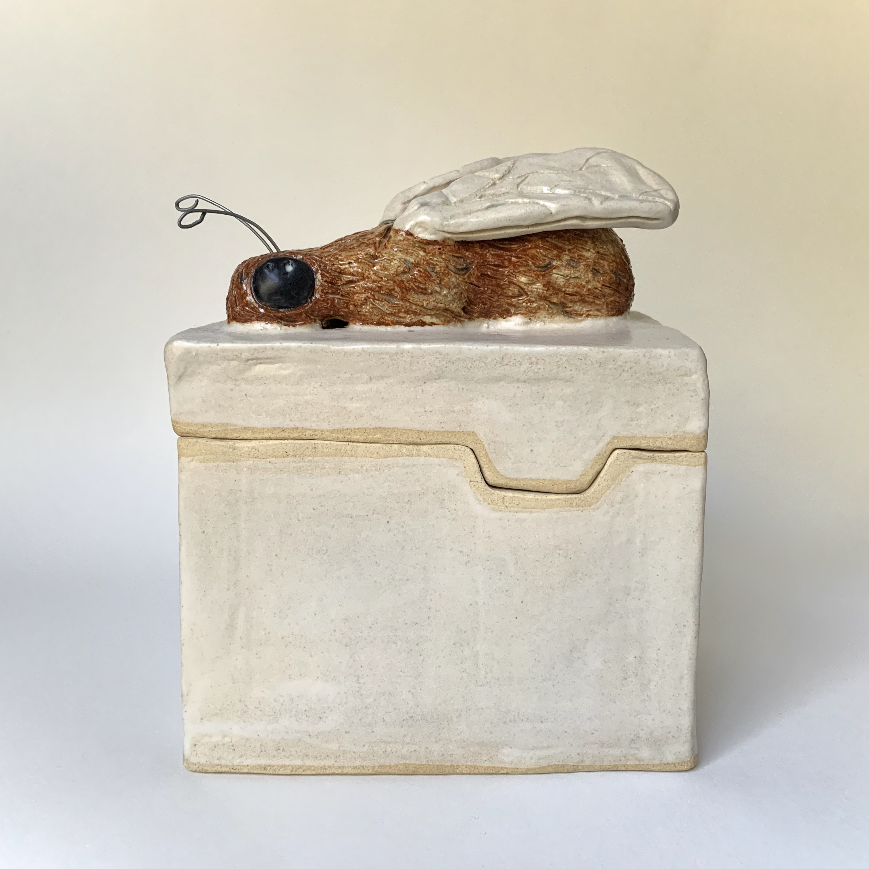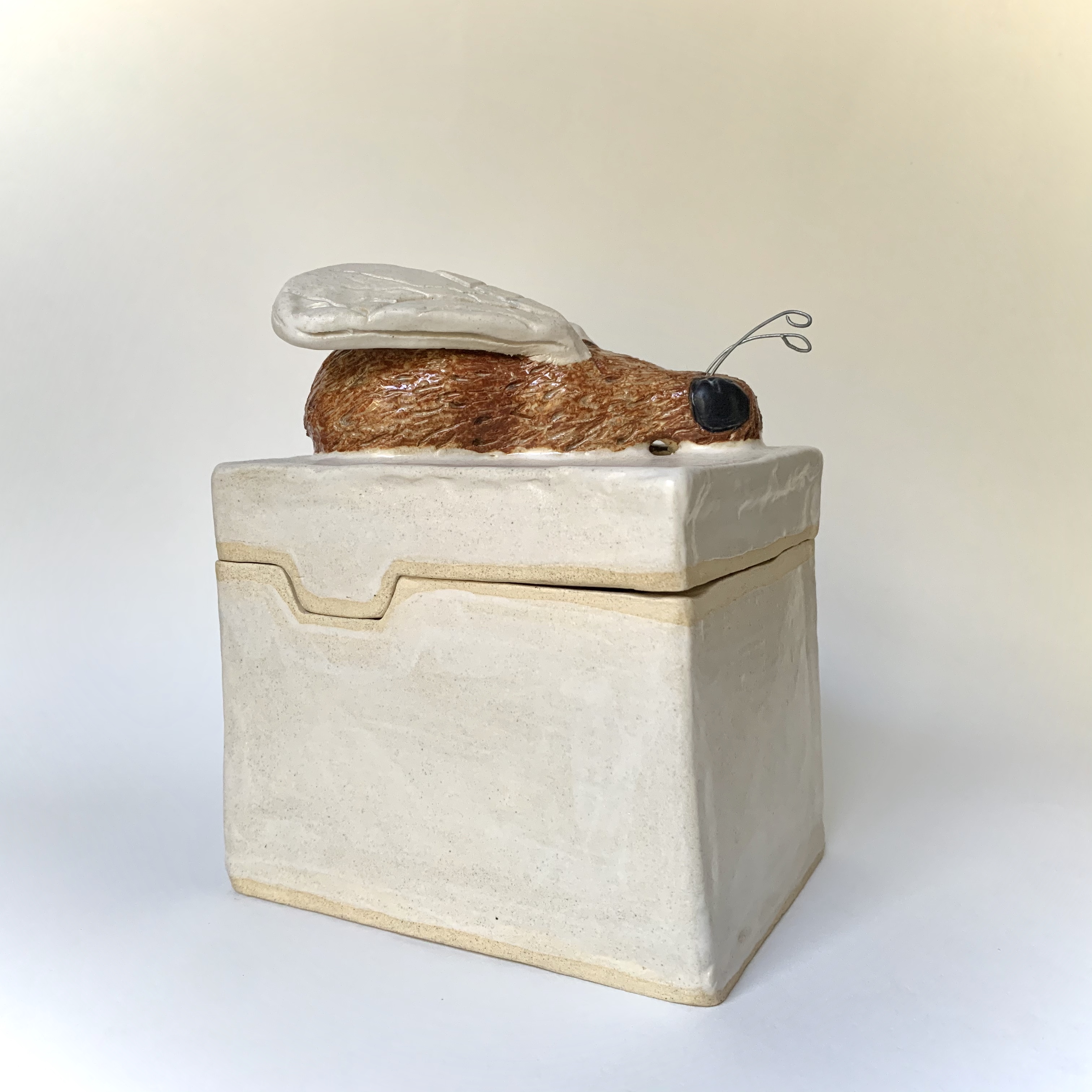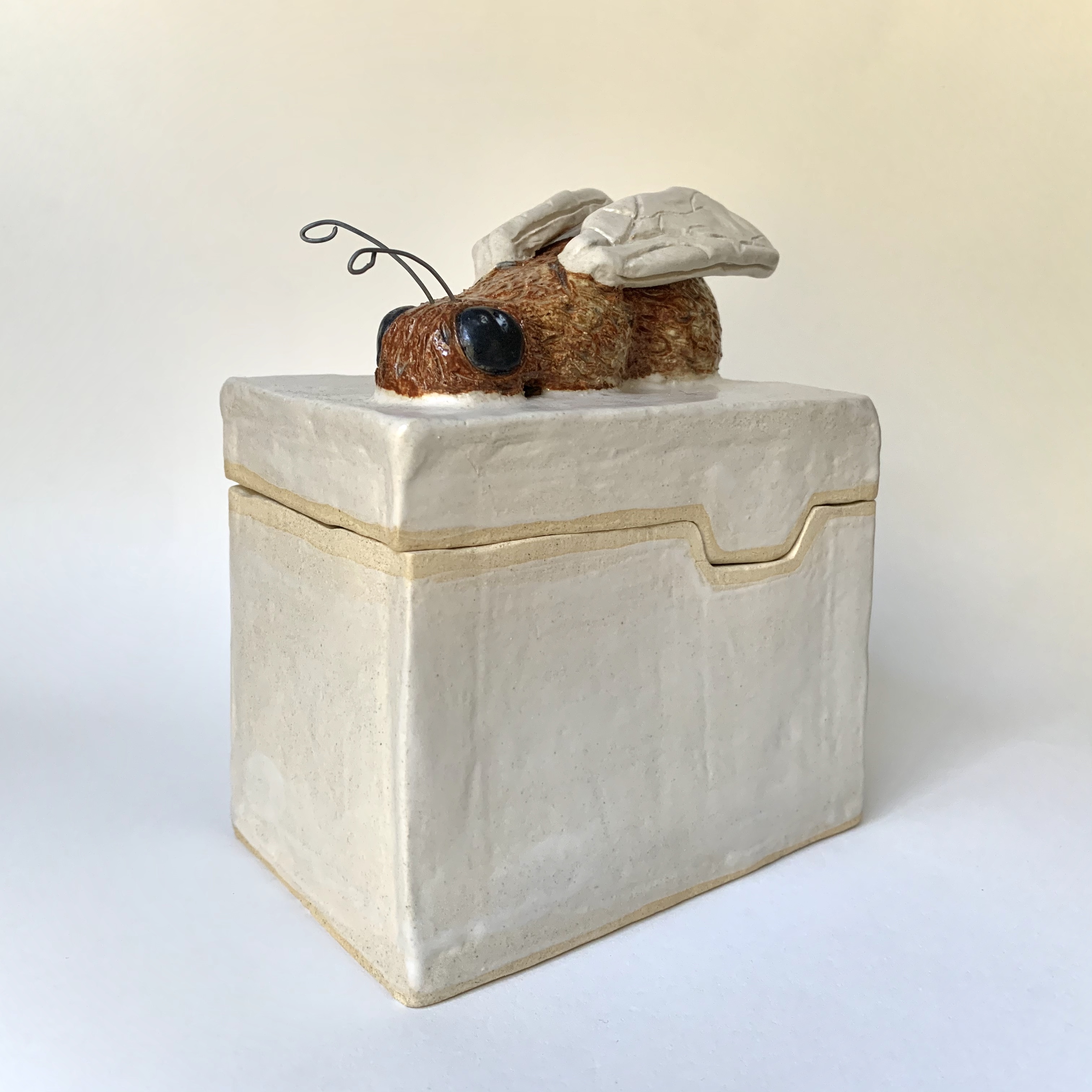 March 14, 2023 – A 5″ x 3 1/2″ x 6 3/4″ clay bumblebee box that is functional. The objective was to choose an animal or insect that I liked and place it somewhere on the box. The bee sits on the top because of how large it is. The lid line has a divot that replicates honeycomb.
