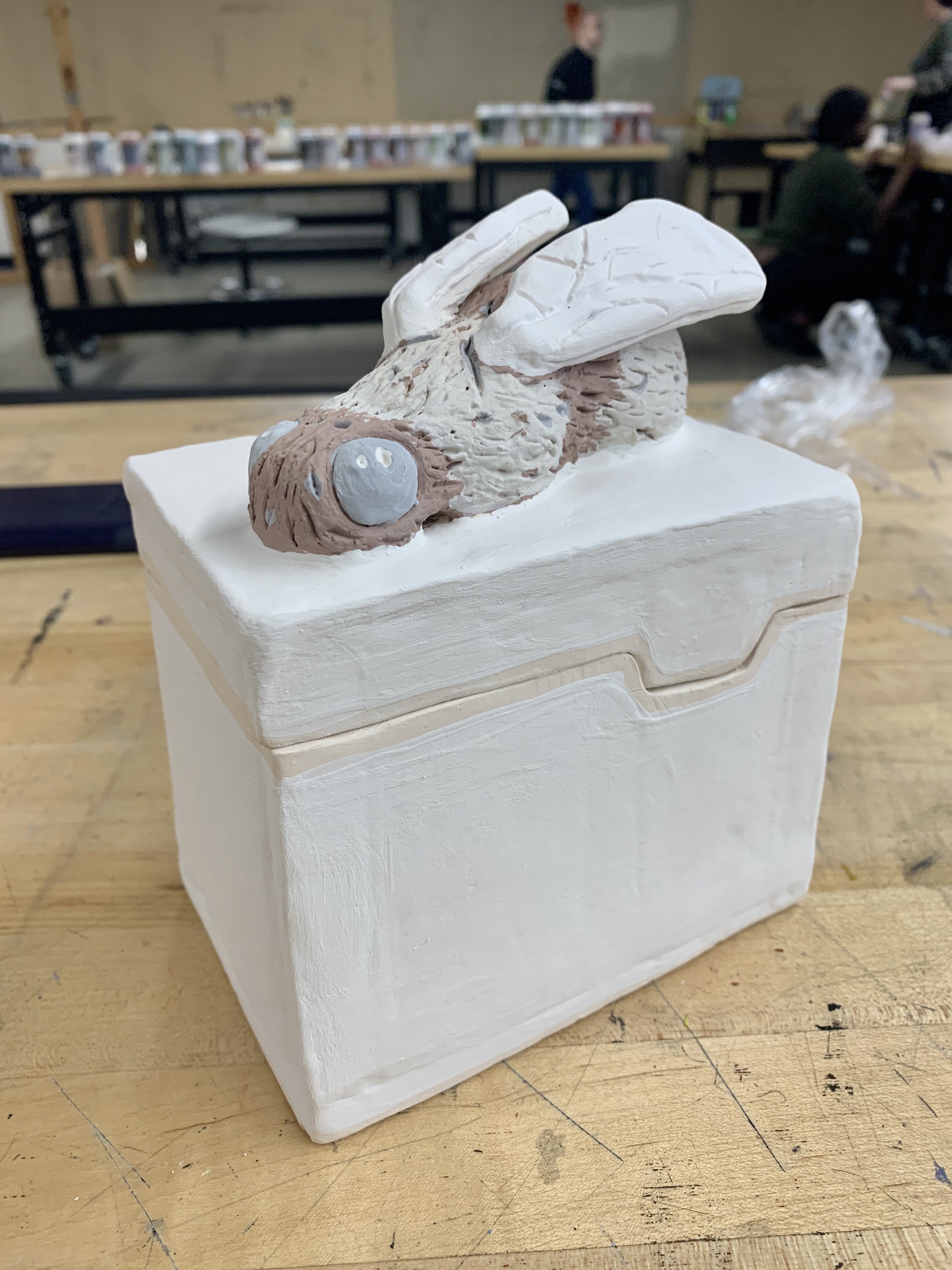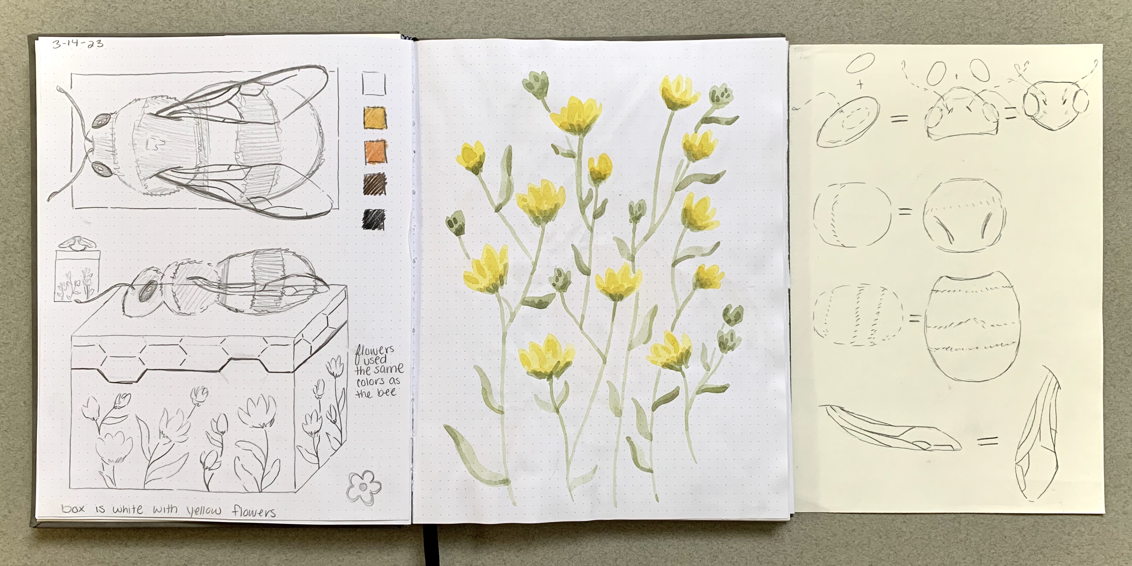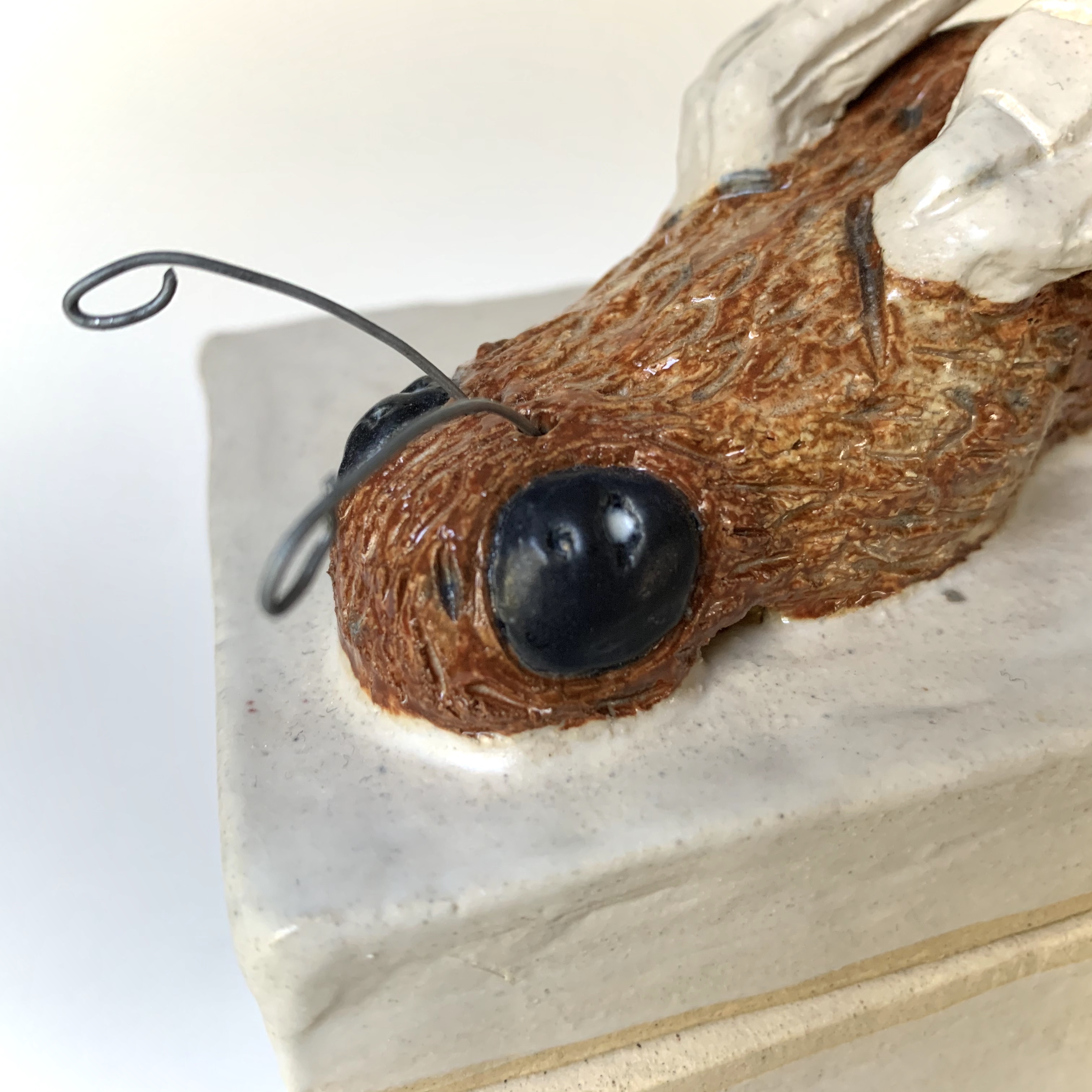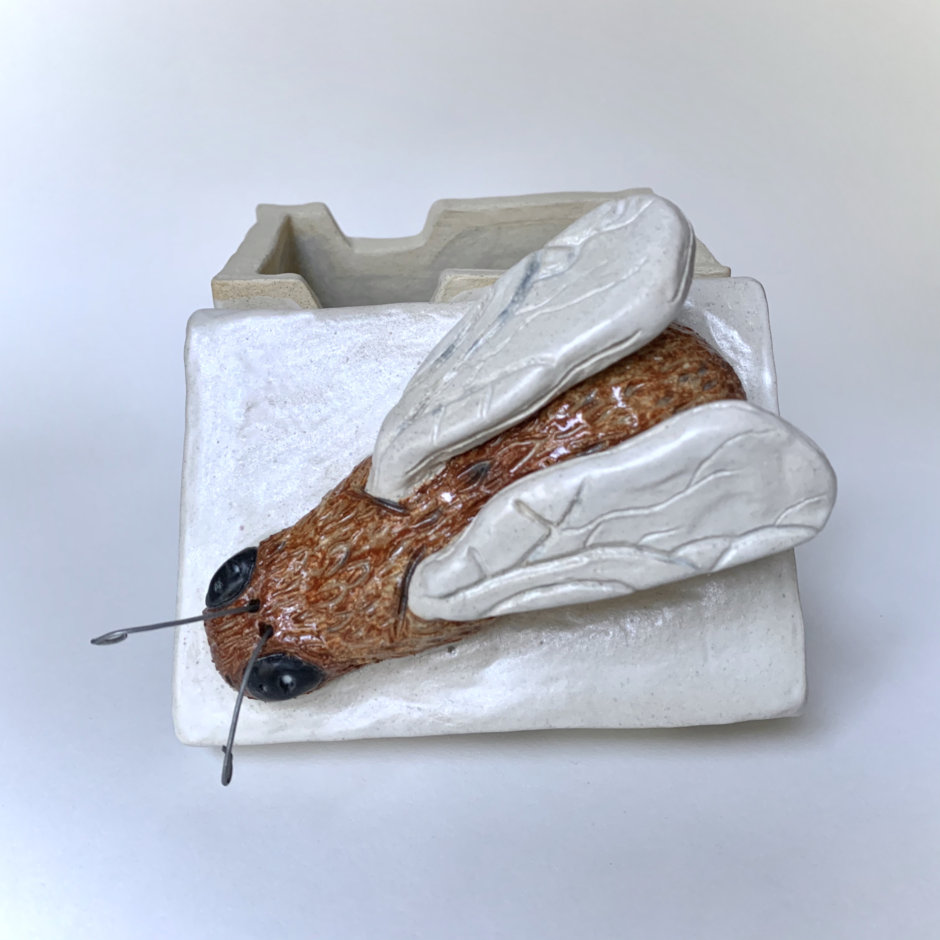 March 14, 2023 – A 5″ x 3 1/2″ x 6 3/4″ clay bumblebee box that is functional. The objective was to choose an animal or insect that I liked and place it somewhere on the box. The bee sits on the top because of how large it is. The lid line has a divot that replicates honeycomb.