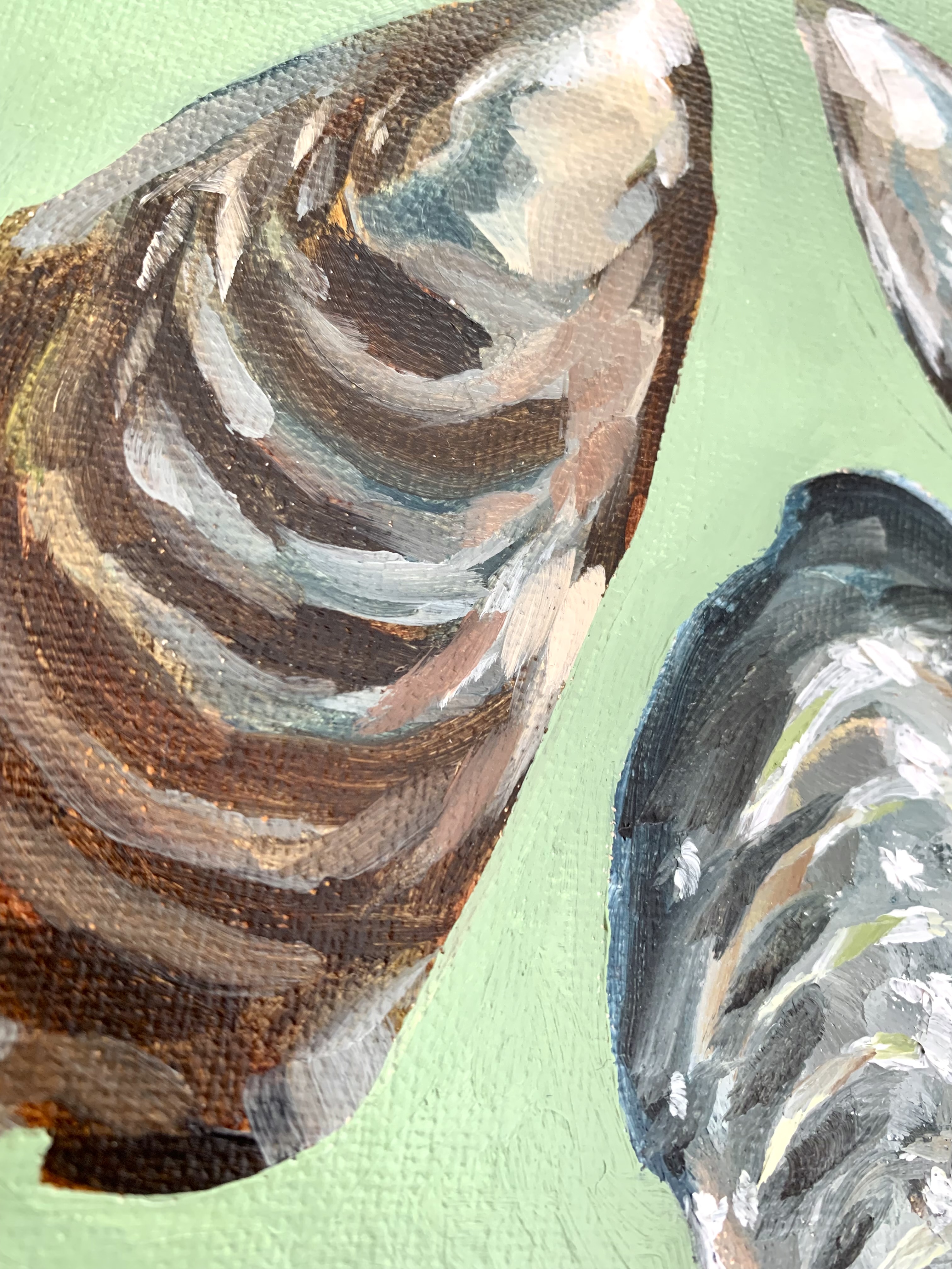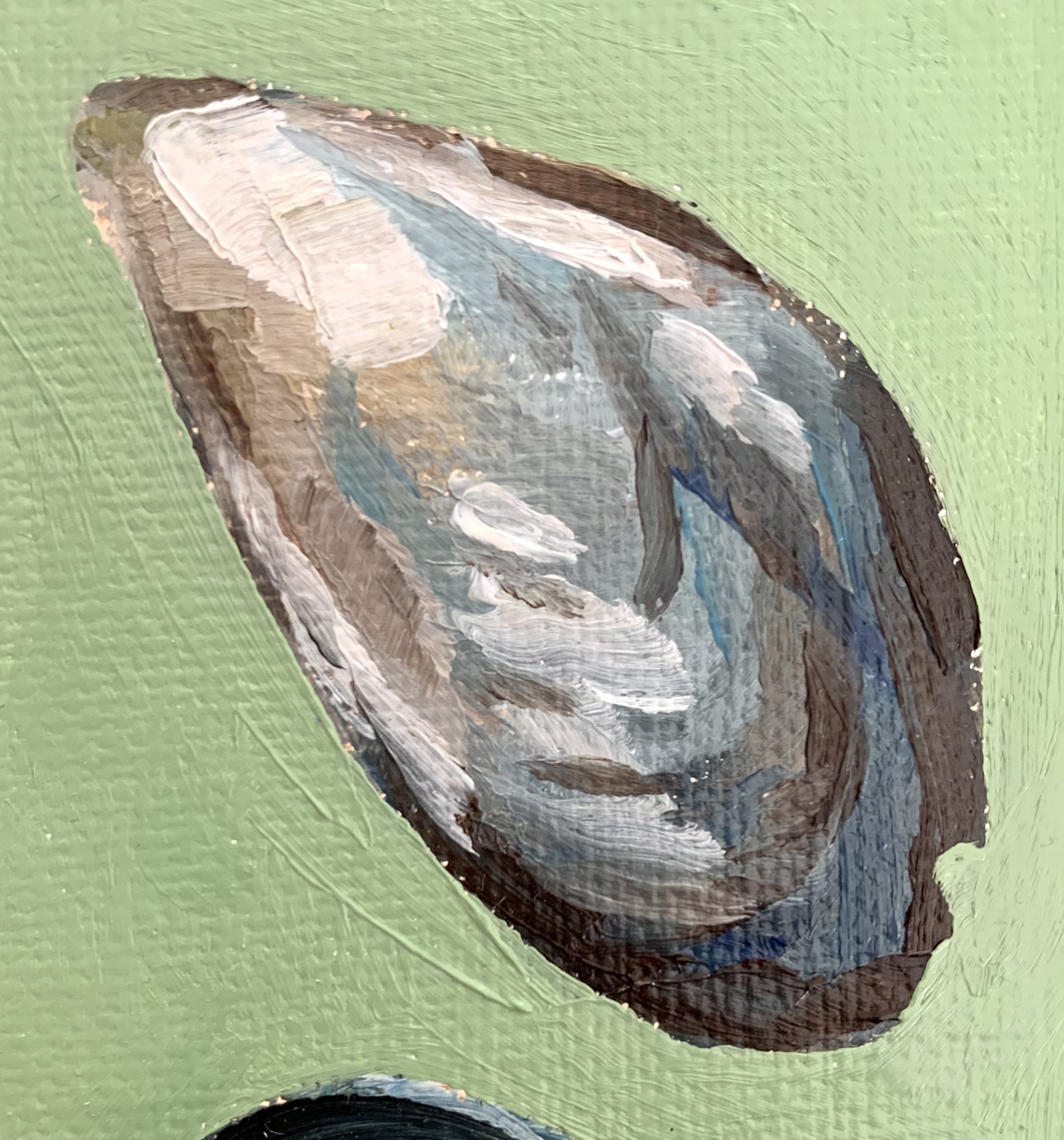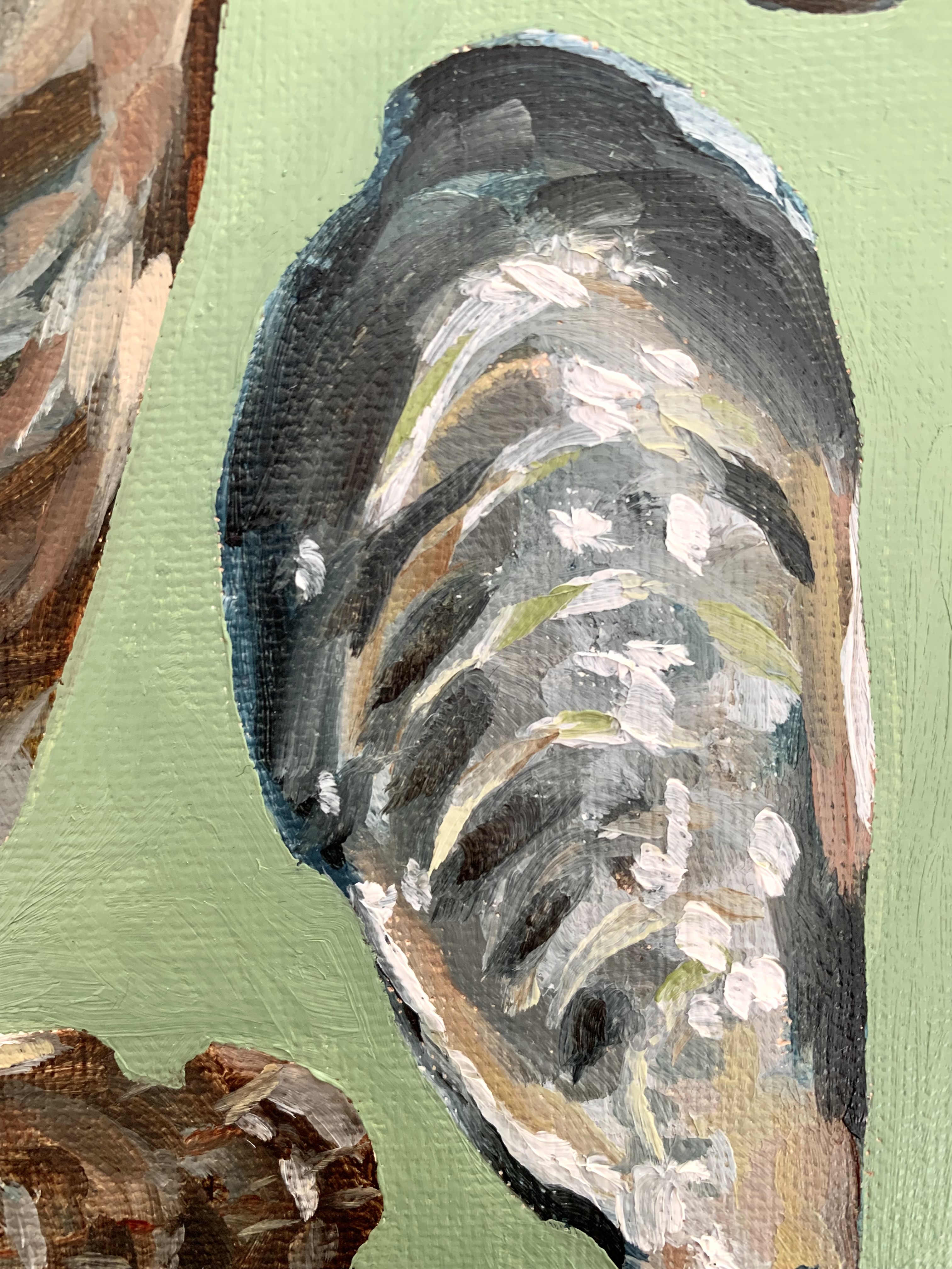 April 2025 – A 5″ x 7″ oil painting of mussel shells. Two of the shells display the outside while the others display the inside.