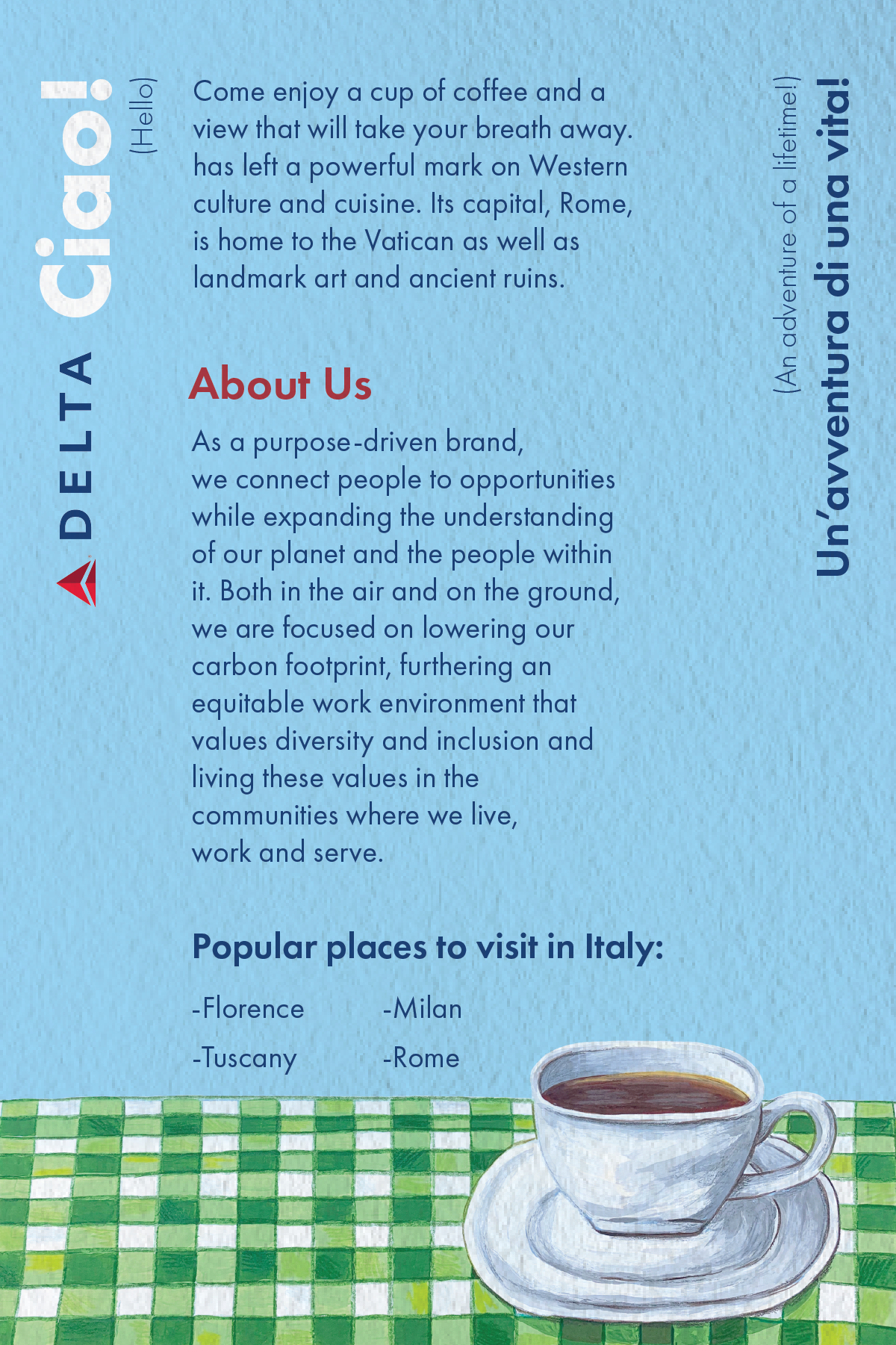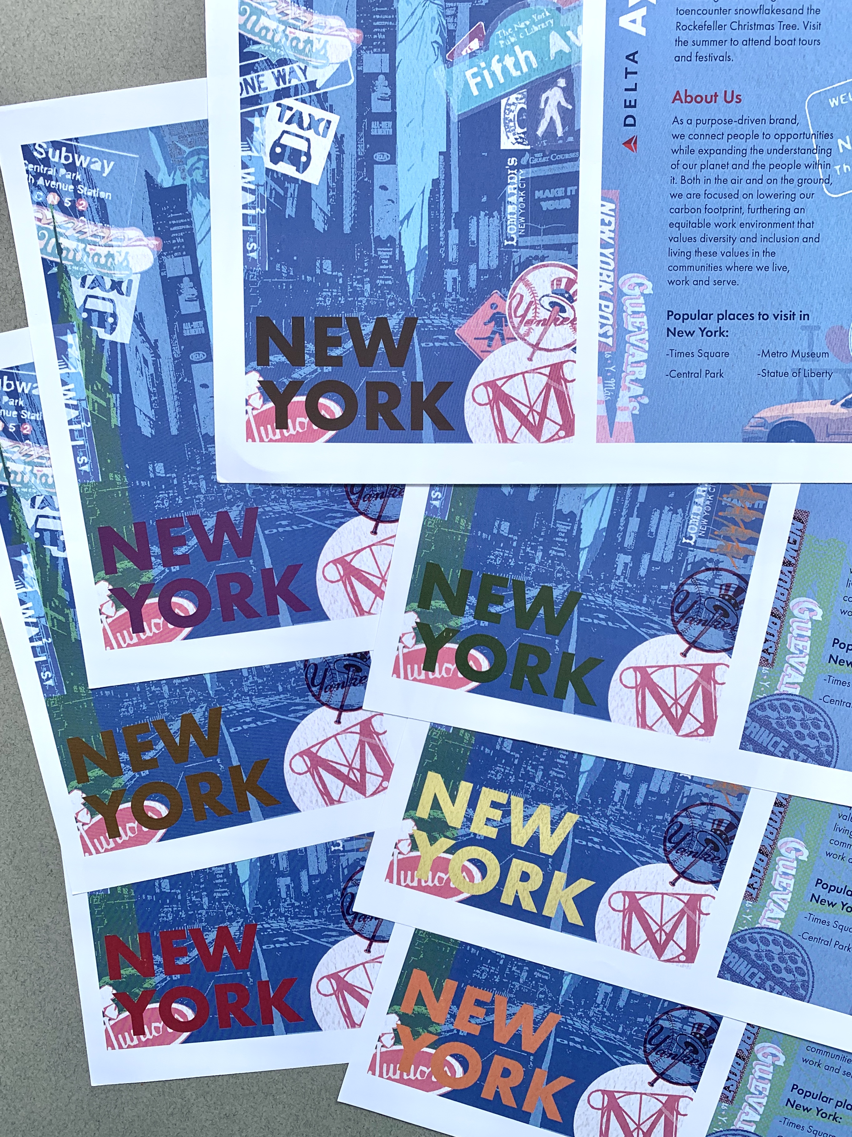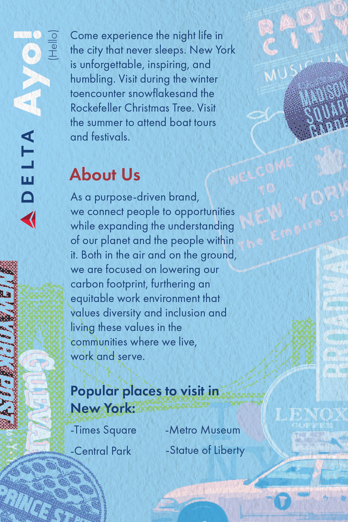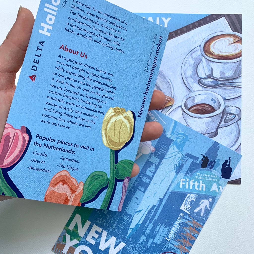 October 2022 – A set of three postcards that encourage Delta Airlines travelers to explore a new place. This project was about making images of different travel destinations that graphically harmonize with the visual identity of Delta Airlines (fictional project). The images also needed to create a sense of place and hold a cohesive graphic language so that they were a cohesive series. In essence, it is about unity and variety with an established visual system. The images needed the viewers’ attention, while the postcards needed to offer information about the location and airline company.