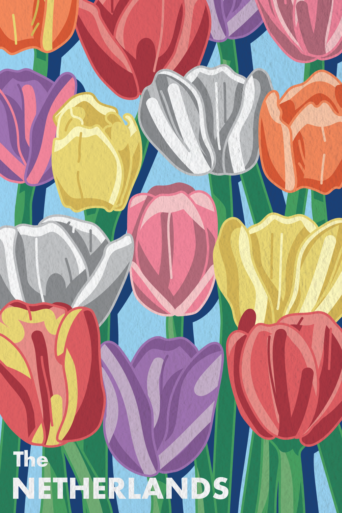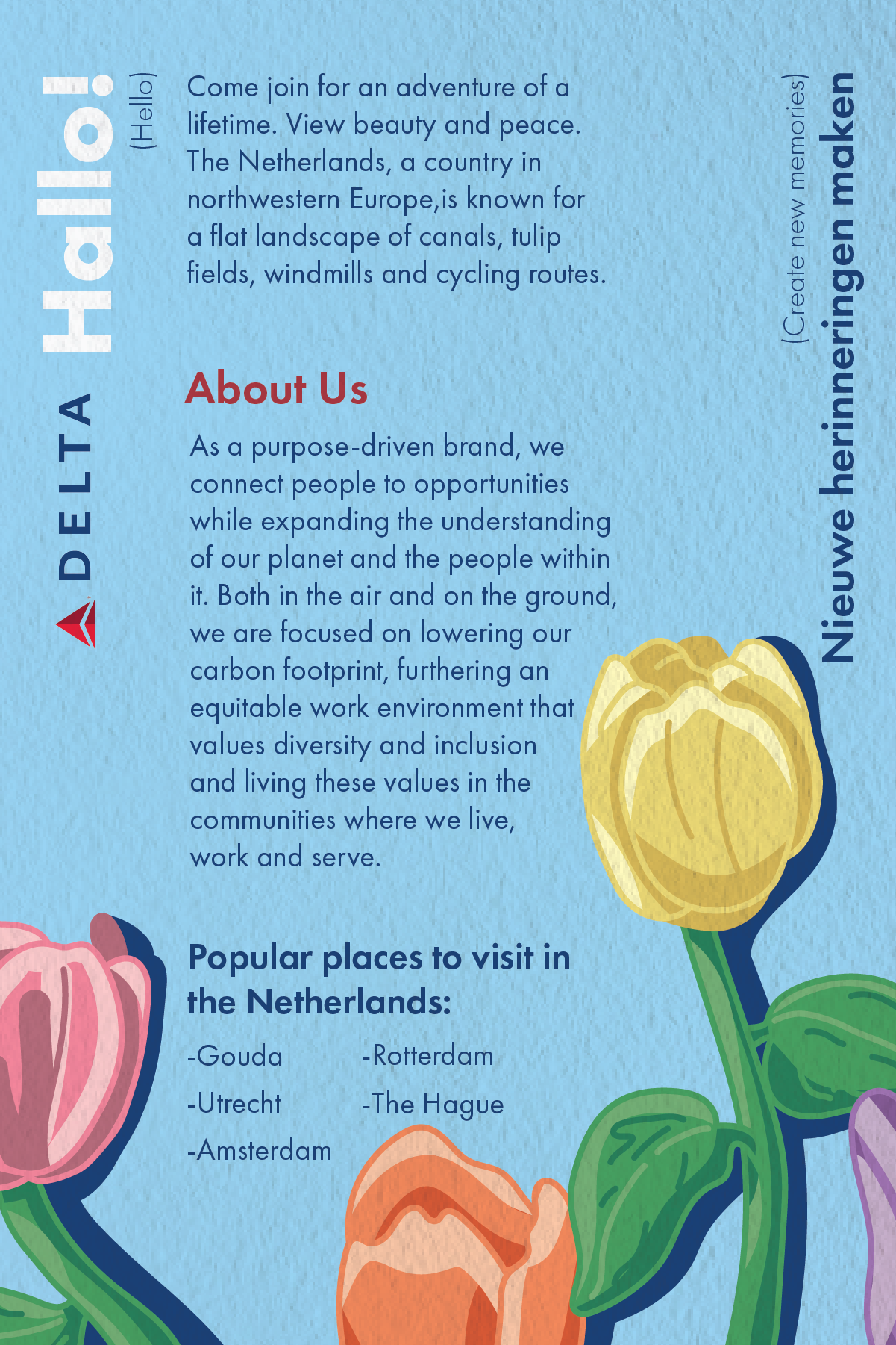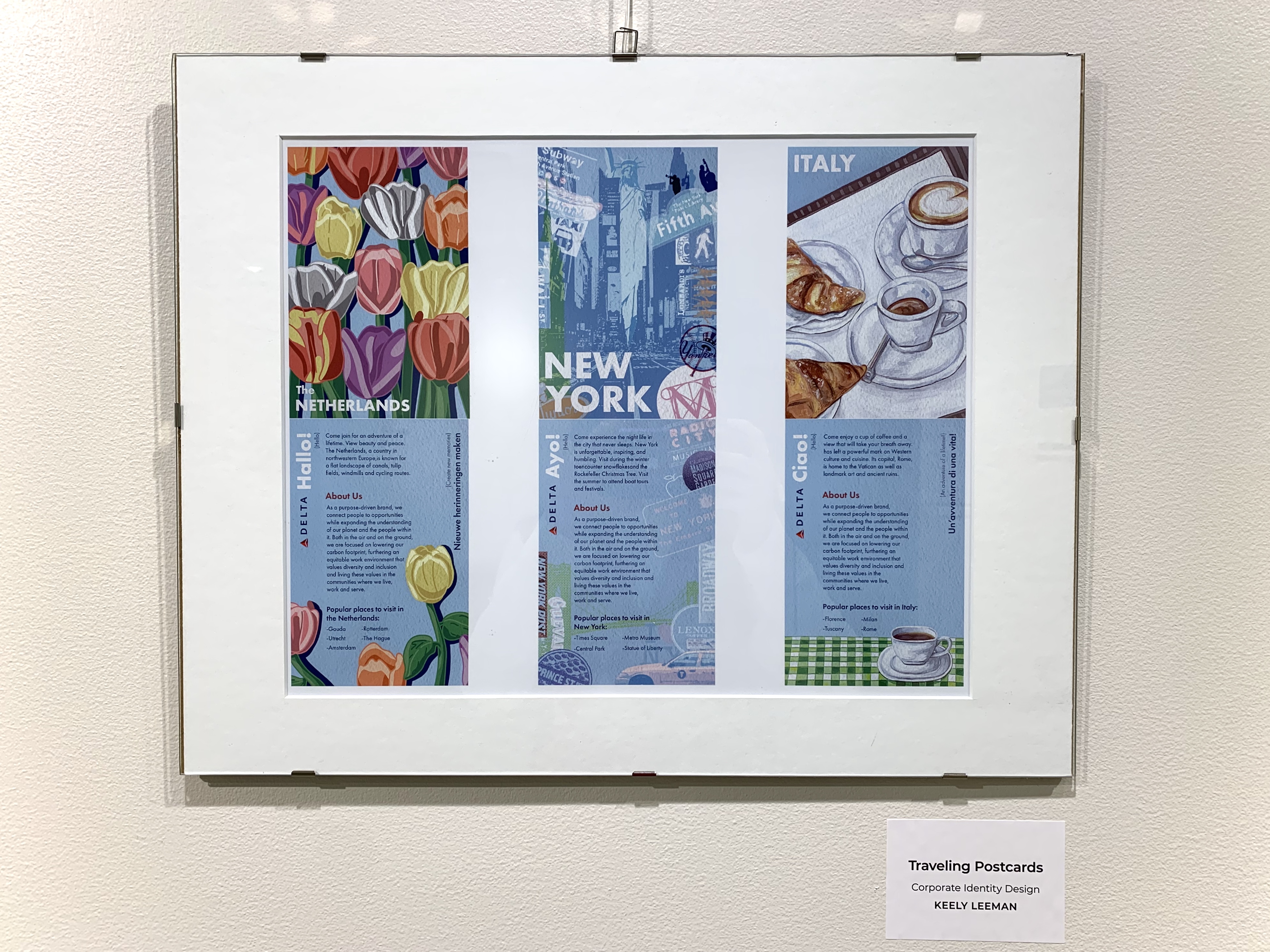 My approach to image-making was both digital and analog, digital image montages, and hand-painting my own illustrations. The typography and color needed to be consistent to maintain unity, which is a key element in corporate identity, while the image content and approach to their creation required variety to maintain visual interest and authenticity to the location. Each postcard was conceptually approached as follows; The Netherlands postcard used illustration (known for its tulip fields), New York experimented with collage (common location found in the city), and Italy implemented paintings (morning cafe experience).