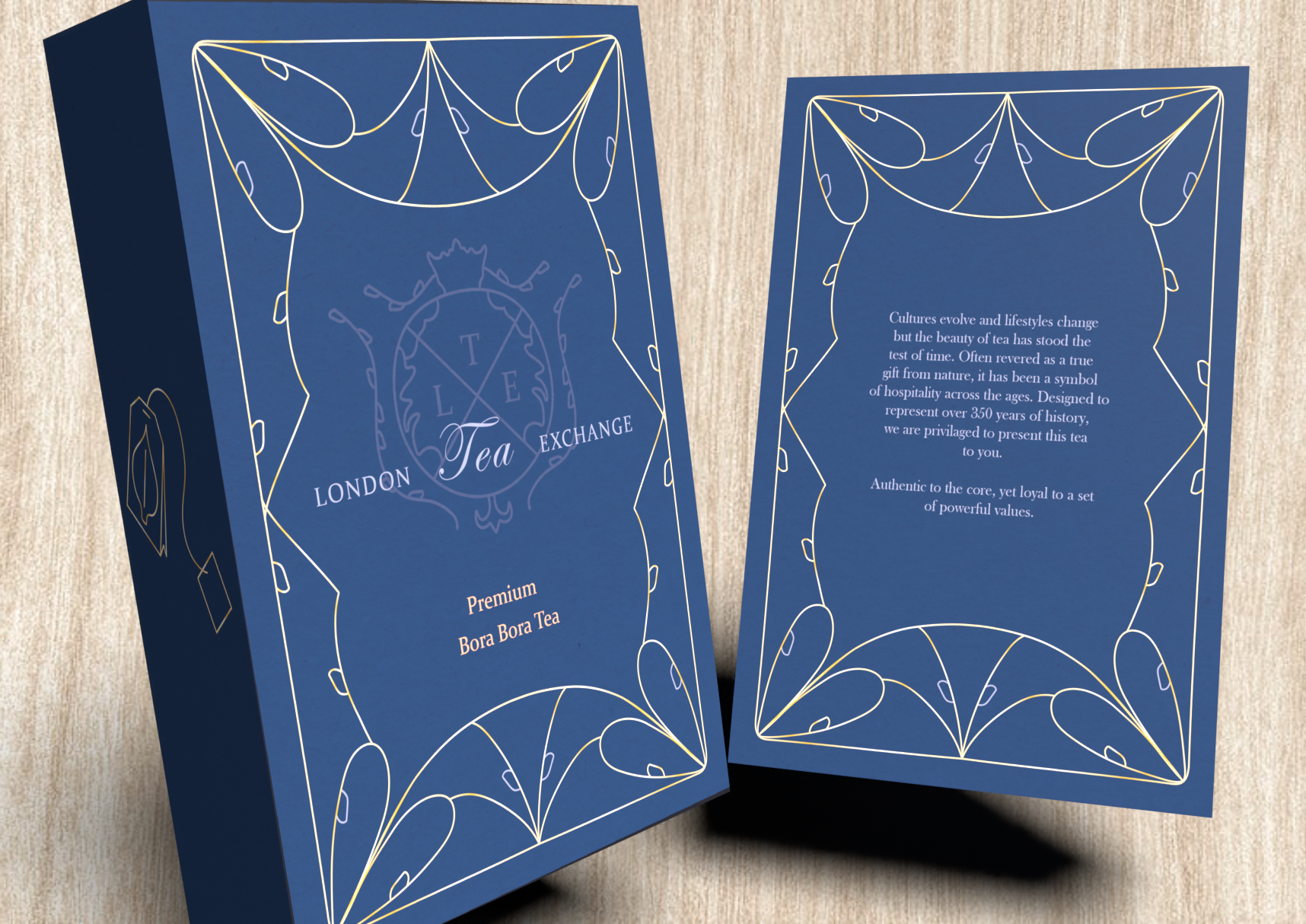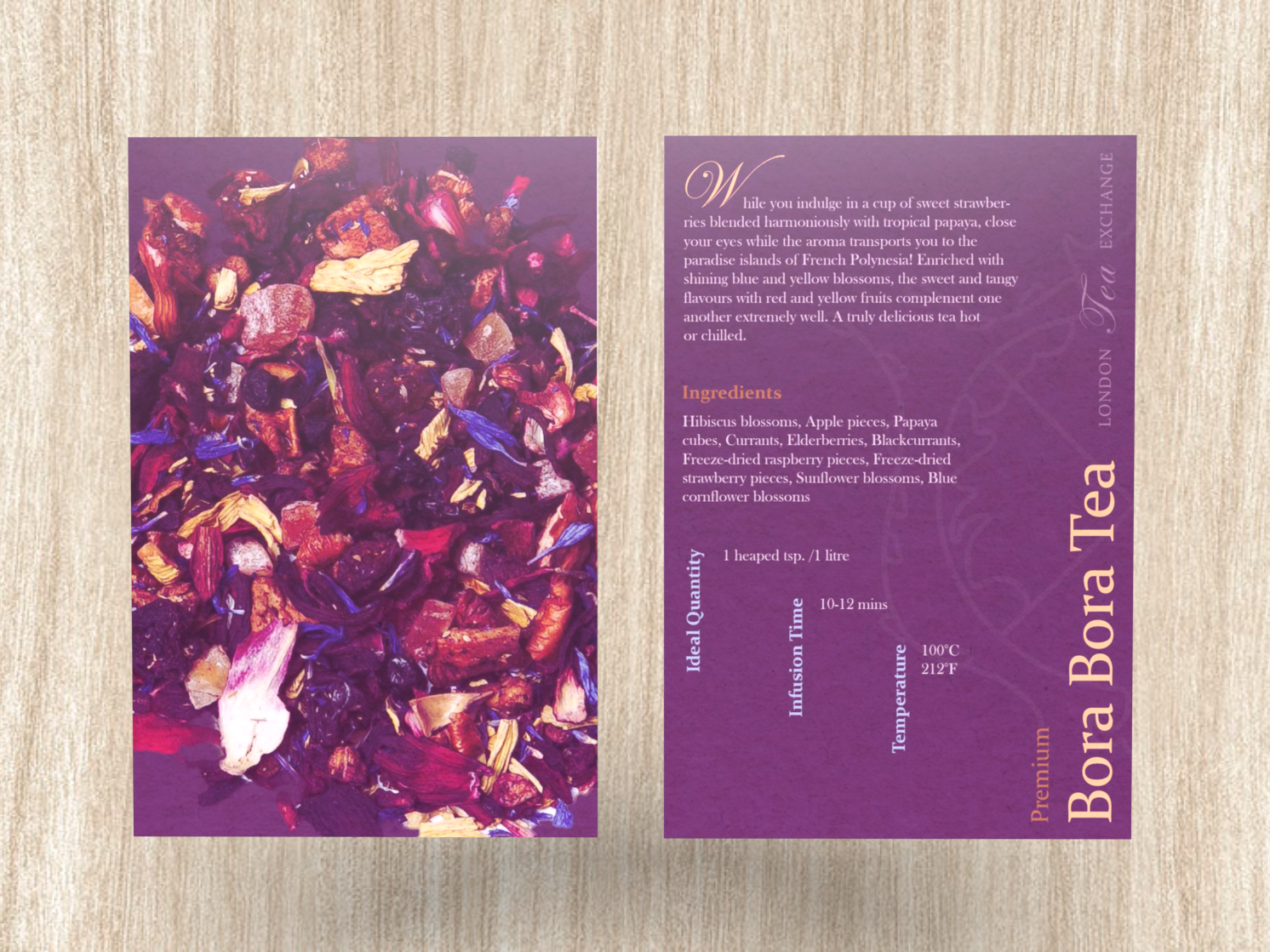 Multiple versions were designed to represent different versions of the teas being sold (ex. Green Tea, Bora Bora Tea, Black Tea). The identity manual contains color palettes, typefaces, color combinations, design elements used, and multiple alternative examples for the teabox and postcard. The design for the tea box is replicated on the tea bag. The postcard contains information for the buyer about the type of tea as well as ingredients, infusion time, quantity amount, and ideal temperature. The design as a whole presents luxury and elegance while maintaining simple detail designs that will catch the eyes of the buyers.