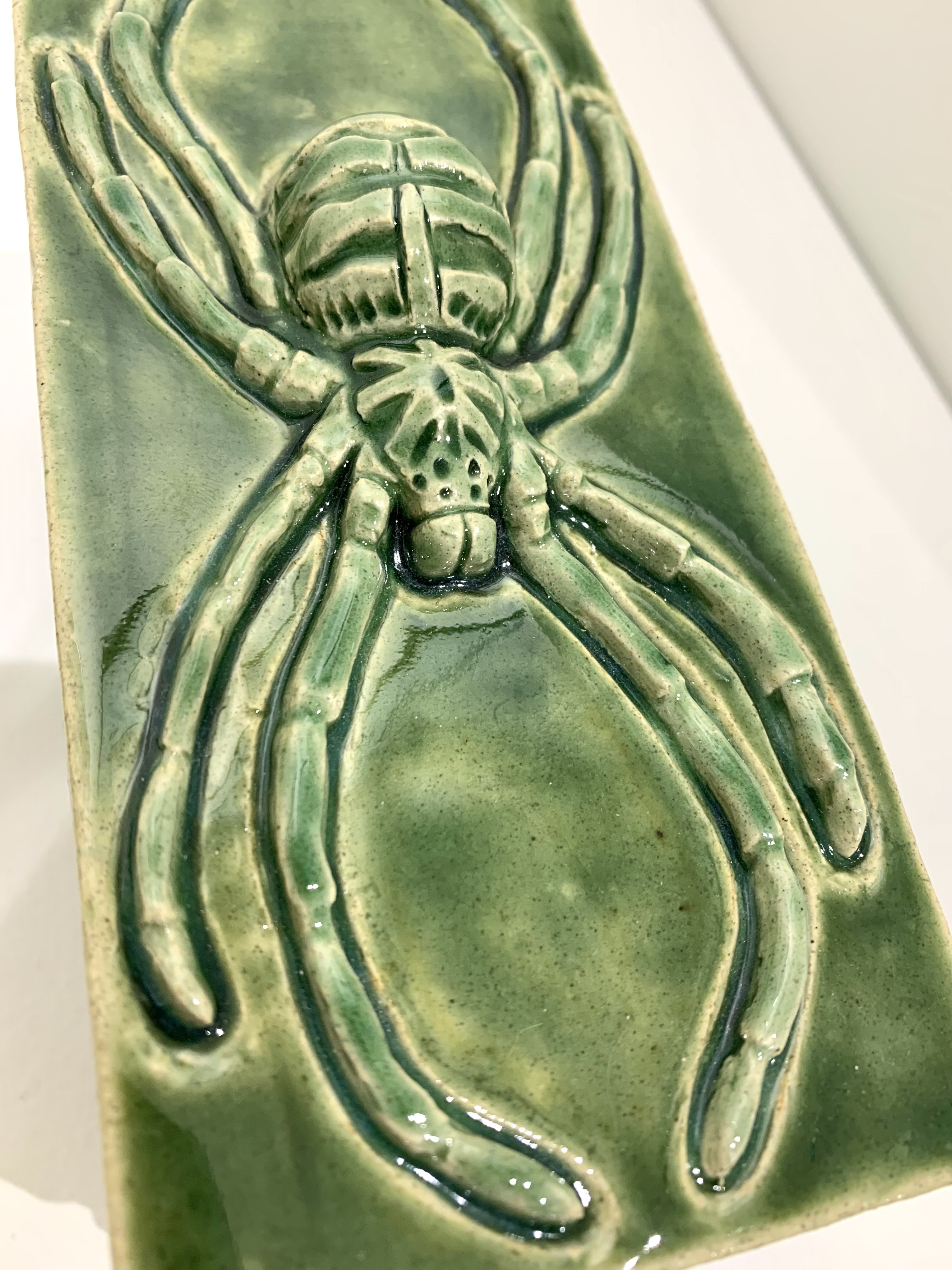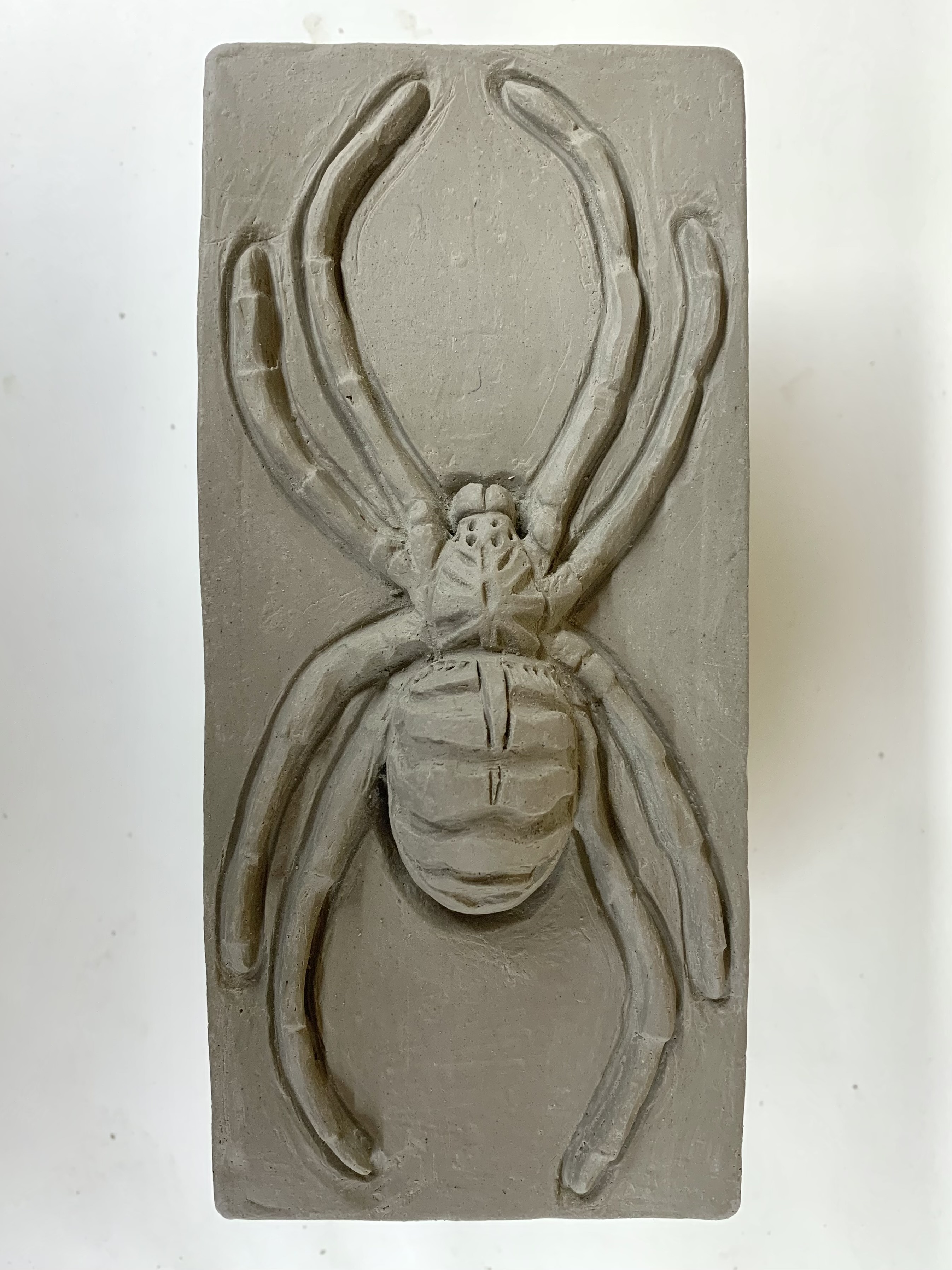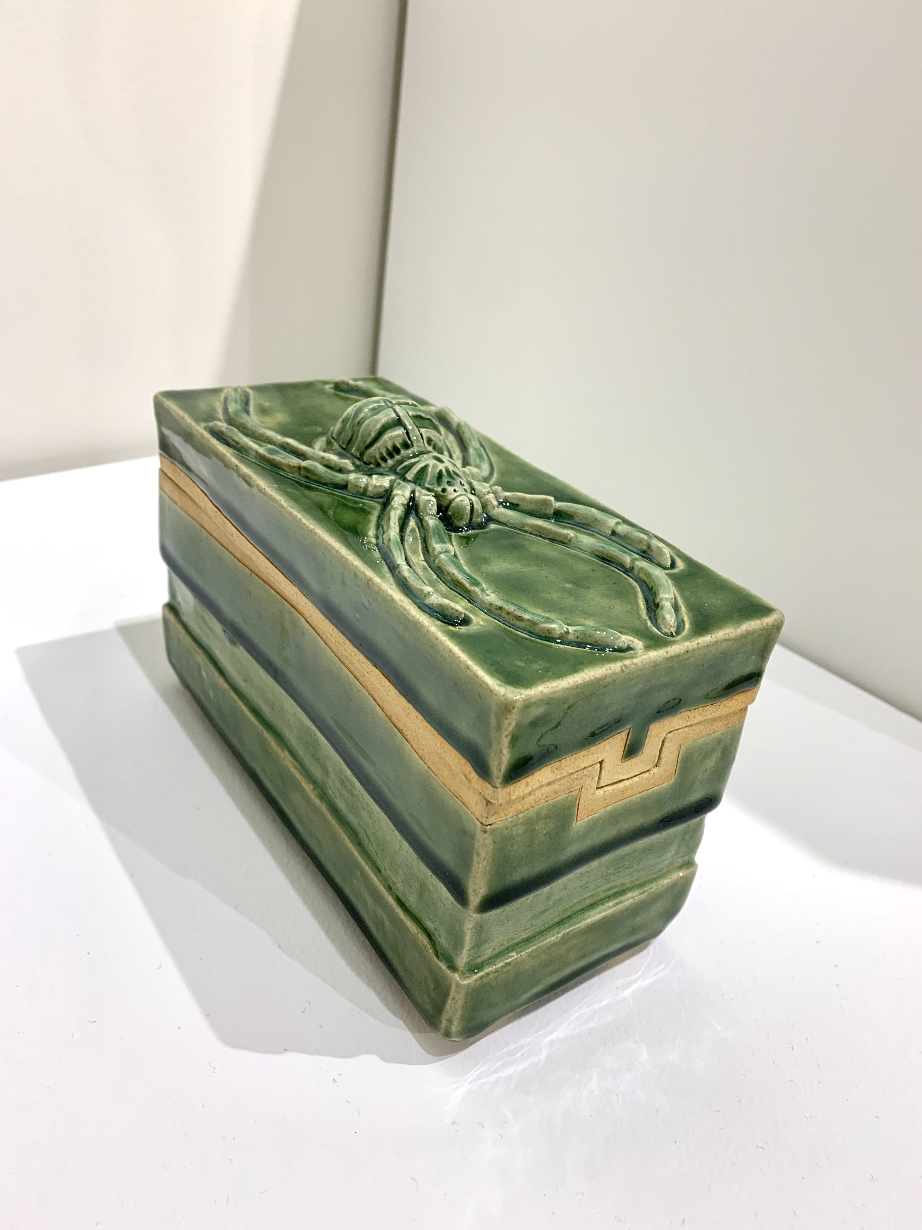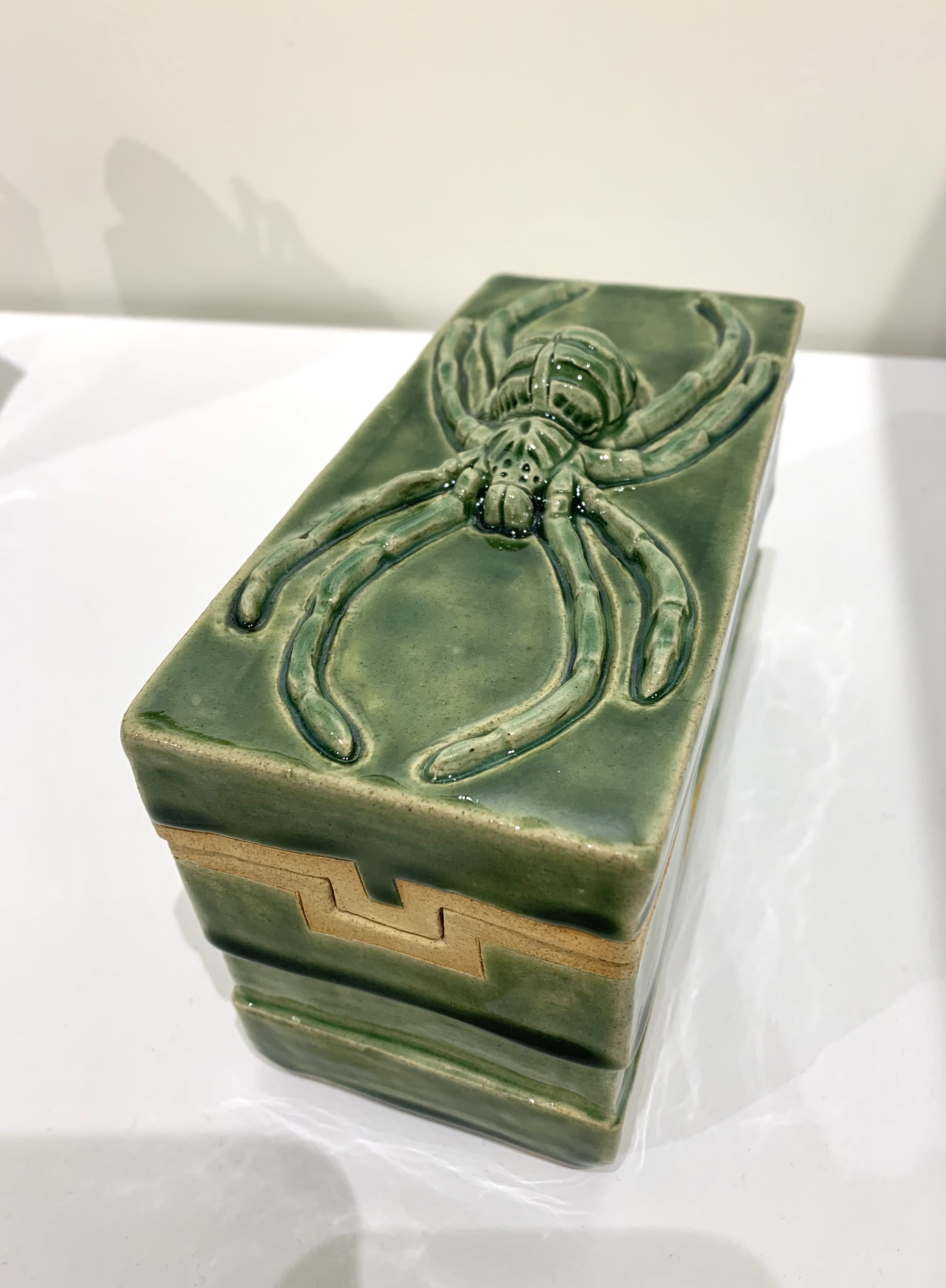 December 2023 – A 7″ x 3″ x 4″ clay wolf spider box that is functional. The objective was to choose an animal or insect that I liked and place it somewhere on the box. The spider sits on the top of it to remain structurally sound. The chosen green glaze enhances the carved pattern on the spider’s body and leg joints.