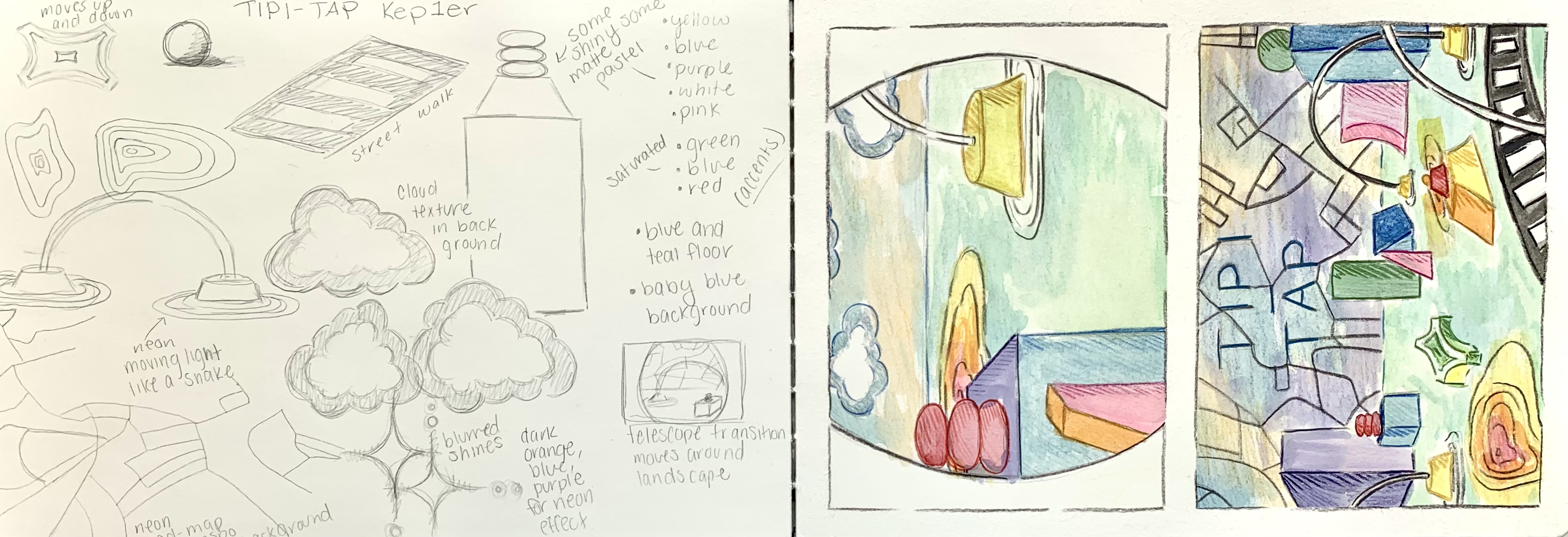 I started by sketching the composition of the two main frames of the animation. From there, I worked layer by layer, taking inspiration from the color palette and shapes featured in the music video. During the animation phase of this project, I had to learn how to time different elements together when they’re exported separately. For example, the foreground had to move at one speed while the background had to move faster to create some variety.