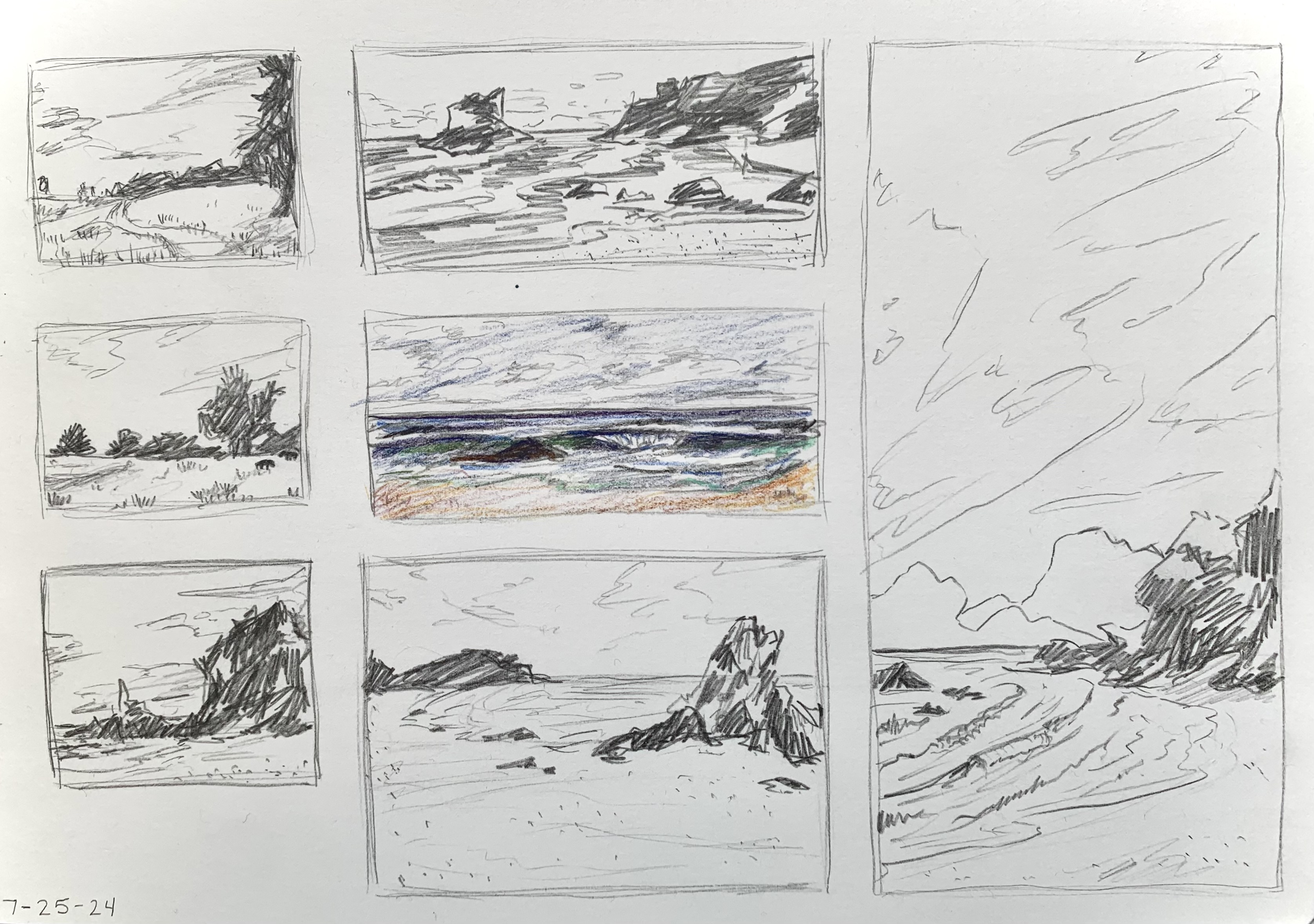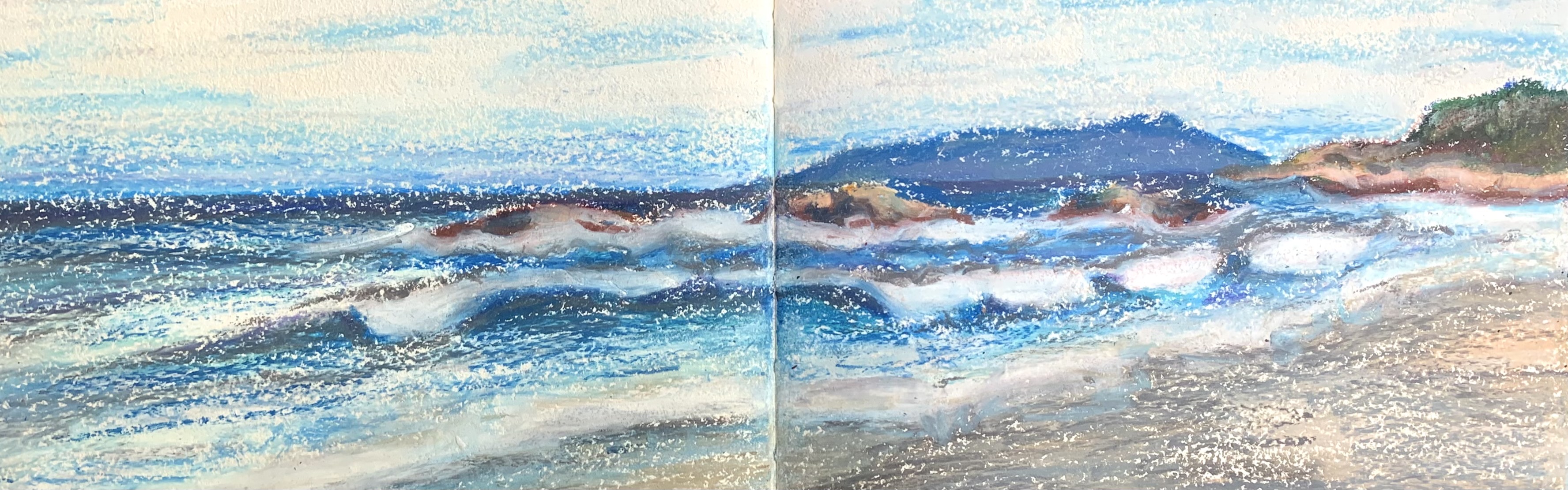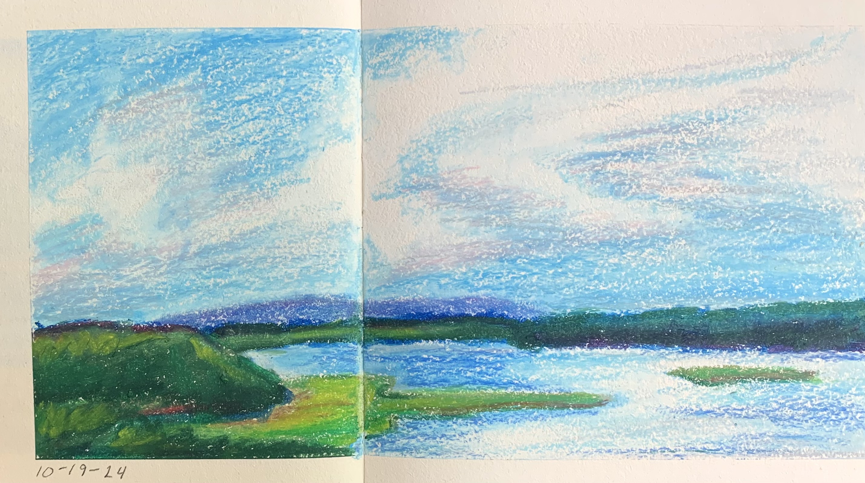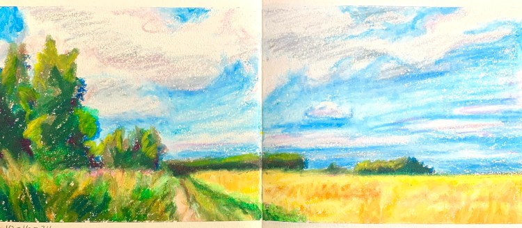 The landscapes that I choose to draw are a mixture of reference photos along with my imagination. Sometimes I will sketch a landscape in my sketchbook with the intention of going back later to use the composition for a painting or oil pastel.