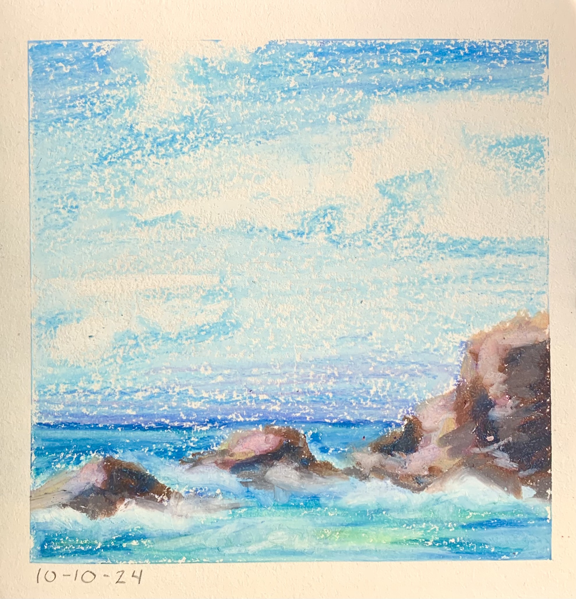 I create these oil landscapes because I find them to be quick and easy, which allows my mind to settle down. I find that the saturation and texture of the oil pastels can be very forgiving and takes off the pressure of having to create a great piece of work every time.