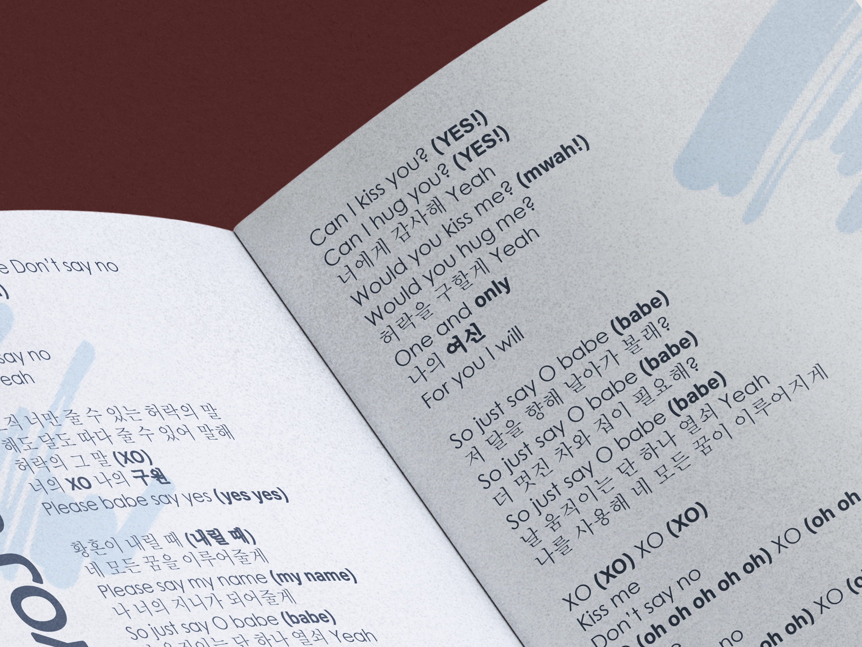 The color palette and heading type used are inspired by the band’s “Daydream” album. The images used are from a DICON photoshoot, which was released around the time of the album. The background texture is composed of song lyrics featured on the setlist and doodles that are on the album cover.