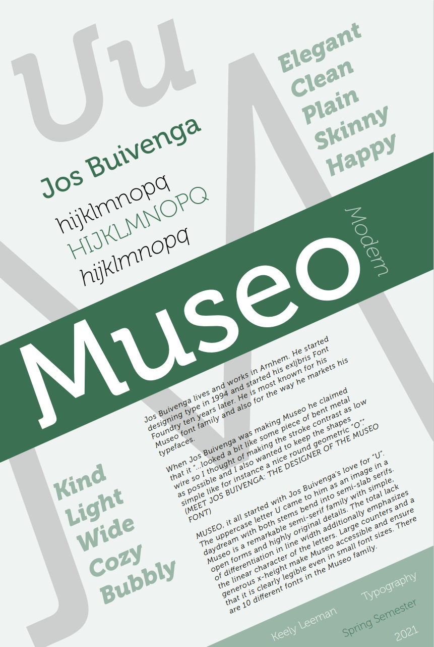 March 1, 2021 – Typeface poster that explains and demonstrates Museo created by Jos Buivenga. Composition, color, and movement were experimented with in order to create an easy-to-read and attractive poster.