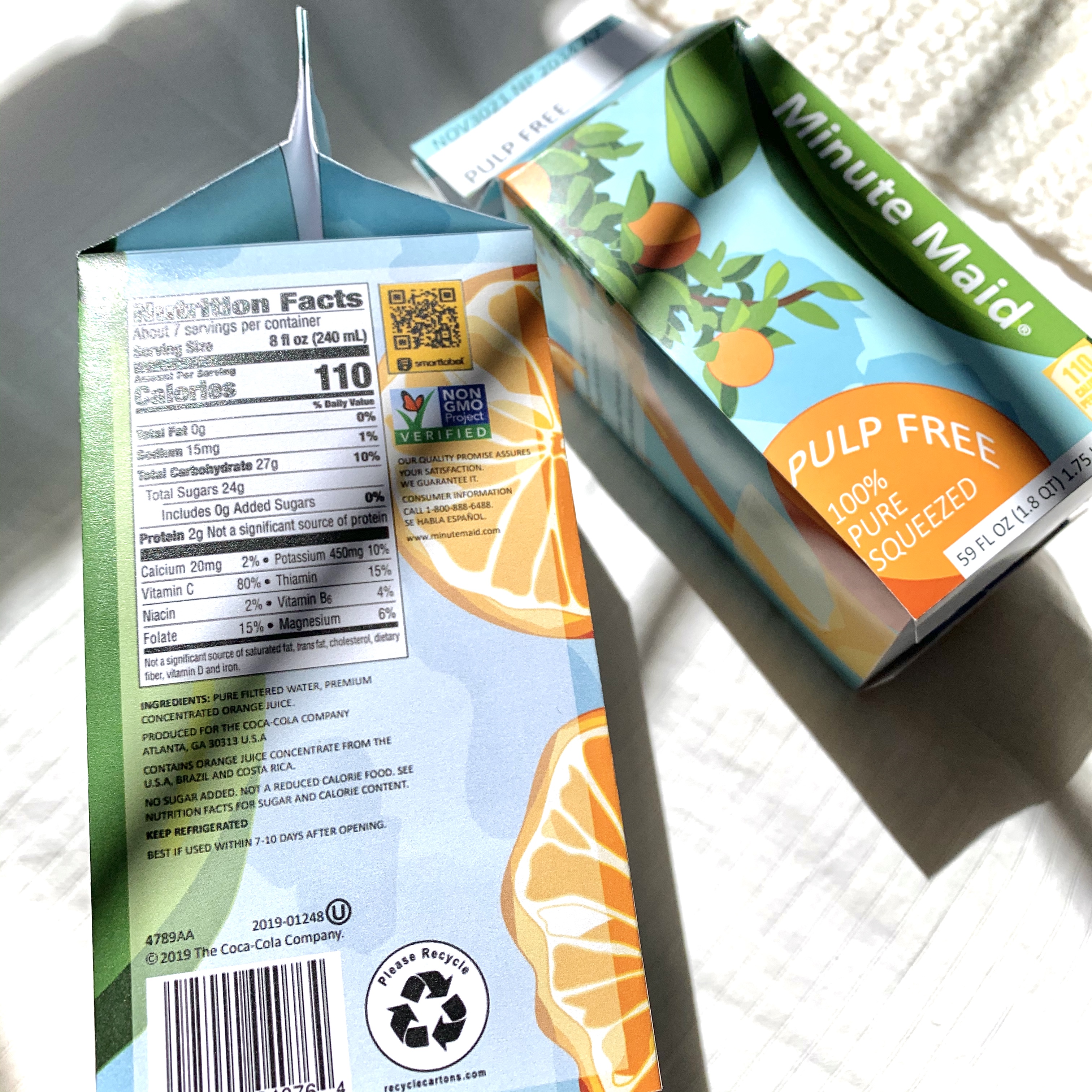 The color palette used creates a feel-good mood which is what Minute Maid promotes. Using the same color throughout the design makes each side of the carton flow from one to another. Using blocked shadows and shapes gives the design a simplistic feel. The white textboxes help make the information more legible. The blue spots in the background fill up space.