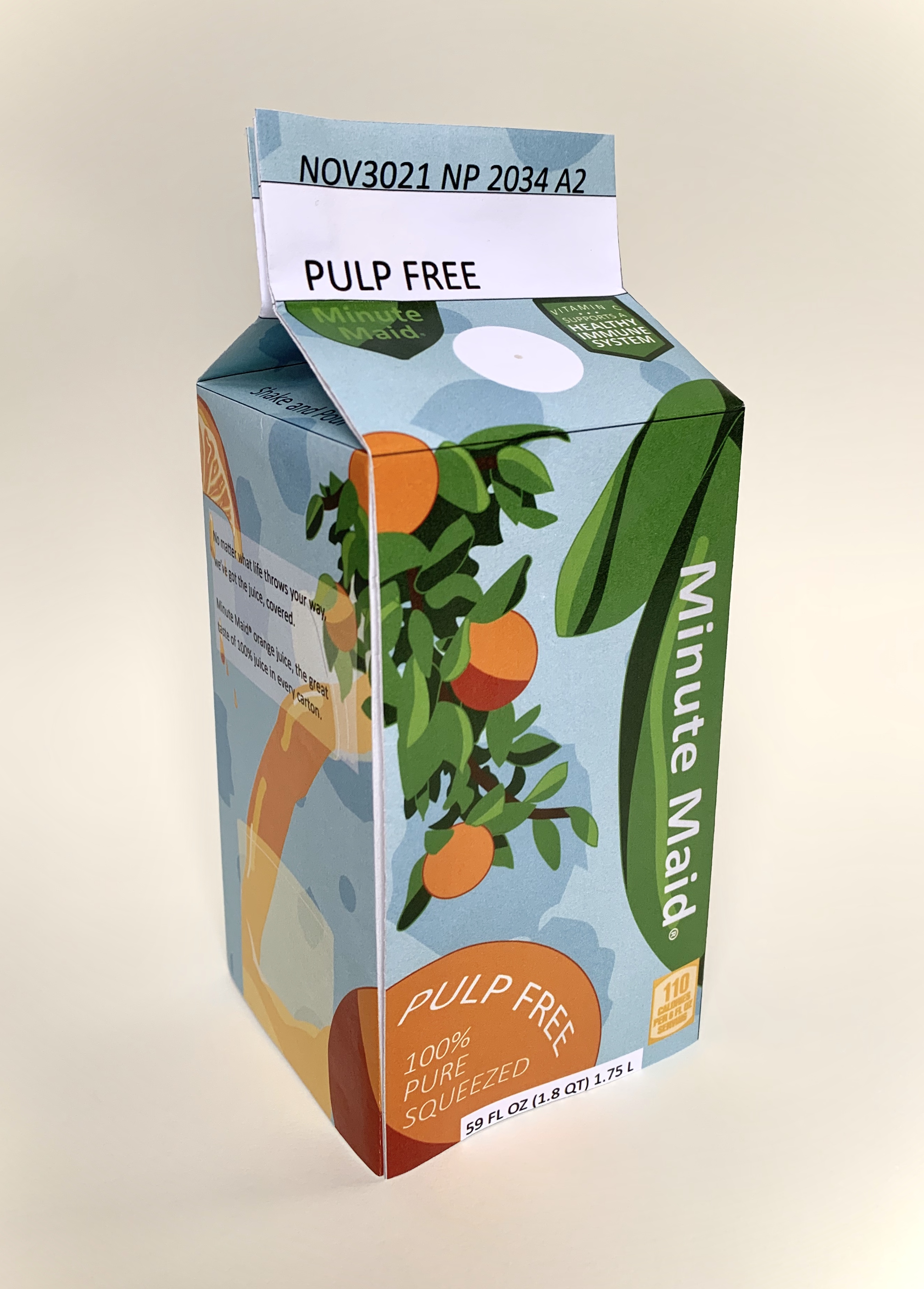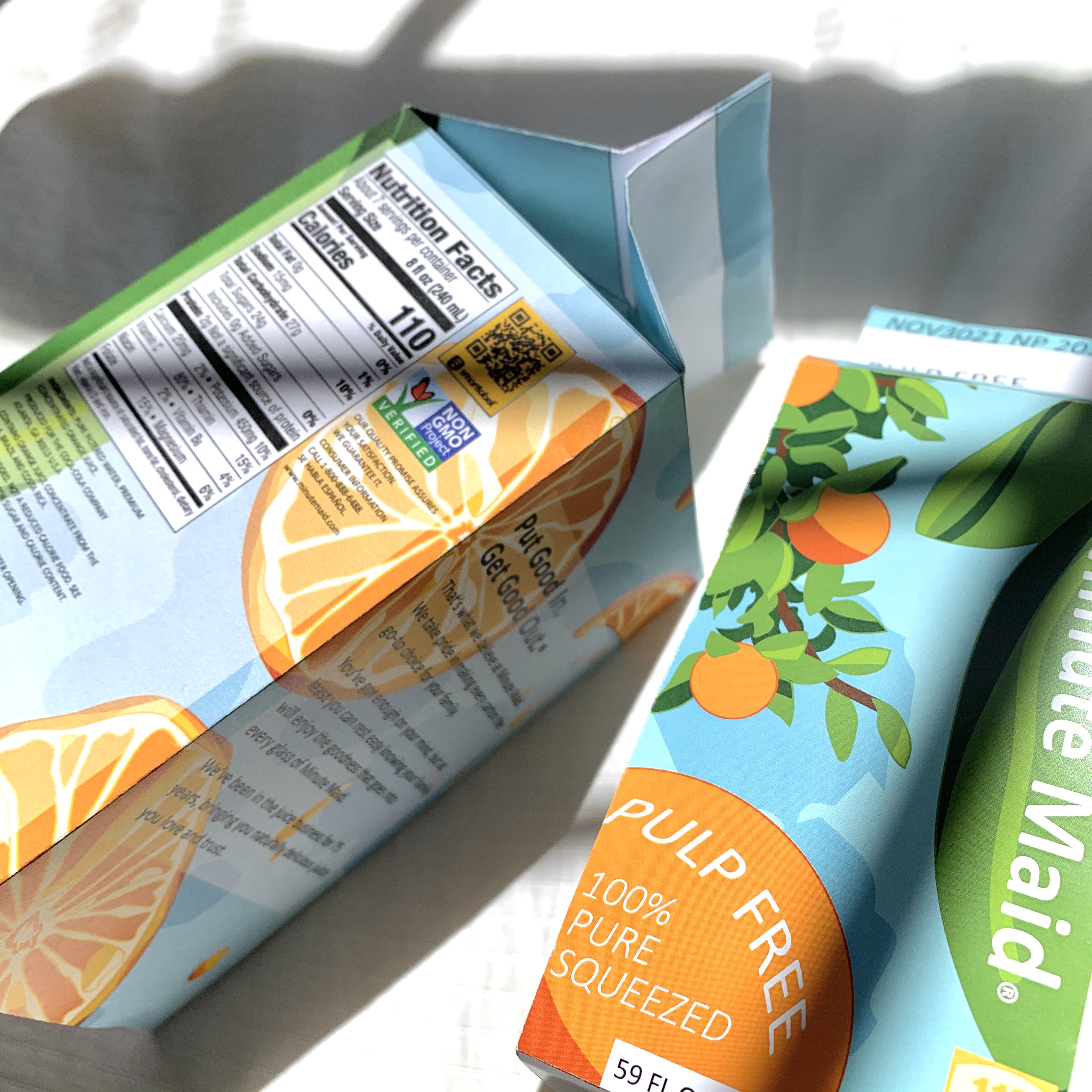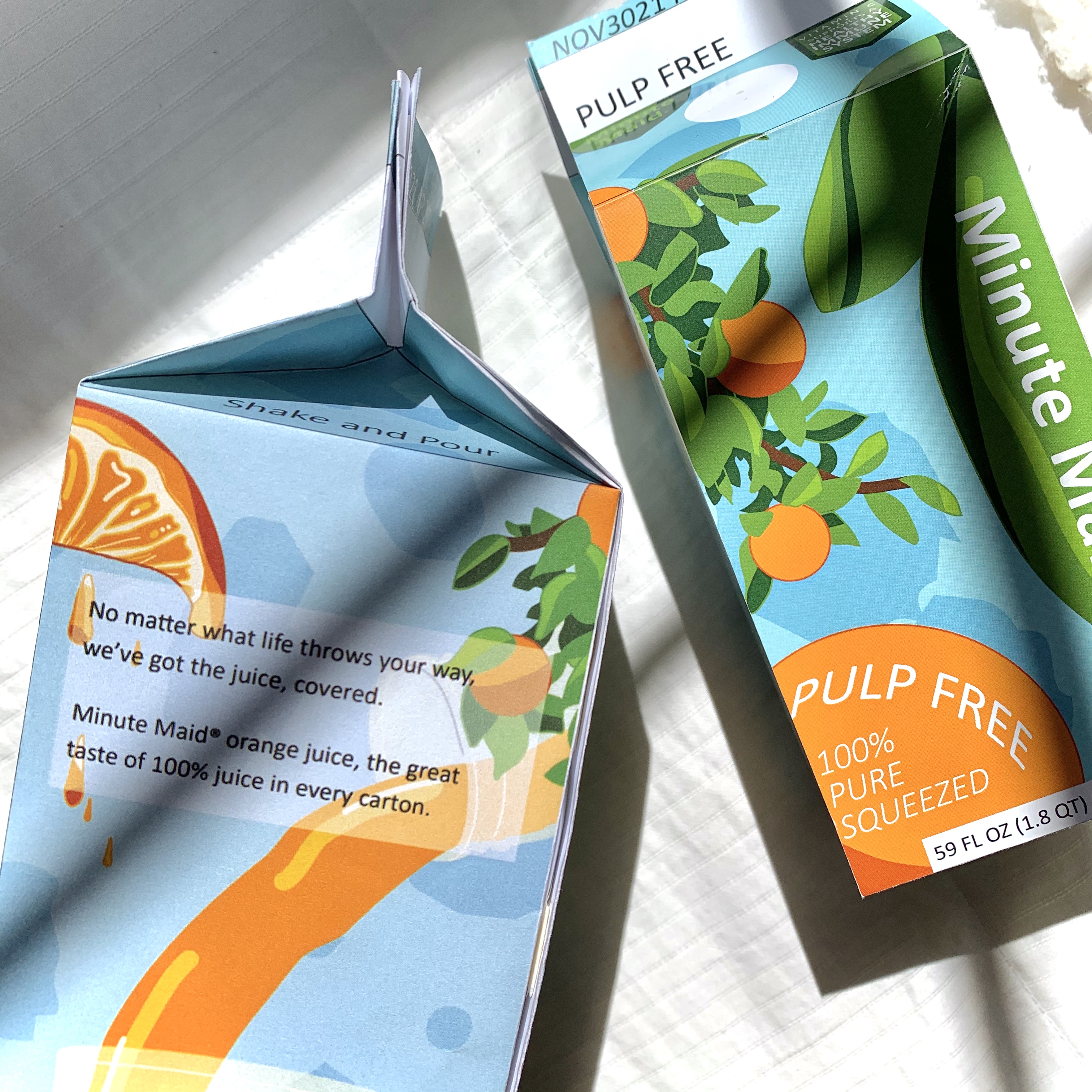 November 29, 2021 – Revision of the Minute Maid orange juice carton. Every side presents a process of creating orange juice. Illustrations and color choices give a lighthearted and appealing look and feel.