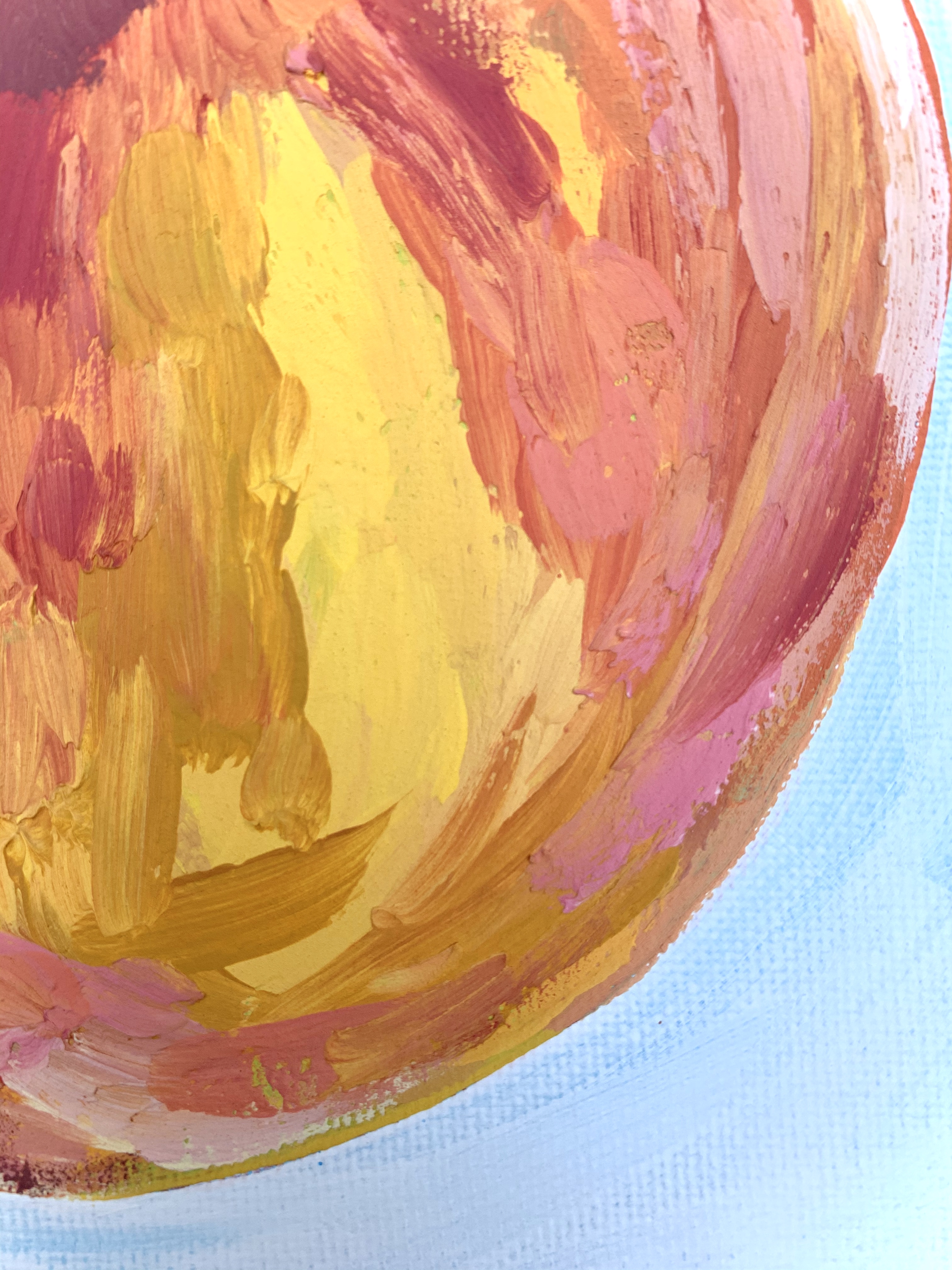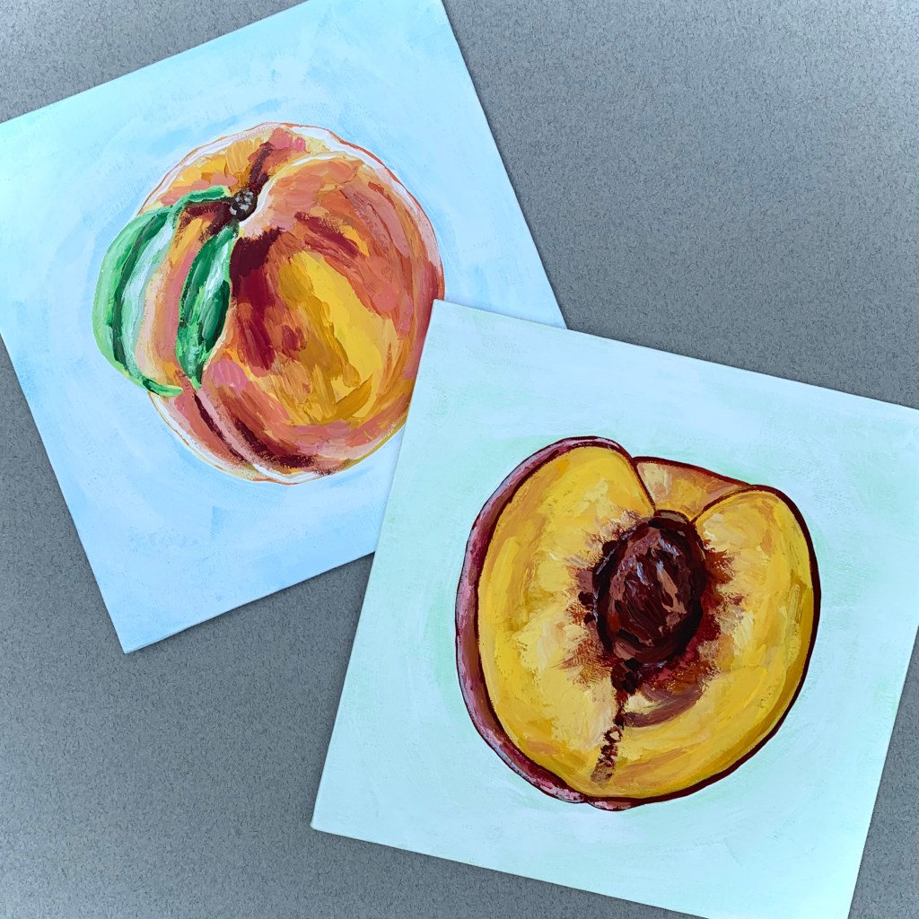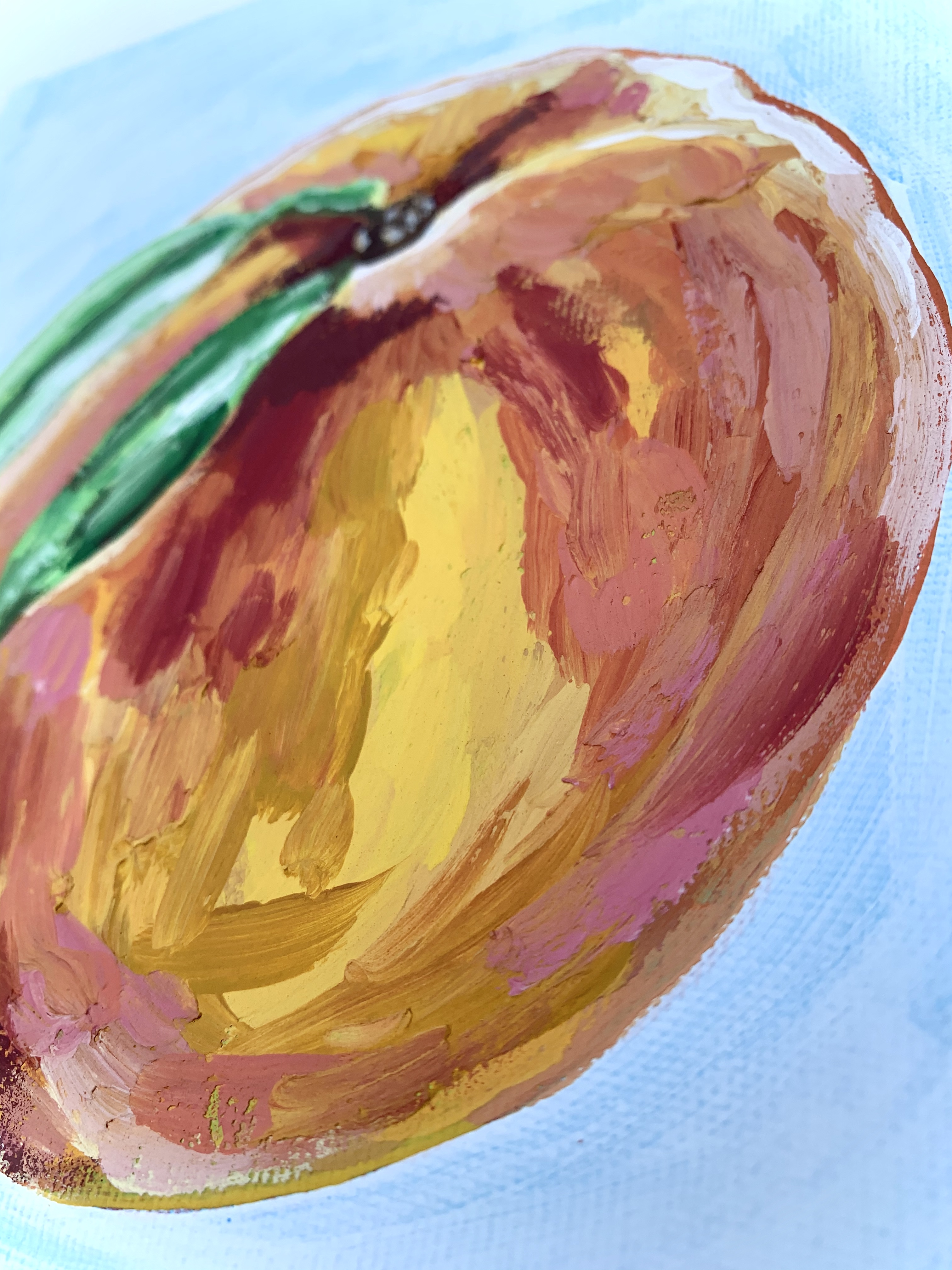 I used modeling paste on the peaches only while I left the background to be a semitransparent white. At the time of this painting, I had only used acrylic paint yet desired to get the effect that oil has on canvas. The modeling paste was mixed straight into my paint and I made it so that the brushstrokes follow the shape of each fruit.