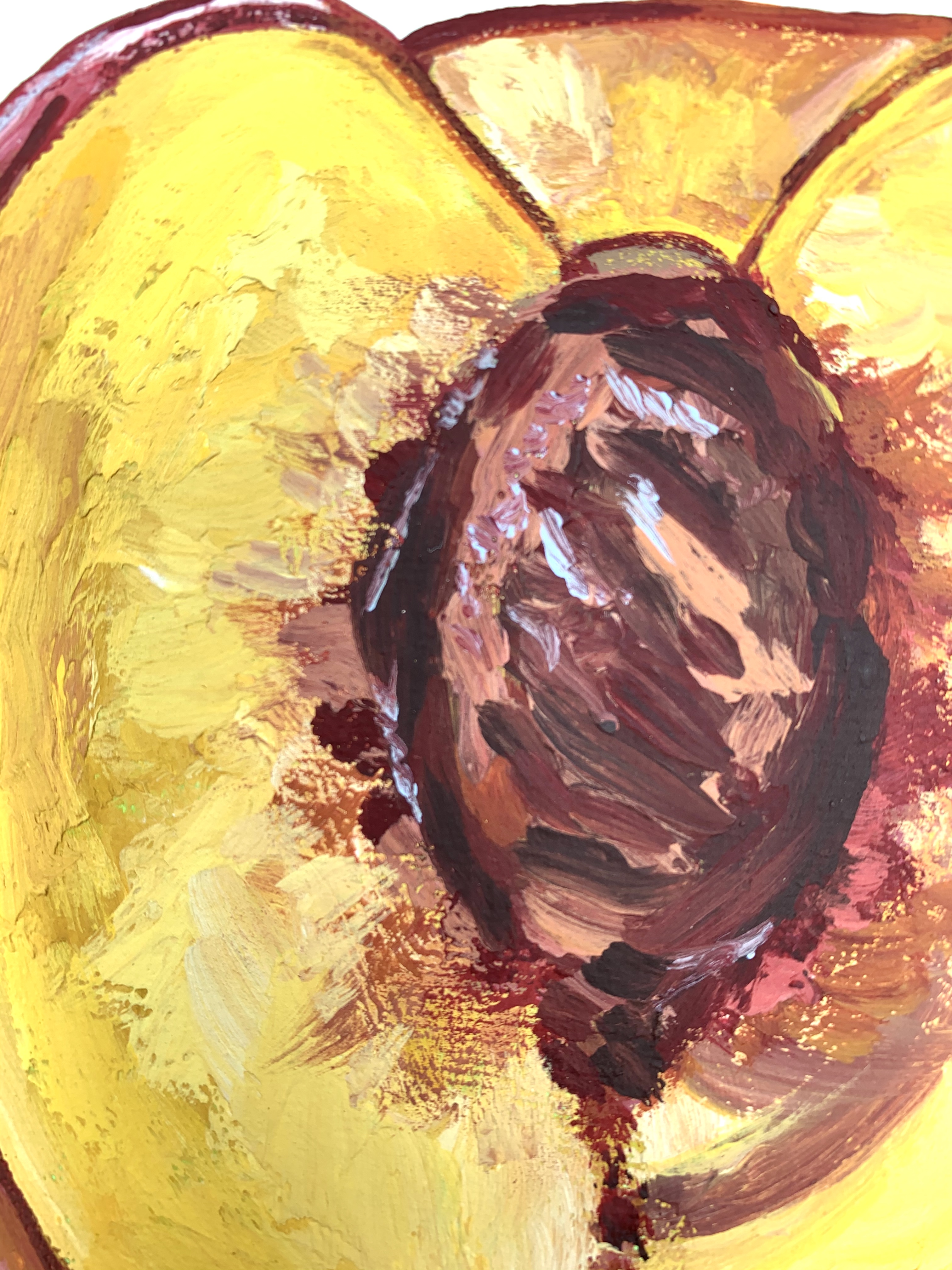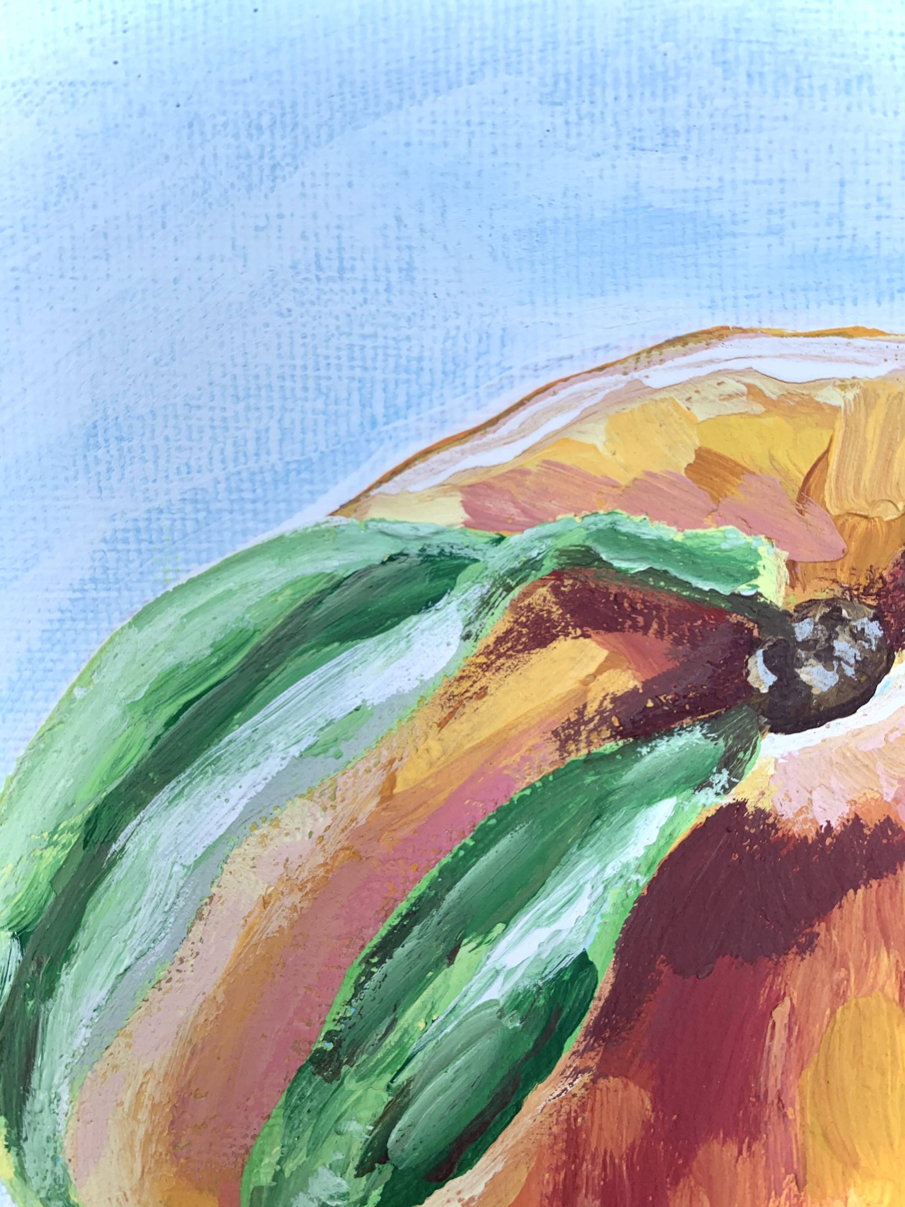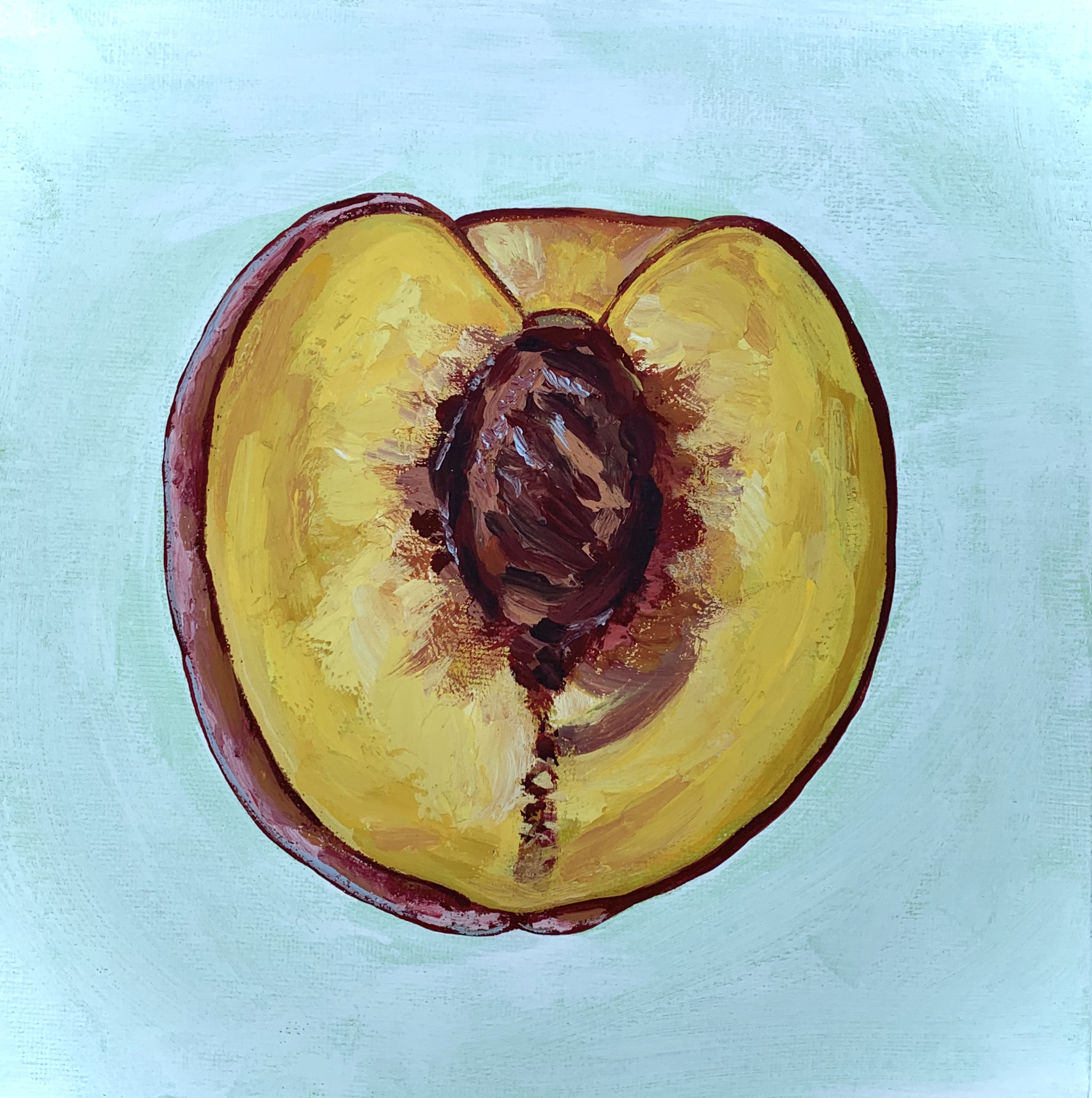 I used modeling paste on the peaches only while I left the background to be a semitransparent white. At the time of this painting, I had only used acrylic paint yet desired to get the effect that oil has on canvas. The modeling paste was mixed straight into my paint and I made it so that the brushstrokes follow the shape of each fruit.