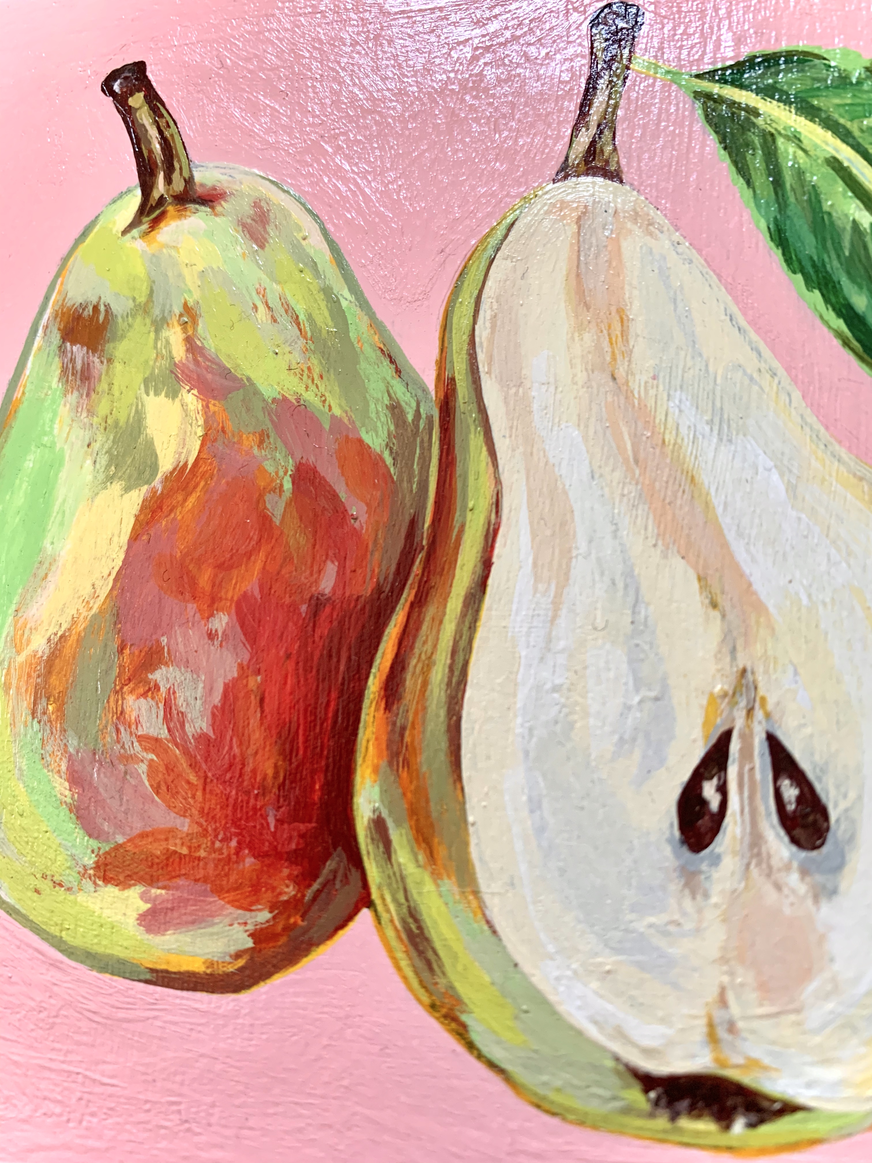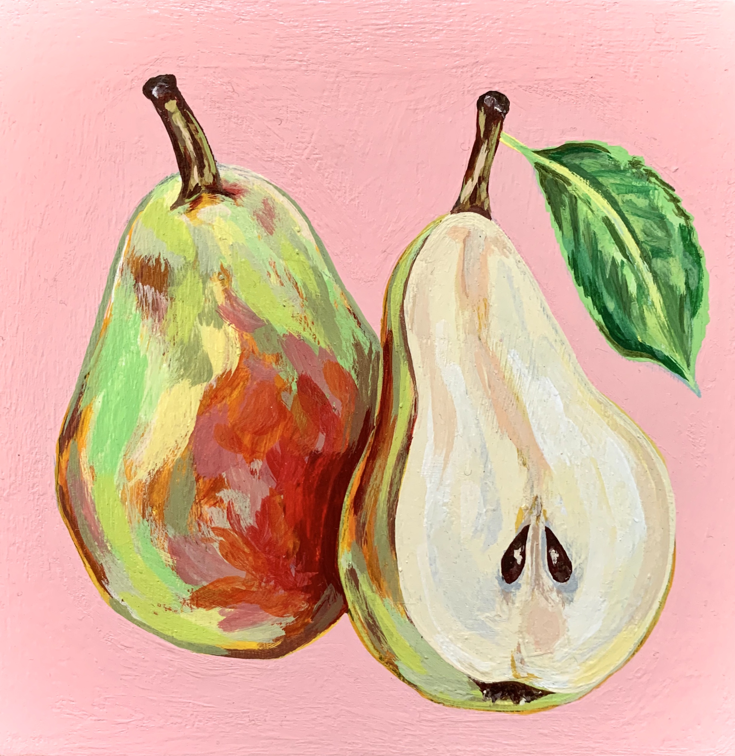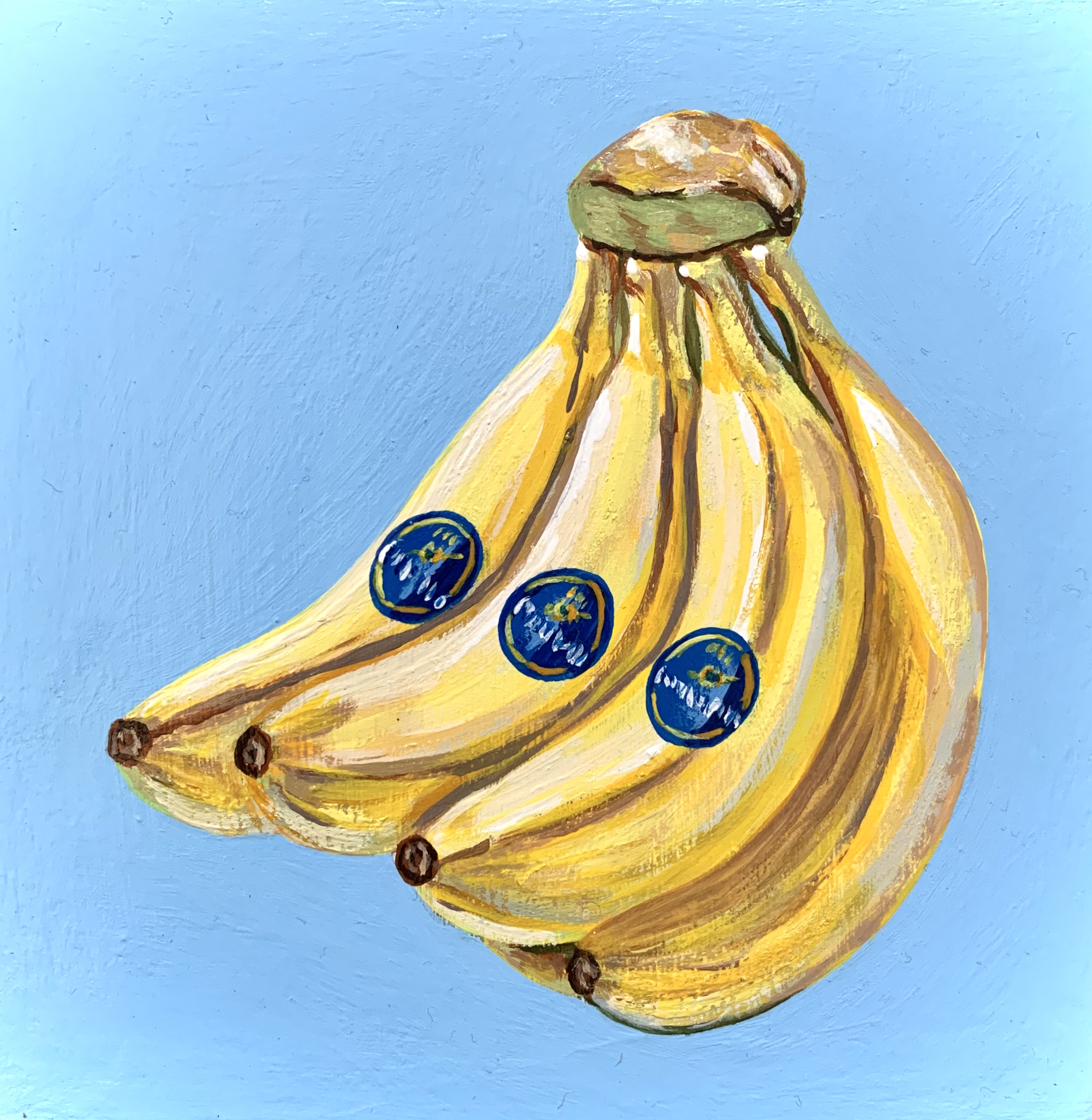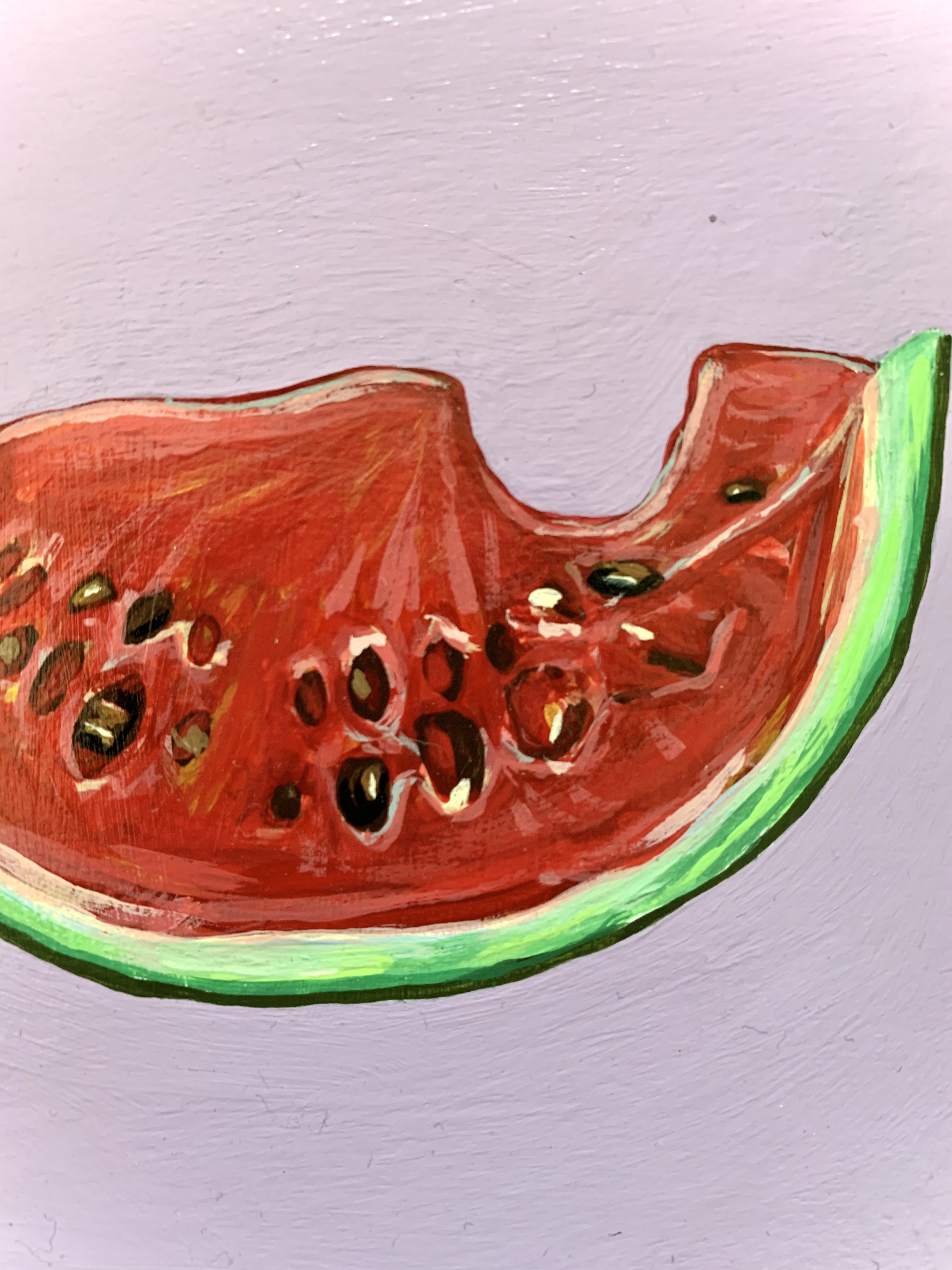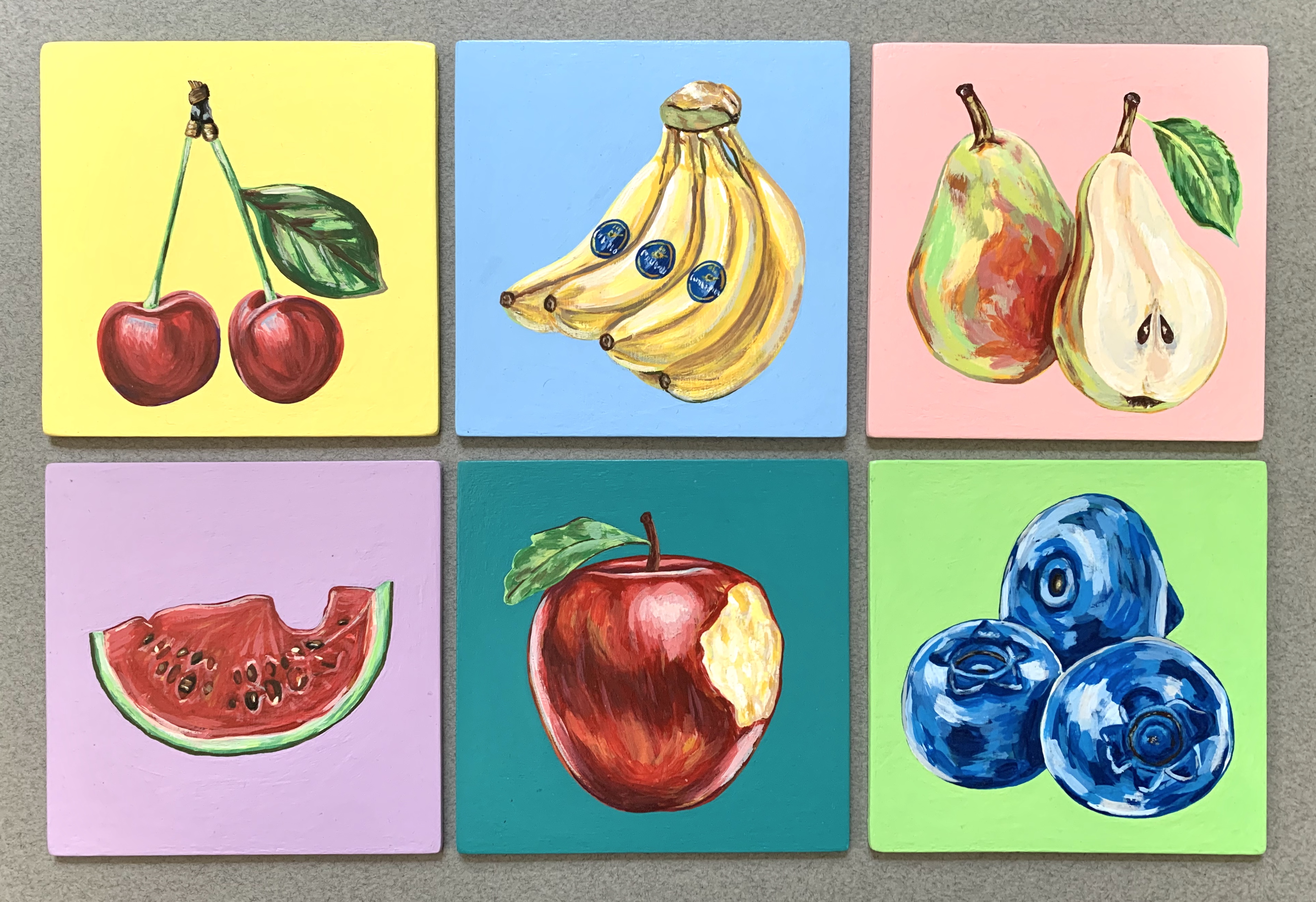 Each fruit is painted on a piece of wood and sprayed with a glossy varnish. I chose the most basic fruit and focused on making them light and vibrant. Before this collection, I had never consecutively made multiple pieces that cohered together. This project tested my ability to stay motivated over the course of months on a project that has the same base similarities.