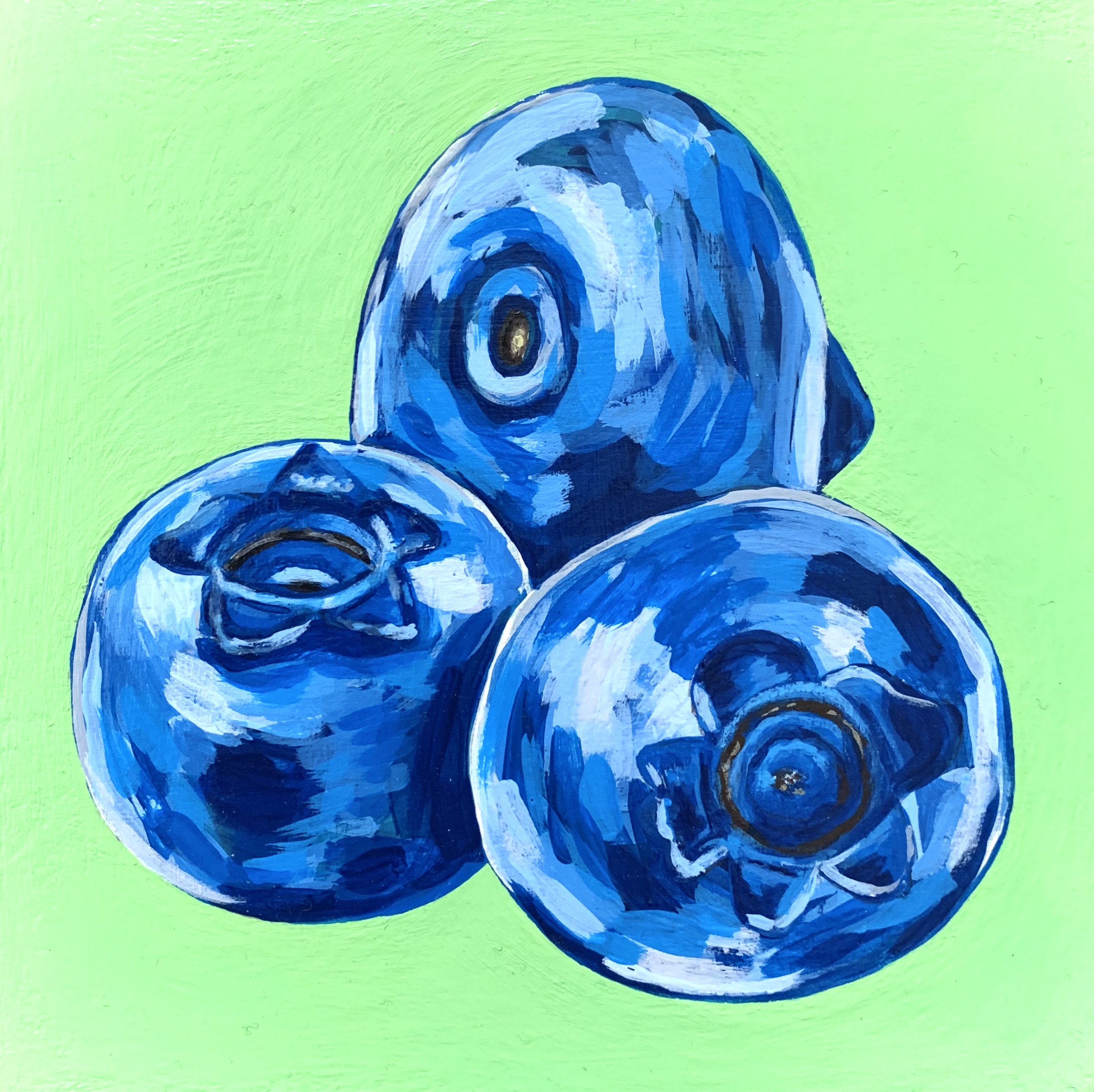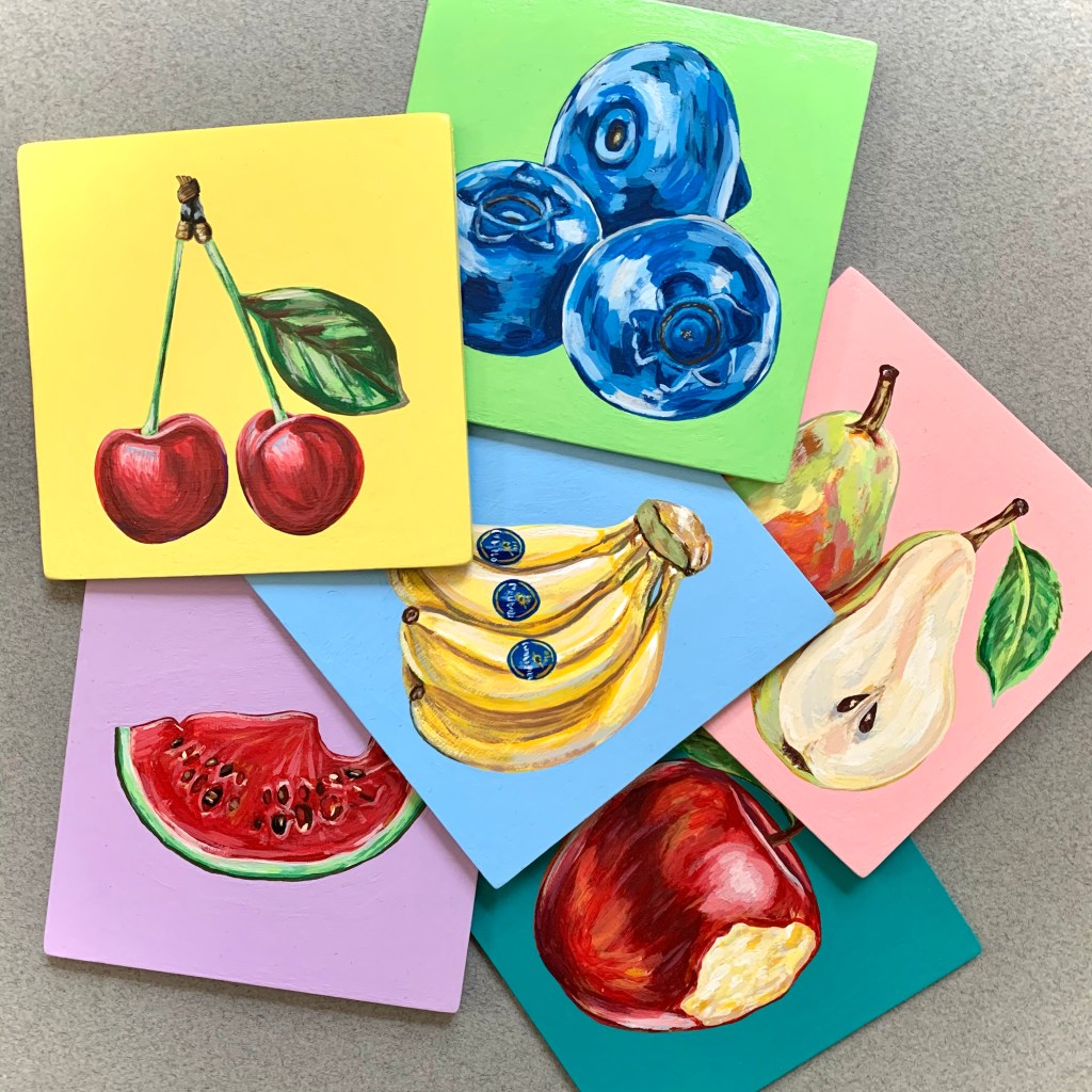 July 2021-February 2022 – All six acrylic paintings are 4.5″ x 4.5″. The objective was to learn the Impasto painting style while making a collection of work over a series of weeks.