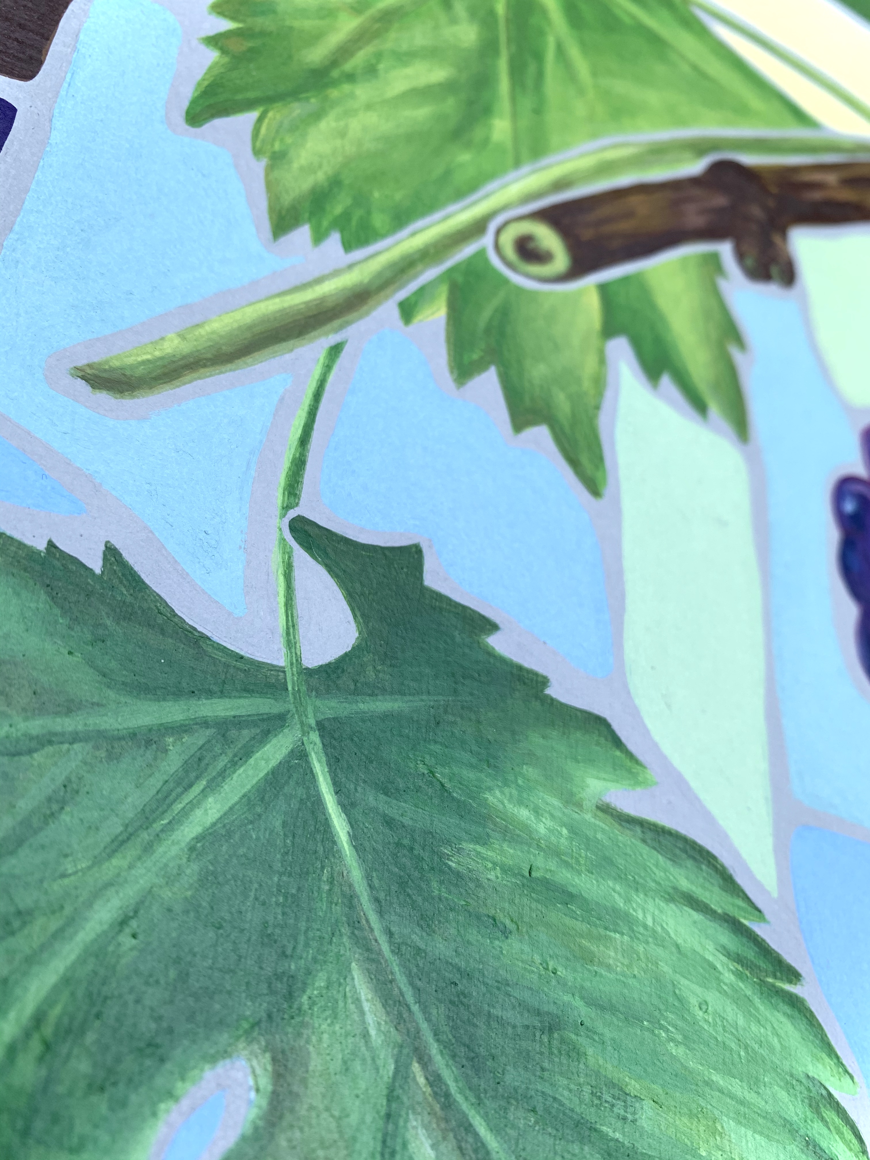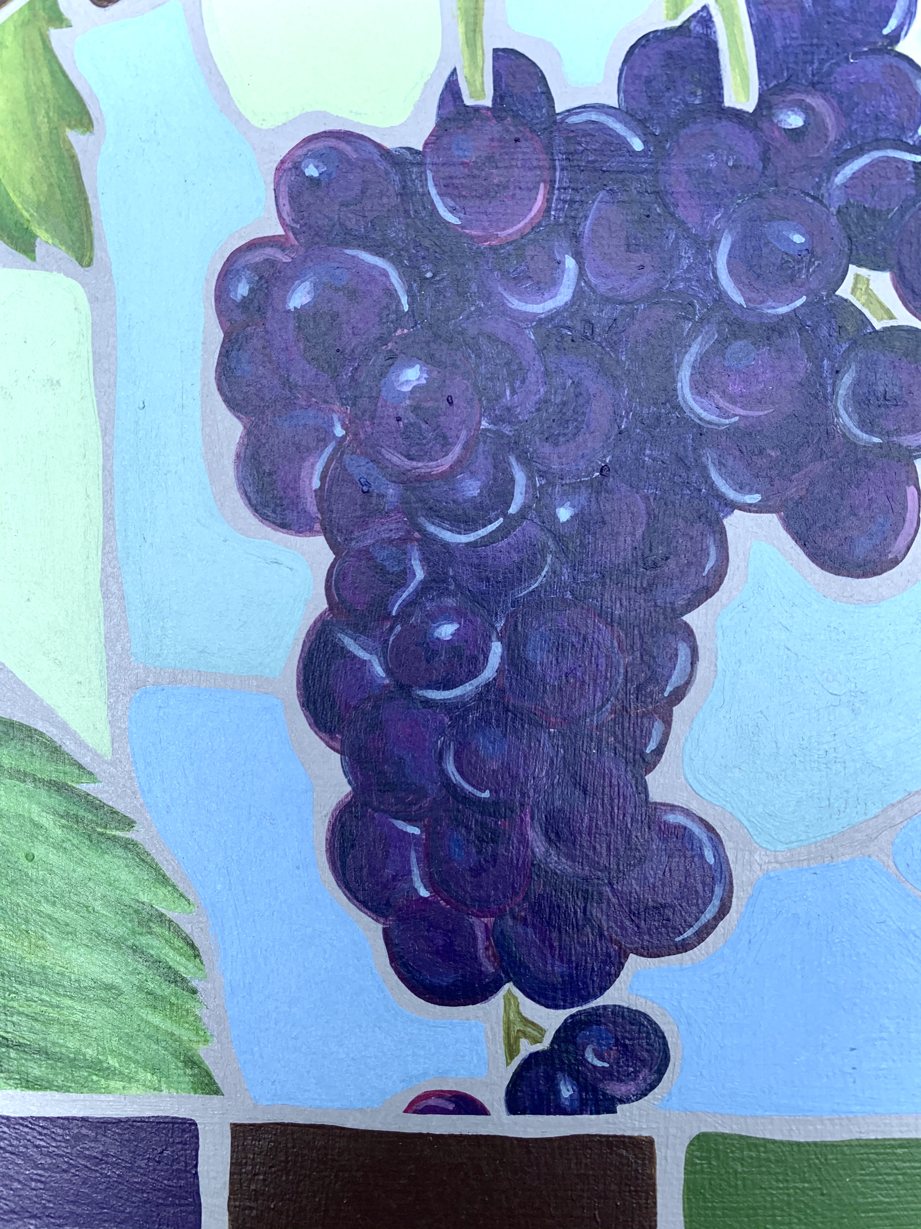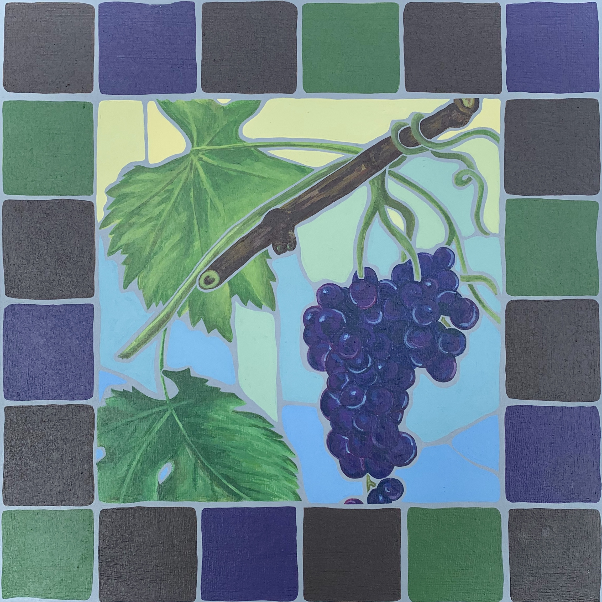 June 23, 2023 – A 12″ x 12″ acrylic painting of a single grapevine. The objective was to experiment with the composition. To try a new style which had the intention of giving a stained glass appearance.