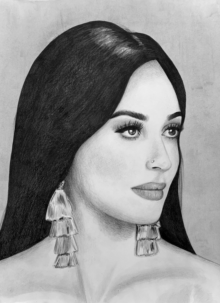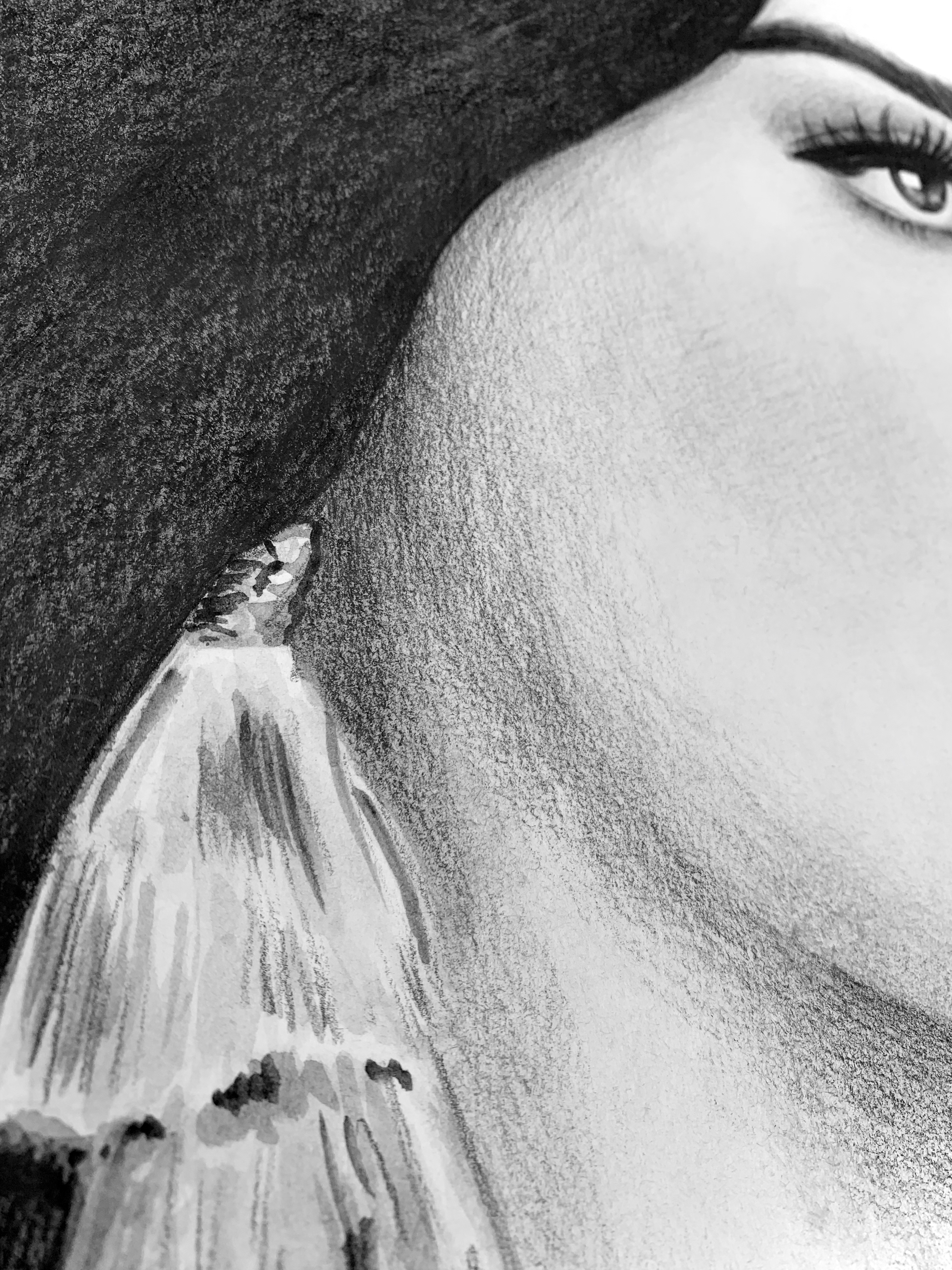 During the time of this painting, I knew that I made very little pieces from watercolor and thought that I should practice more so that I wasn’t so intimidated. I knew that faces were hard in general to draw so I made it a little easier for myself by making the painting B&W. The contrast between the darkest points (hair, eyes) and the lightest (skin) gives the painting a timeless feel and the softness of the background contributes to this as well.