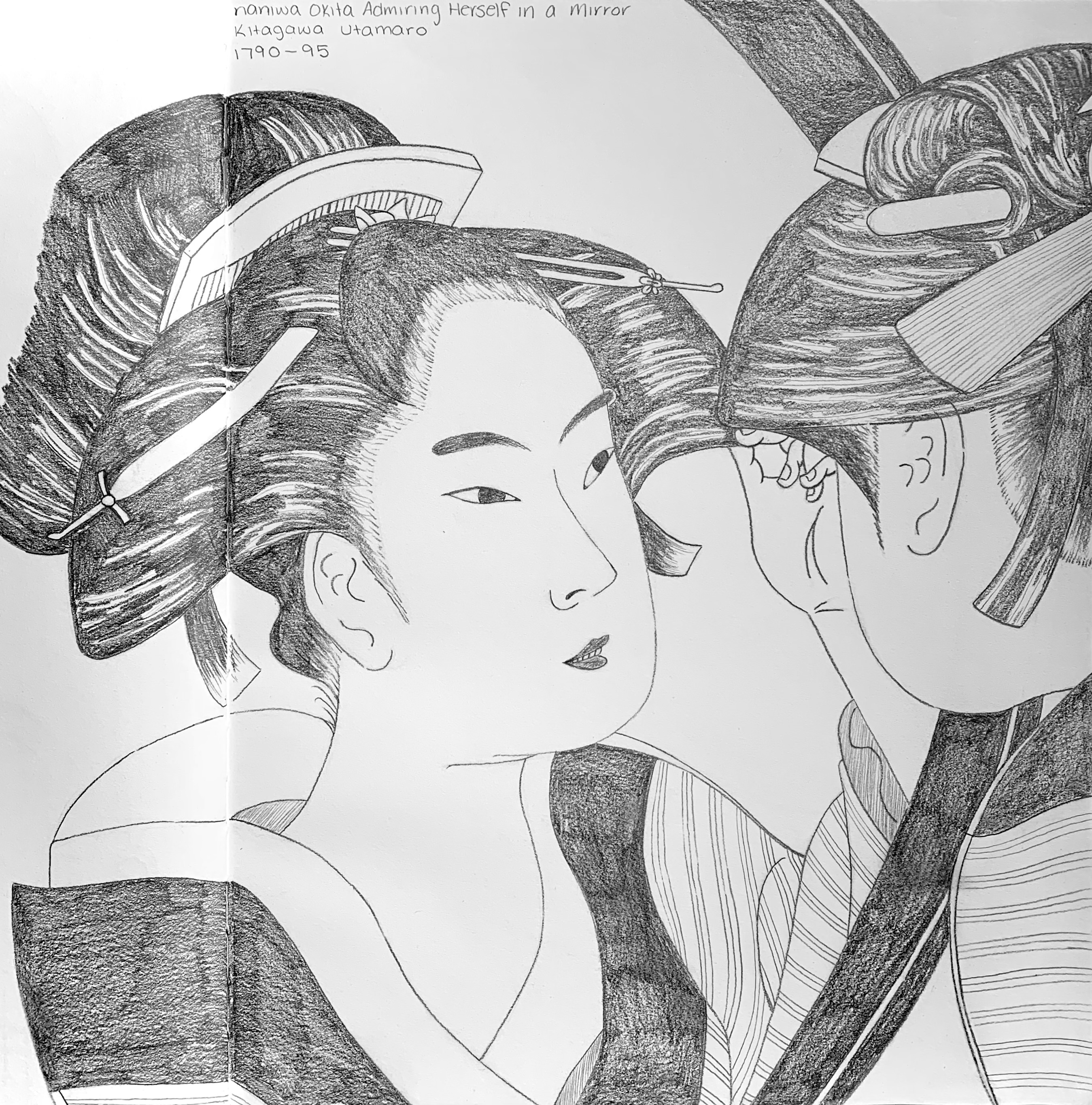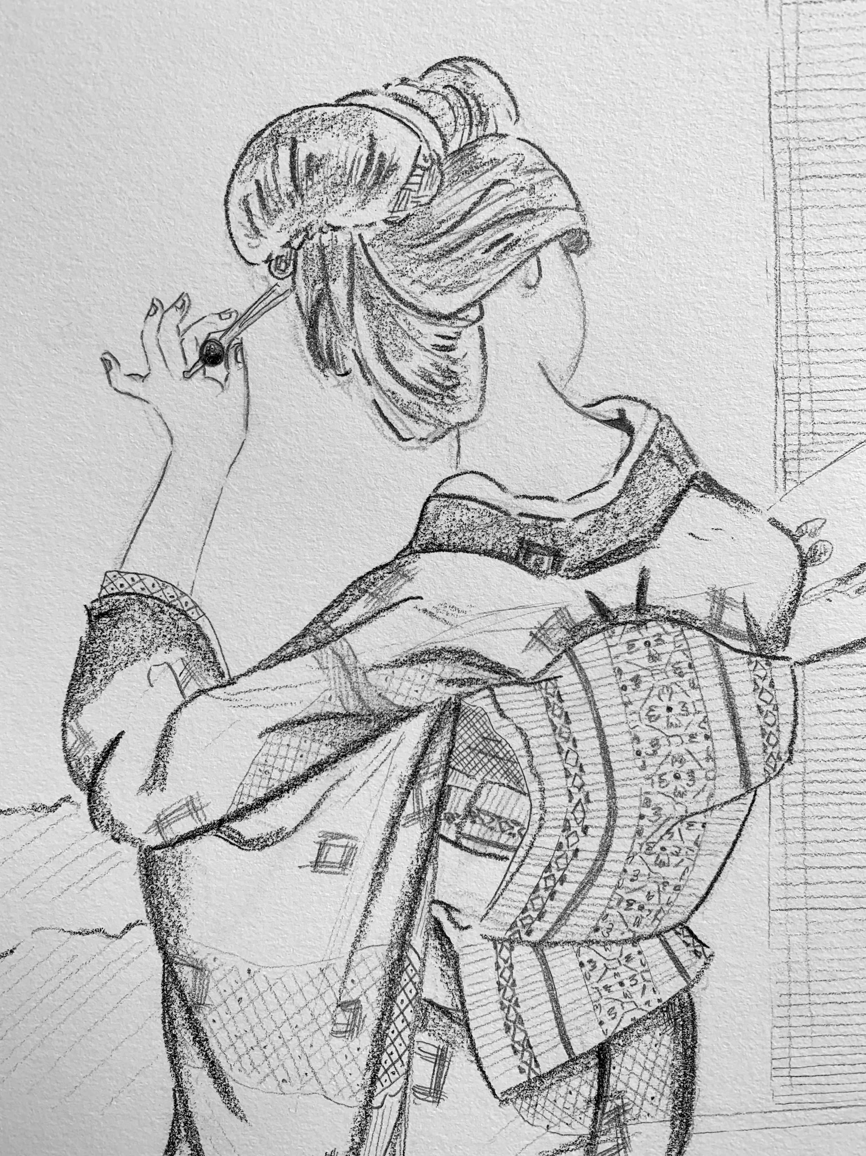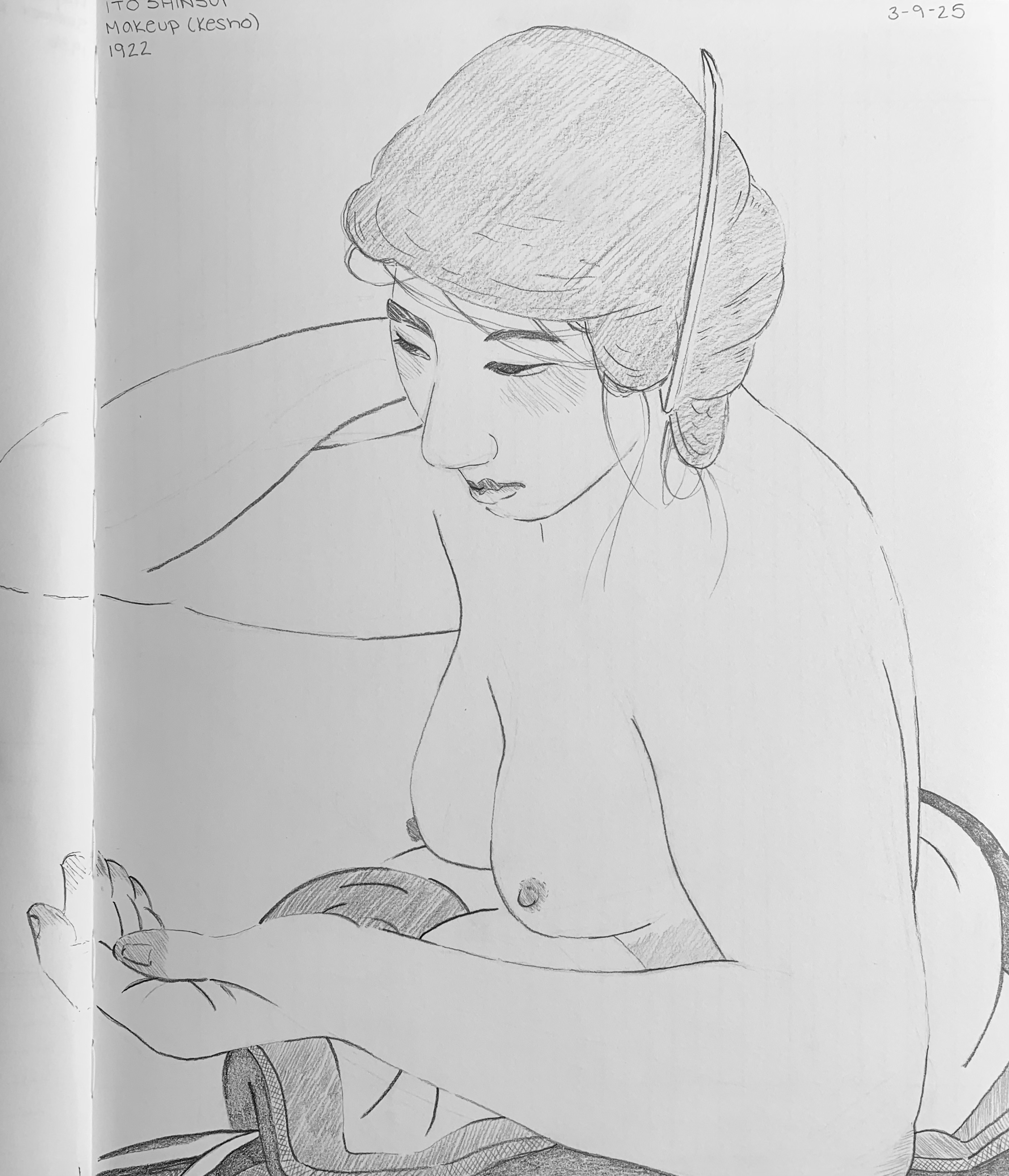 March 7, 2025 – An 11″ x 14″ graphite drawing of a woman pinning up her hair. The objective was to replicate the original woodblock print because I liked the art style used and the extreme detail and care that goes into the woman’s clothing.