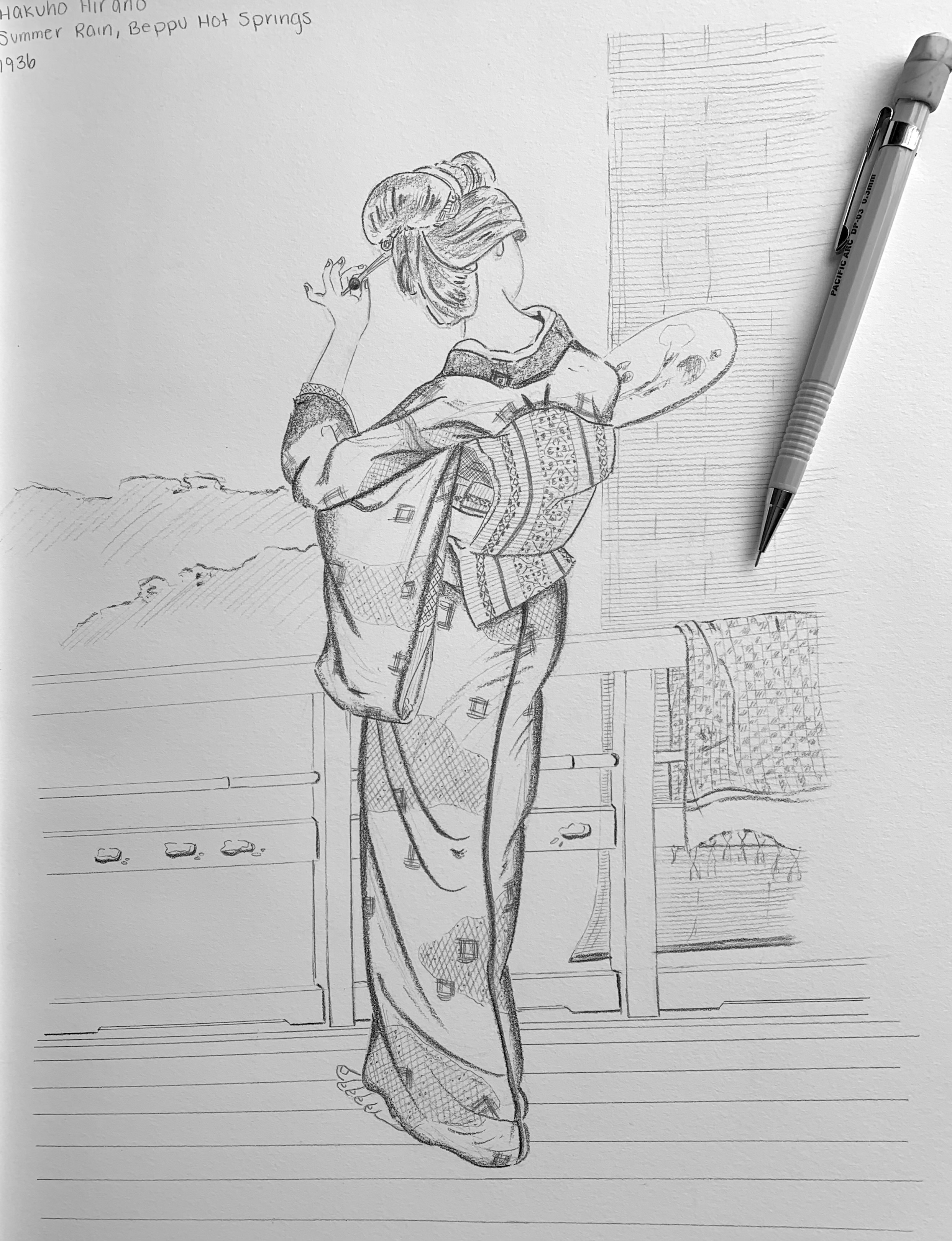 The original artwork I referenced was “Summer Rain, Beppu Hot Springs”, Hakuho Hirano, 1936.