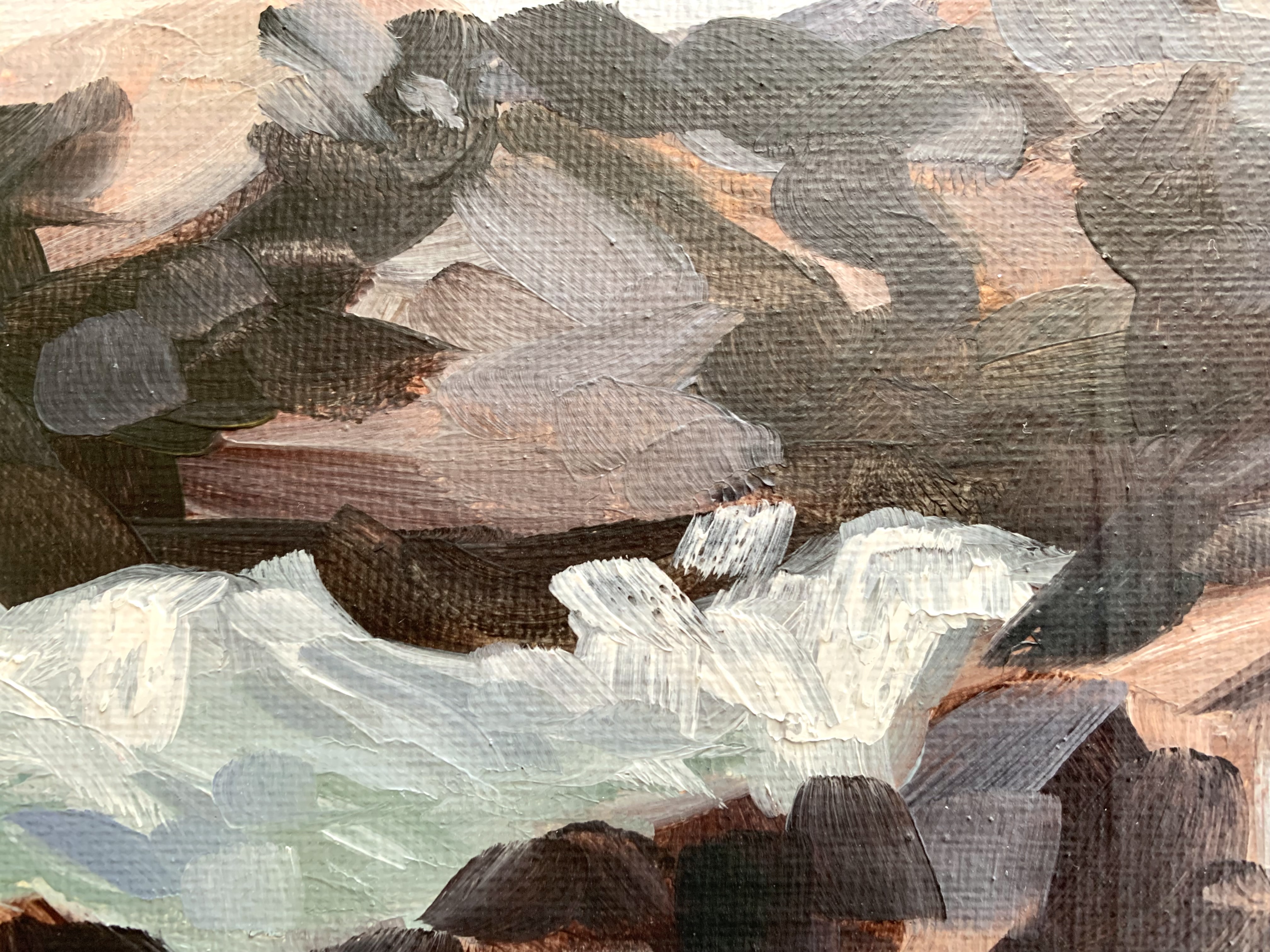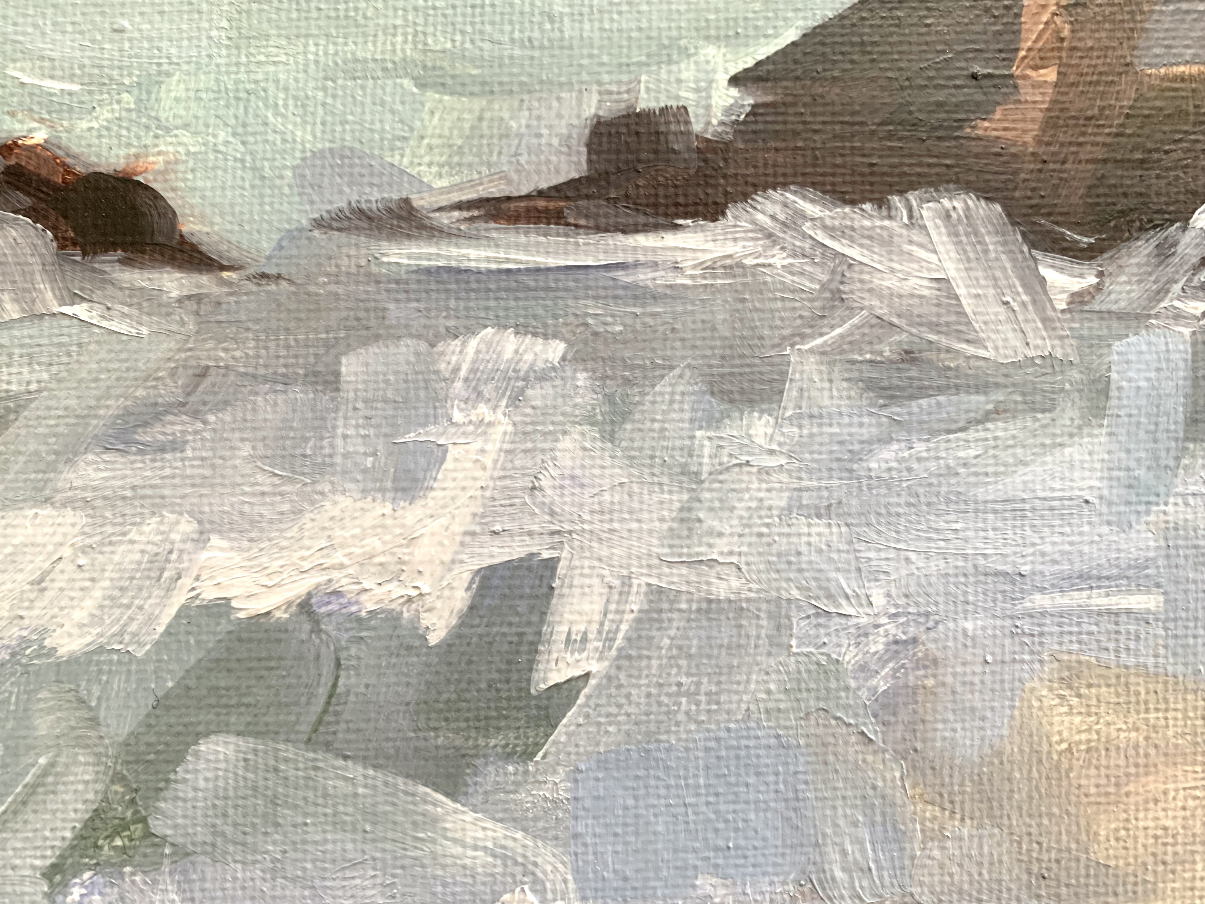 Creating the white water along the shore and dark blue-greens deeper into the ocean helped create depth and motion. My goals were to create a perspective and use space in a way that doesn’t make your eyes go to the center or flow off the canvas.