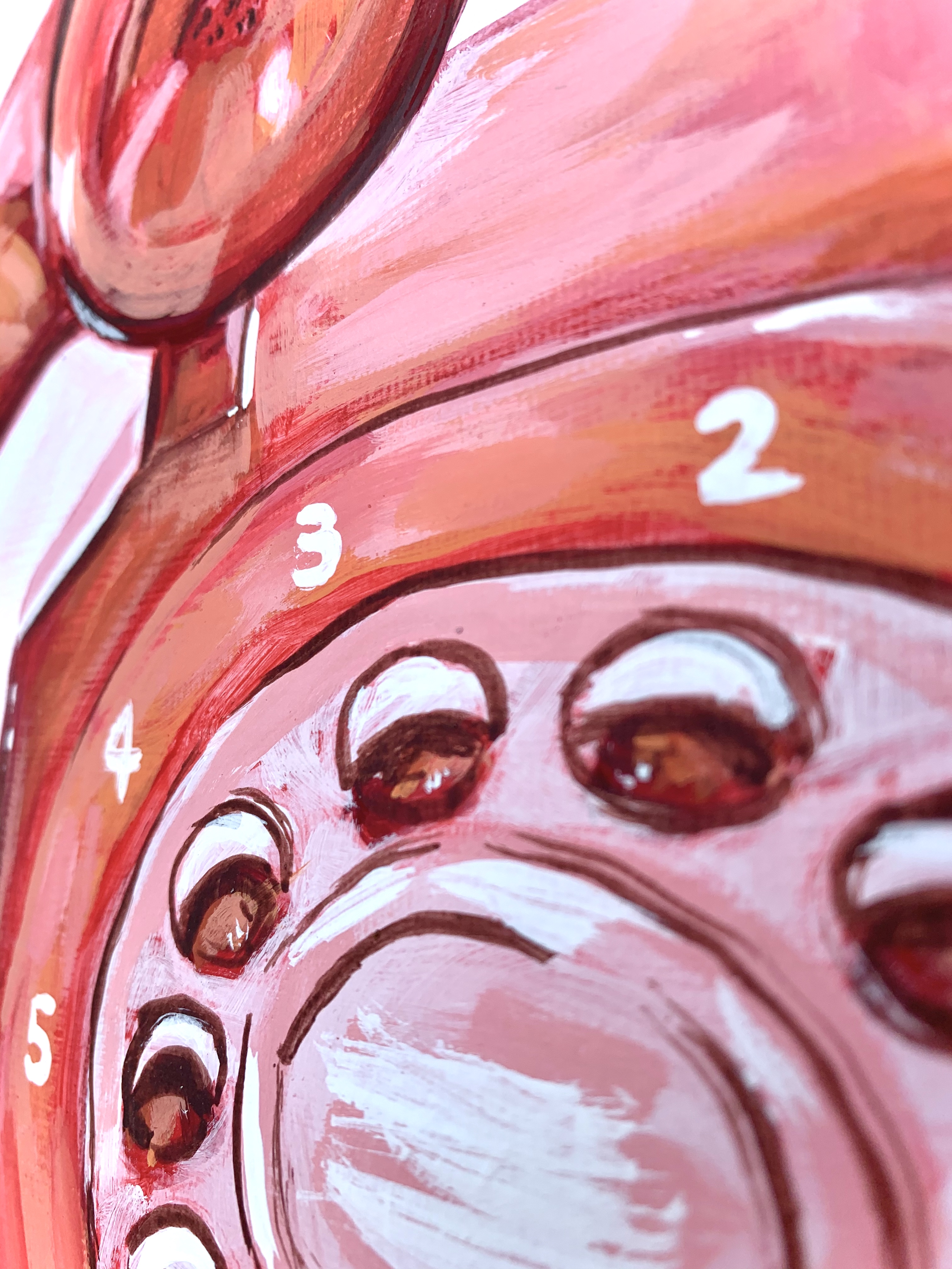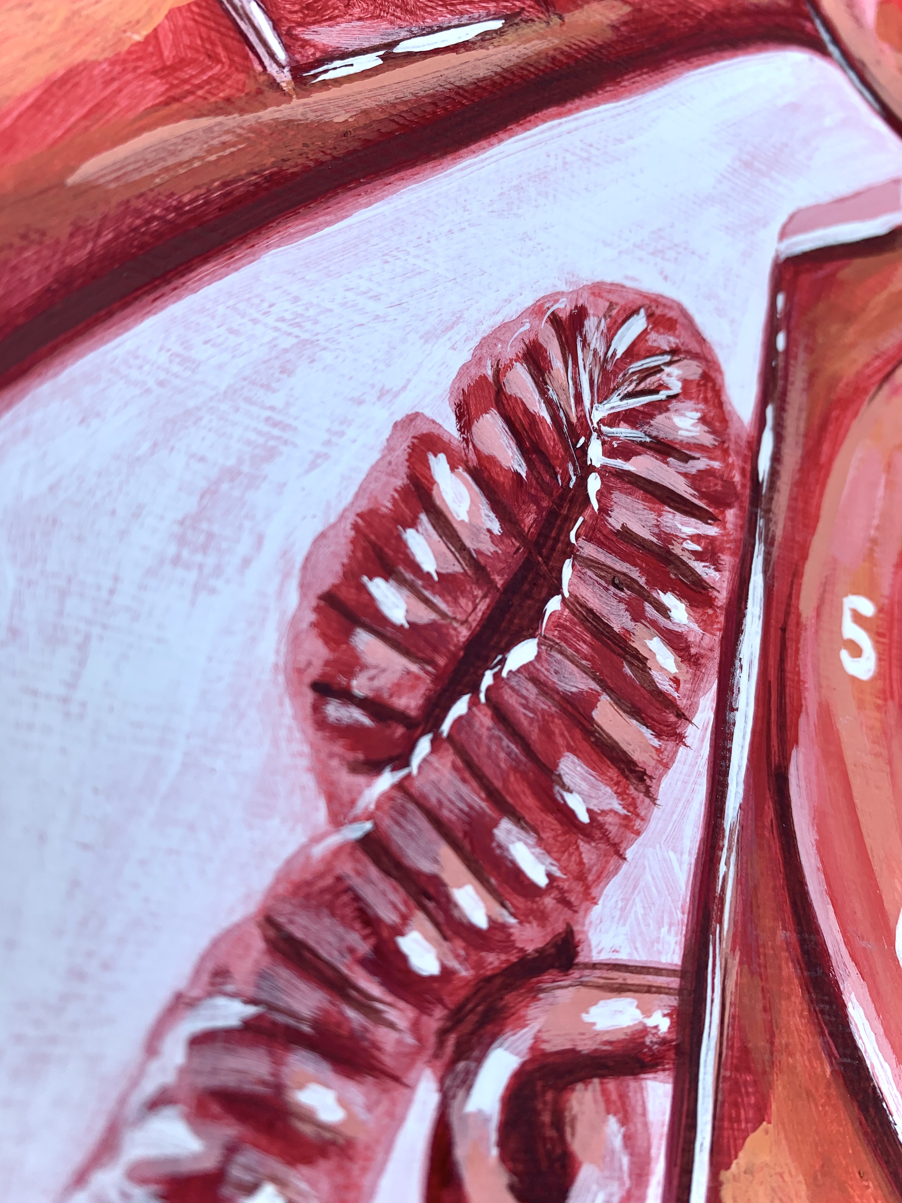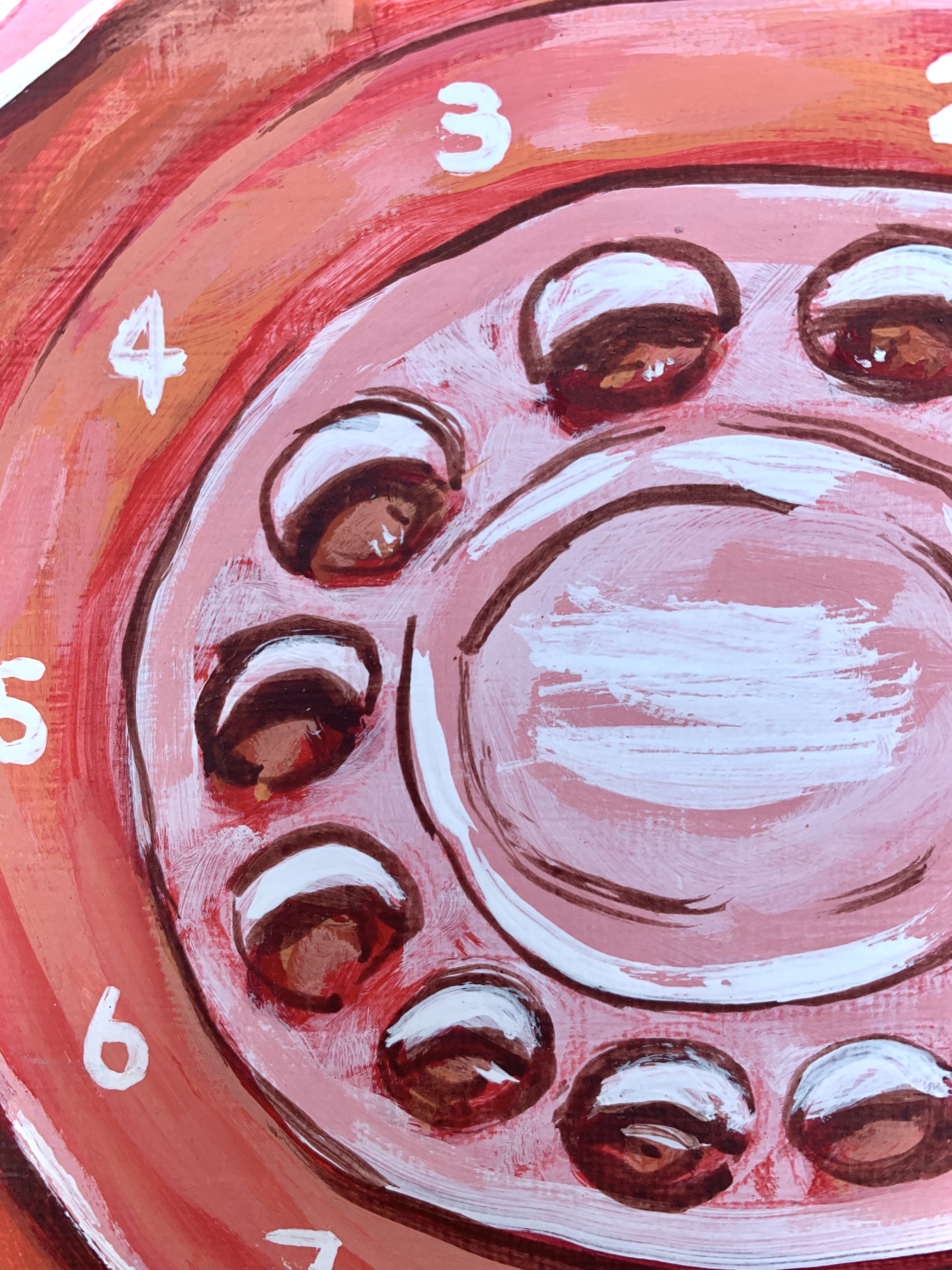 Primarily focusing on the color red with the exception of mixing colors such as yellow, white, and purple to create tints and hues. Understanding the perspective and making sure that the rotary dial and handphone match. Having the background not be a solid white creates a vintage and handmade look that gives character to the telephone.