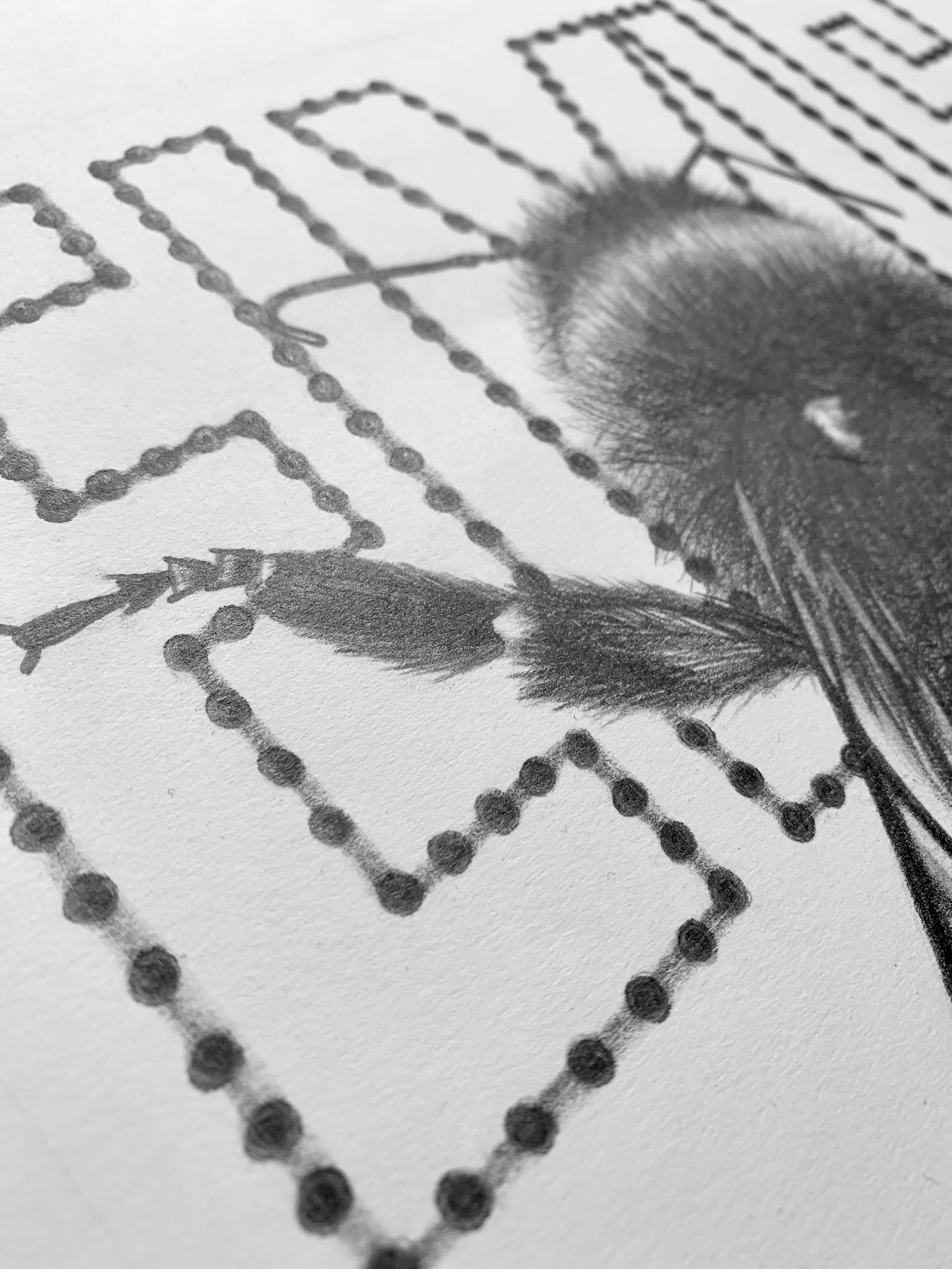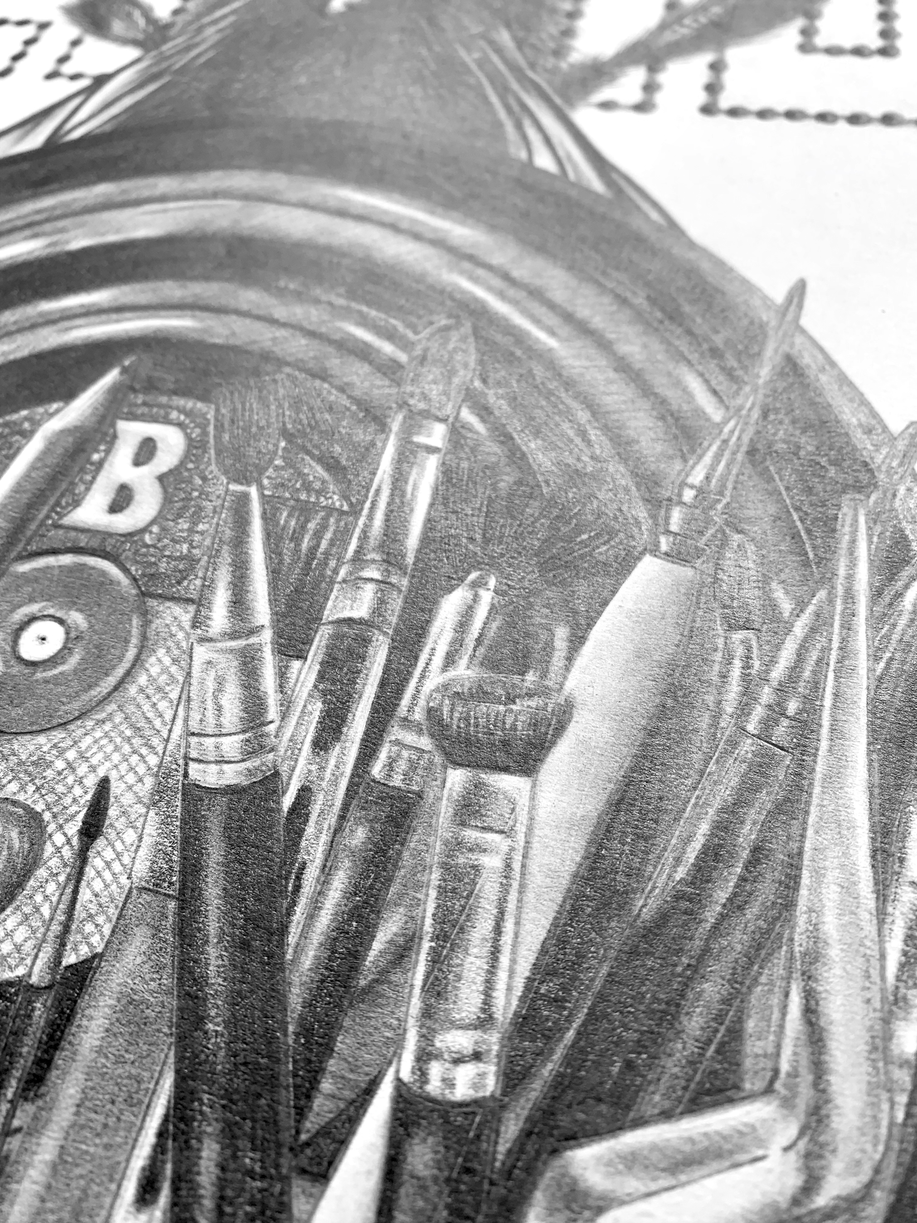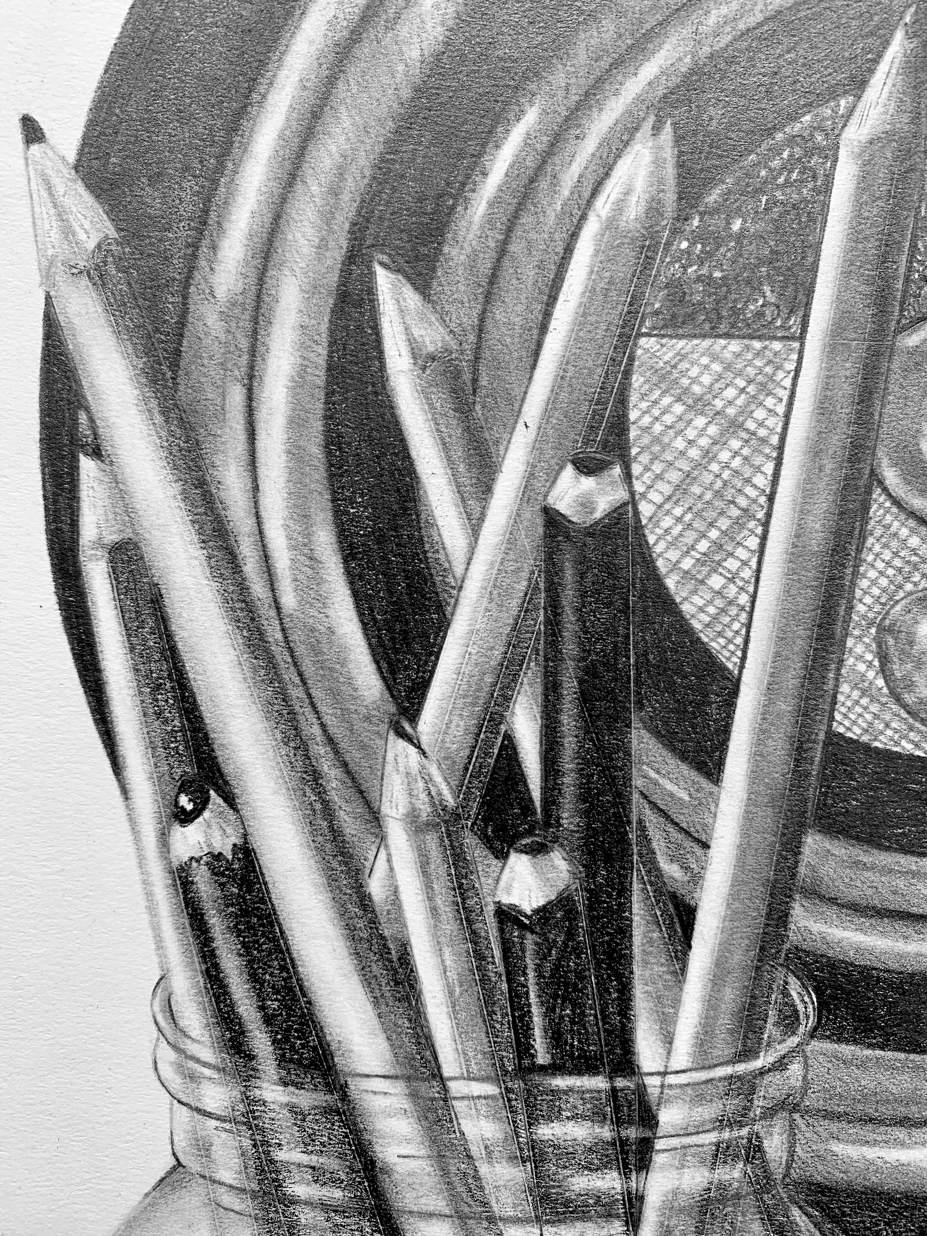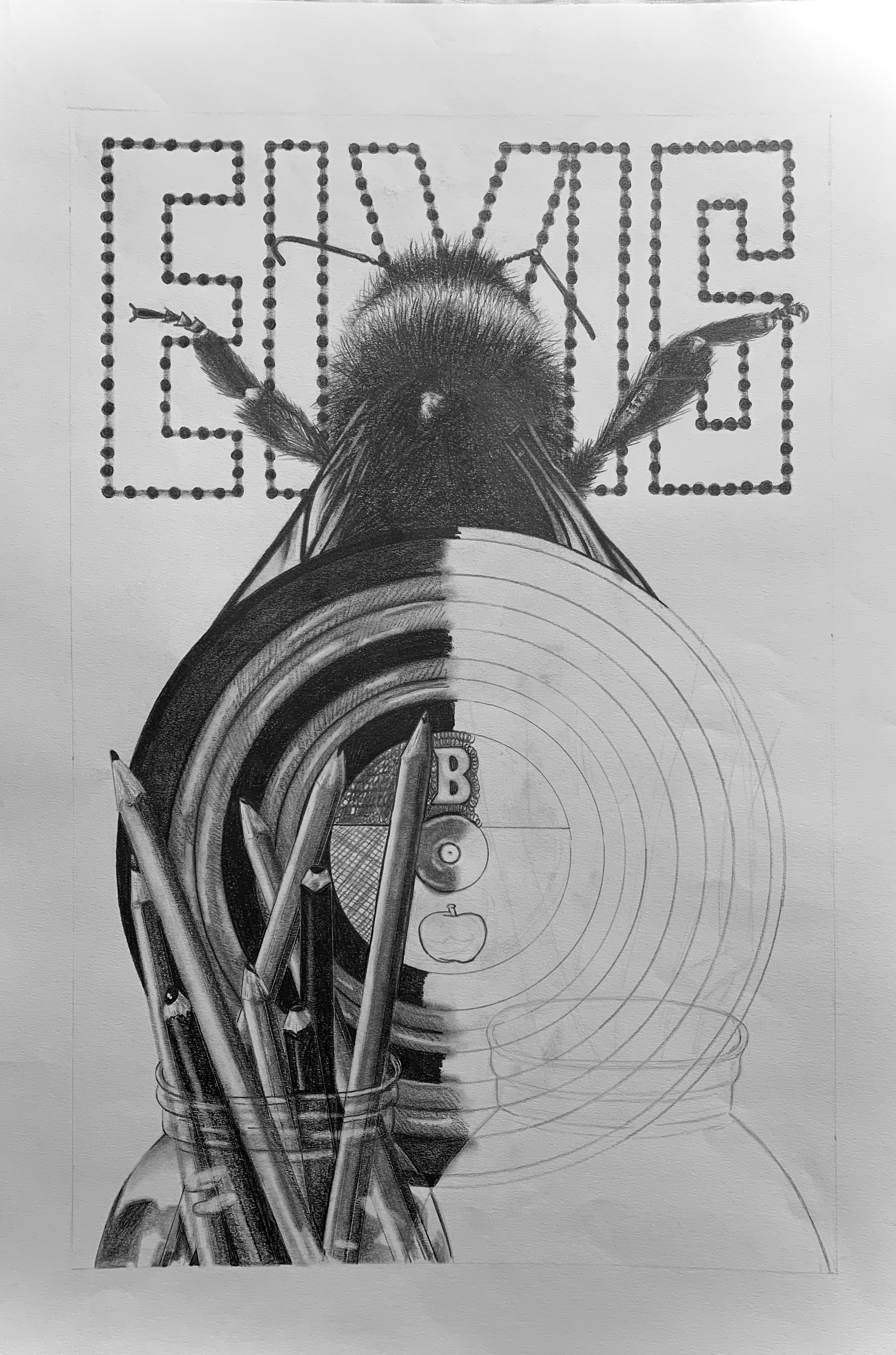 The highlights in the jars create a 3 dimensional allusion while the contrast between black and white creates a visual impact. Details such as the bumblebee’s hair and the individual dots on the ELVIS sign make the drawing come to life.