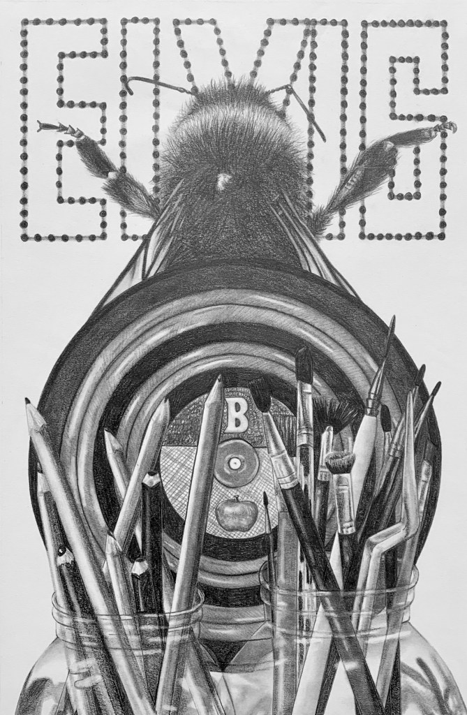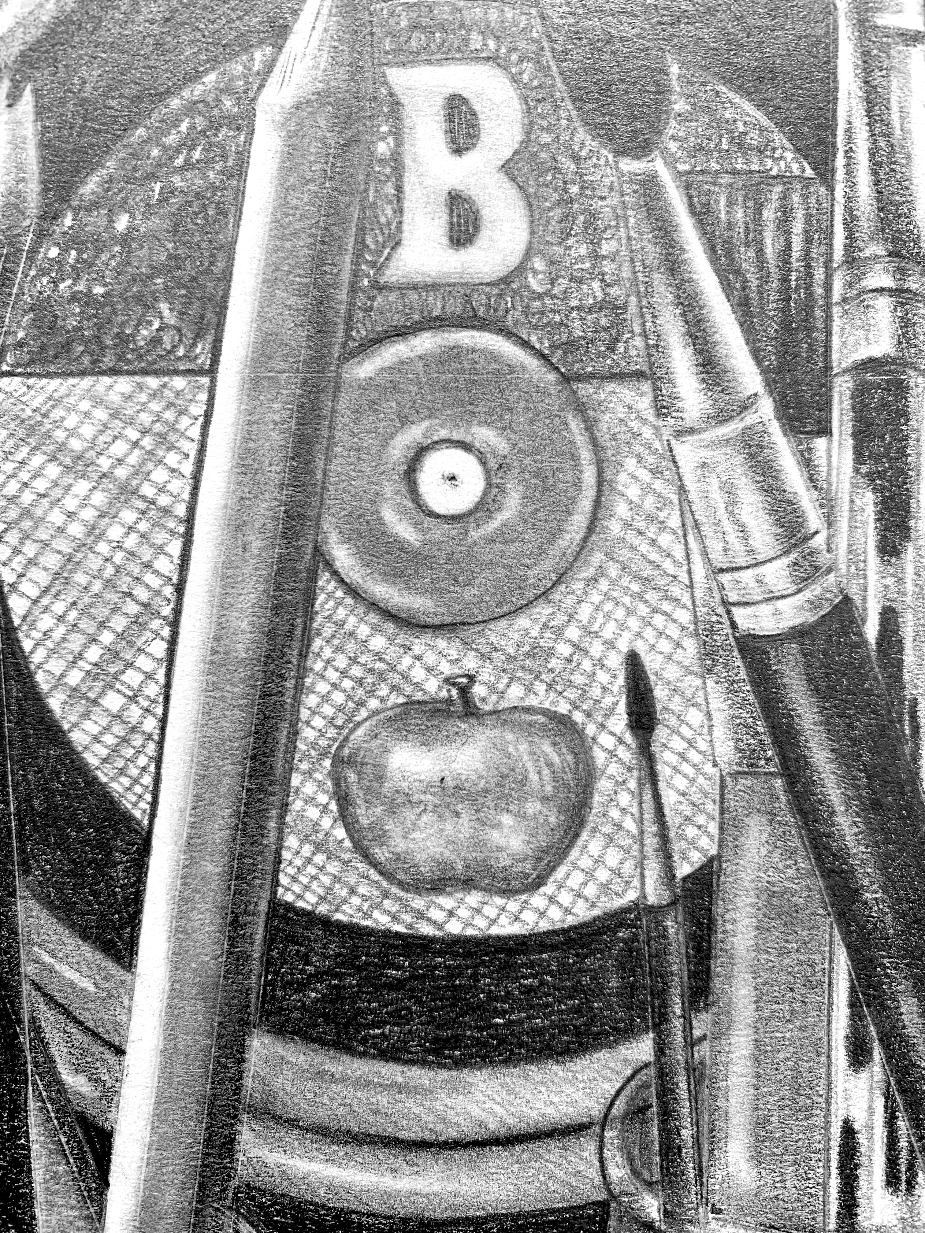 August 18, 2022 – A 12″ x 18″ graphite drawing of multiple elements that describe who I am. Collaged hobbies, interests, and some of my favorite things into one piece. I wanted the audience to look at this drawing a get a sense of who I was despite not knowing me. The elements in this drawing are: