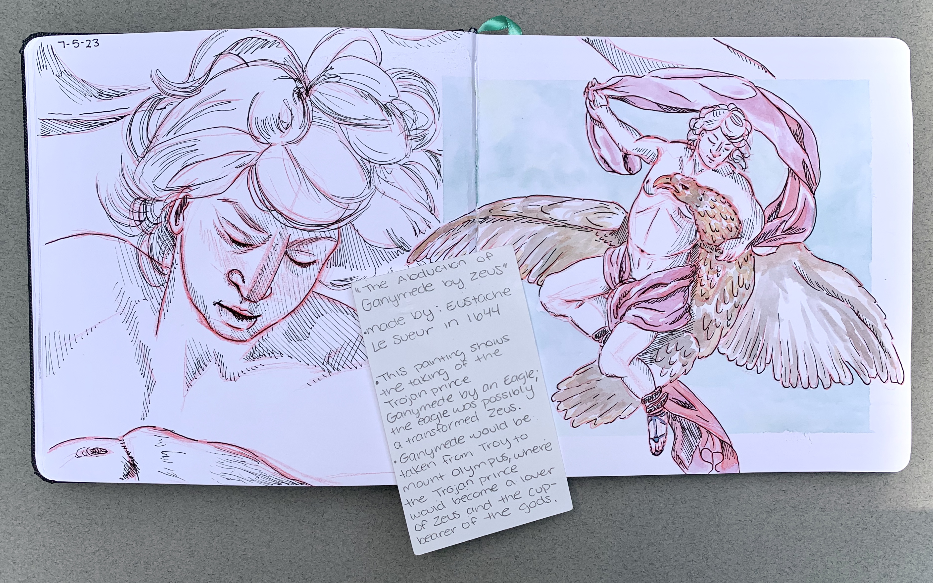 I made this sketchbook spread with an interest in Greek mythology and the realistic style that they were painted in. I had finished the right page of the spread first but disliked Ganymedes face so I then did a close-up version on the left page.
