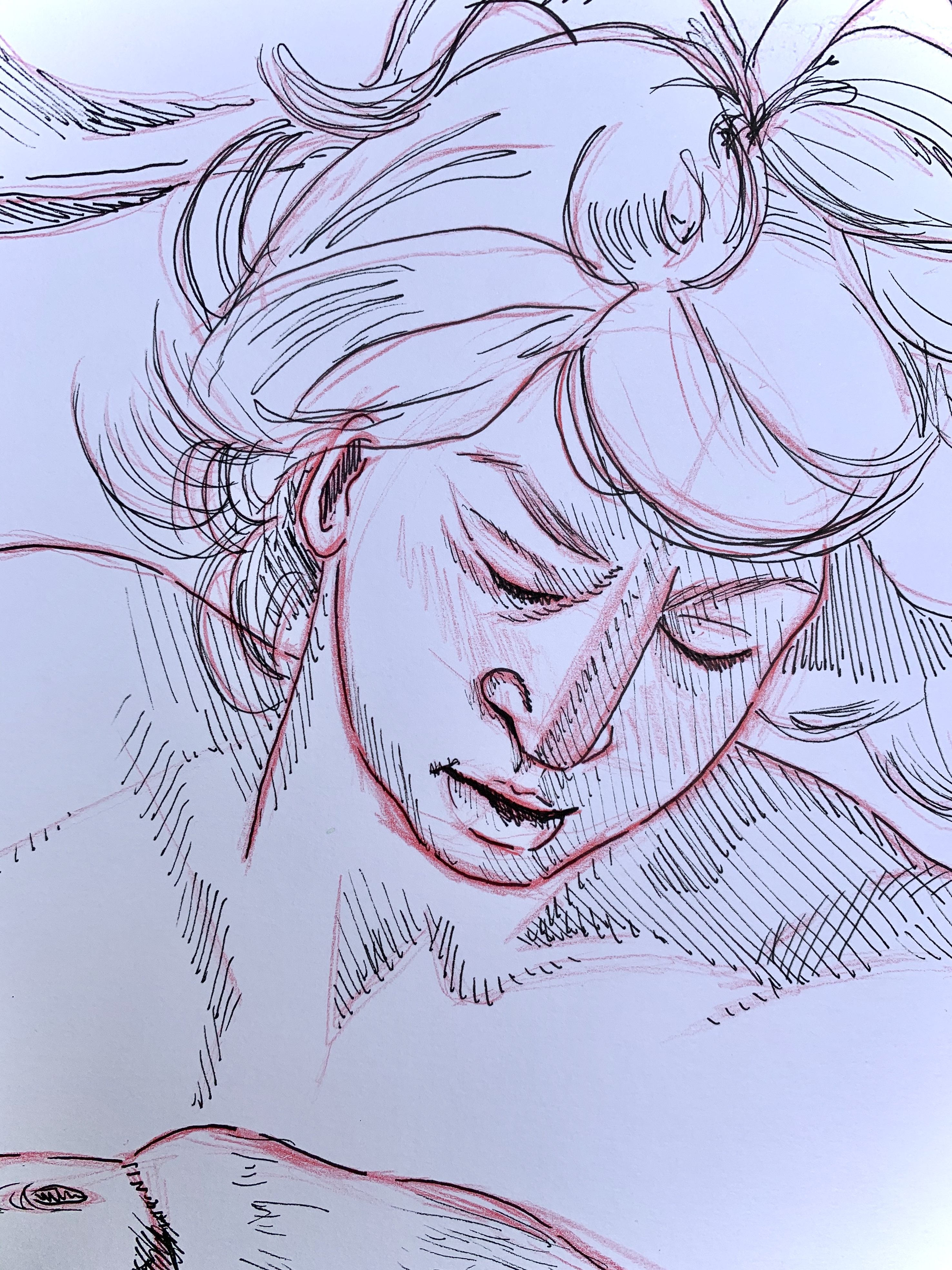 August 5, 2023 – A mixed-media piece that uses watercolor and ink. The objective was to practice figure drawing and facial proportions.